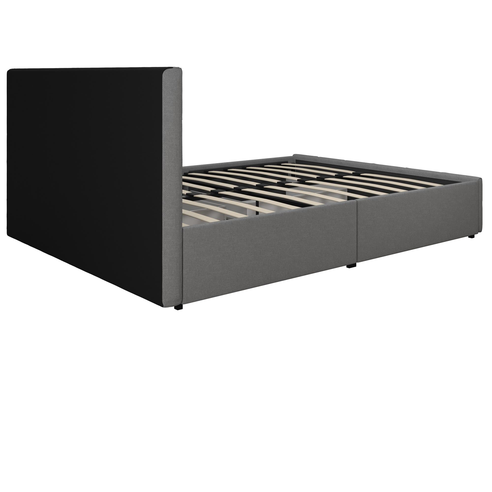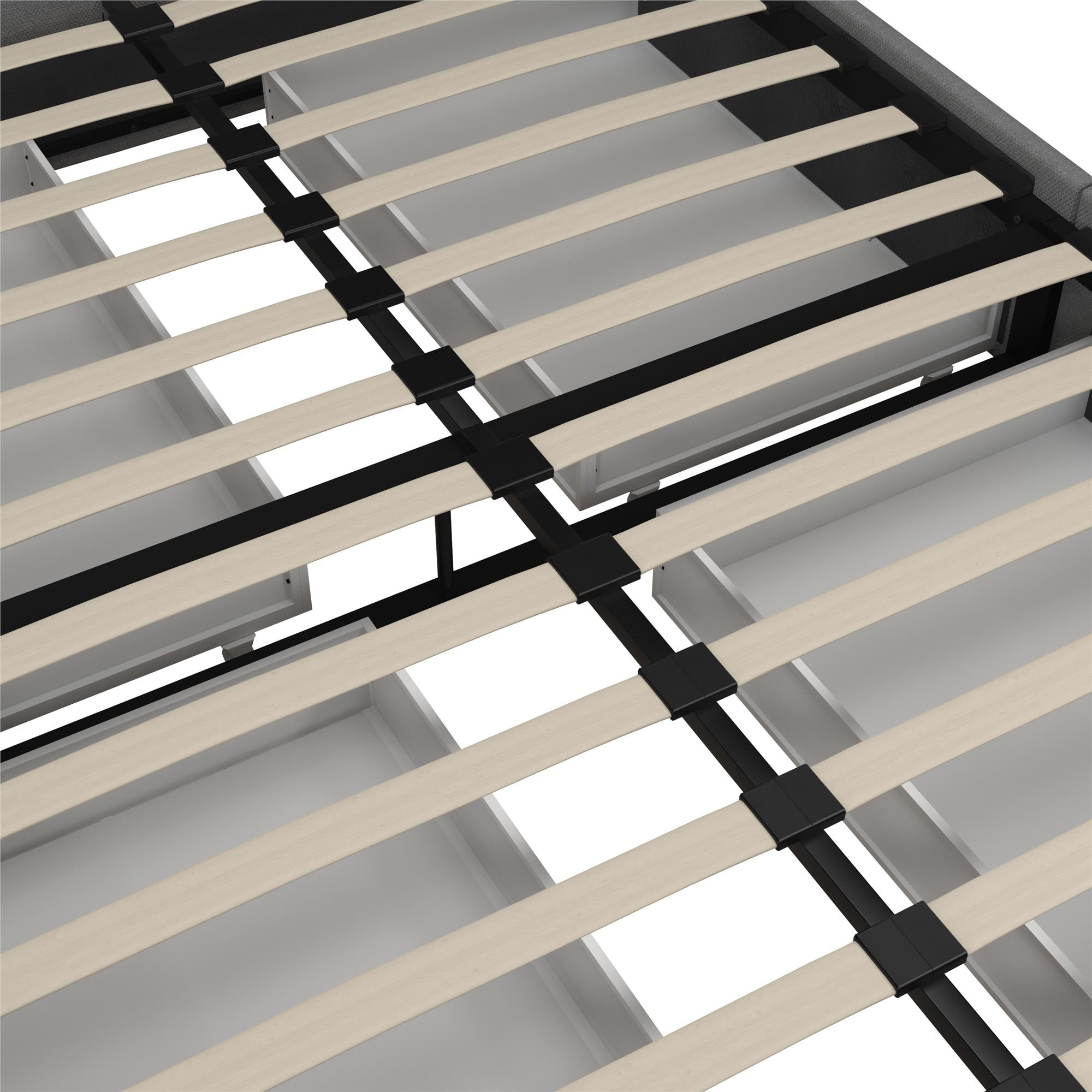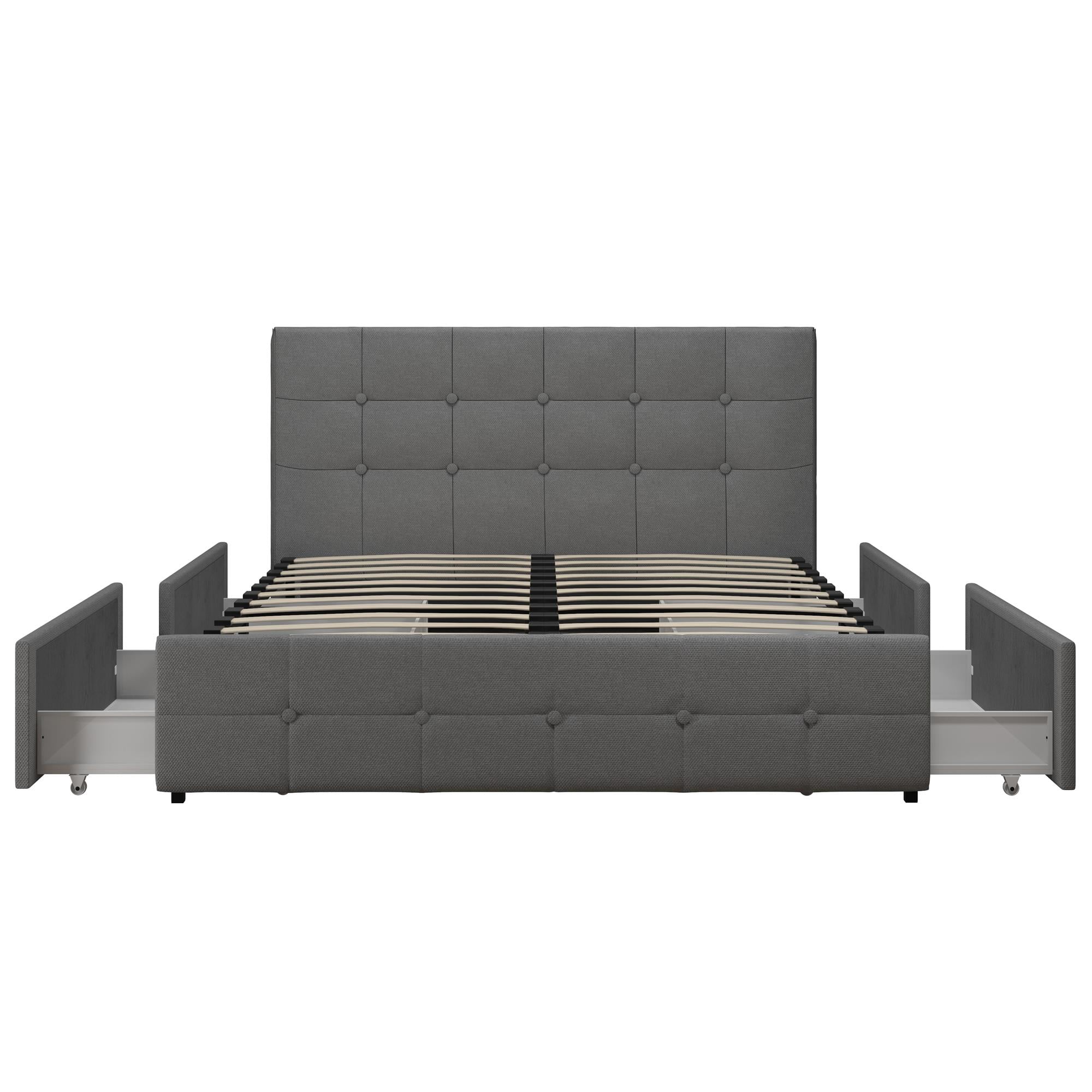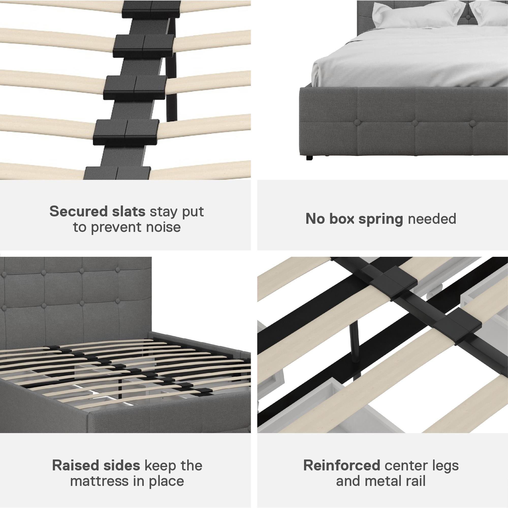 Storage Drawers: Designed to maximize bedroom space, this modern platform bed includes 4 under-bed drawers on wheels for clothes, linen and more. Square button tufted headboard and footboard. Dimensions: 80.5″L x 58.5″W x 38″H. Max weight limit: 450 lbs Stylishly Comfortable: Enjoy a cozy place to rest your head and back thanks to the foam padded headboard extending all the way down to the slats for full back support and no pesky gaps. The raised edges keeps your mattress in place to prevent sliding Sturdy construction: Interior structure made from durable metal and wood create a stable frame supported by center legs and a metal bar for additional strength and reliability. All sides are foam padded for softness and all around protective comfort No Box Spring Needed: Sprung wood slats enhance your mattress’ comfort and longevity by providing optimal support. The replaceable bentwood slats are clipped in place to stay put and offer an excellent foundation for spring, hybrid or foam mattresses