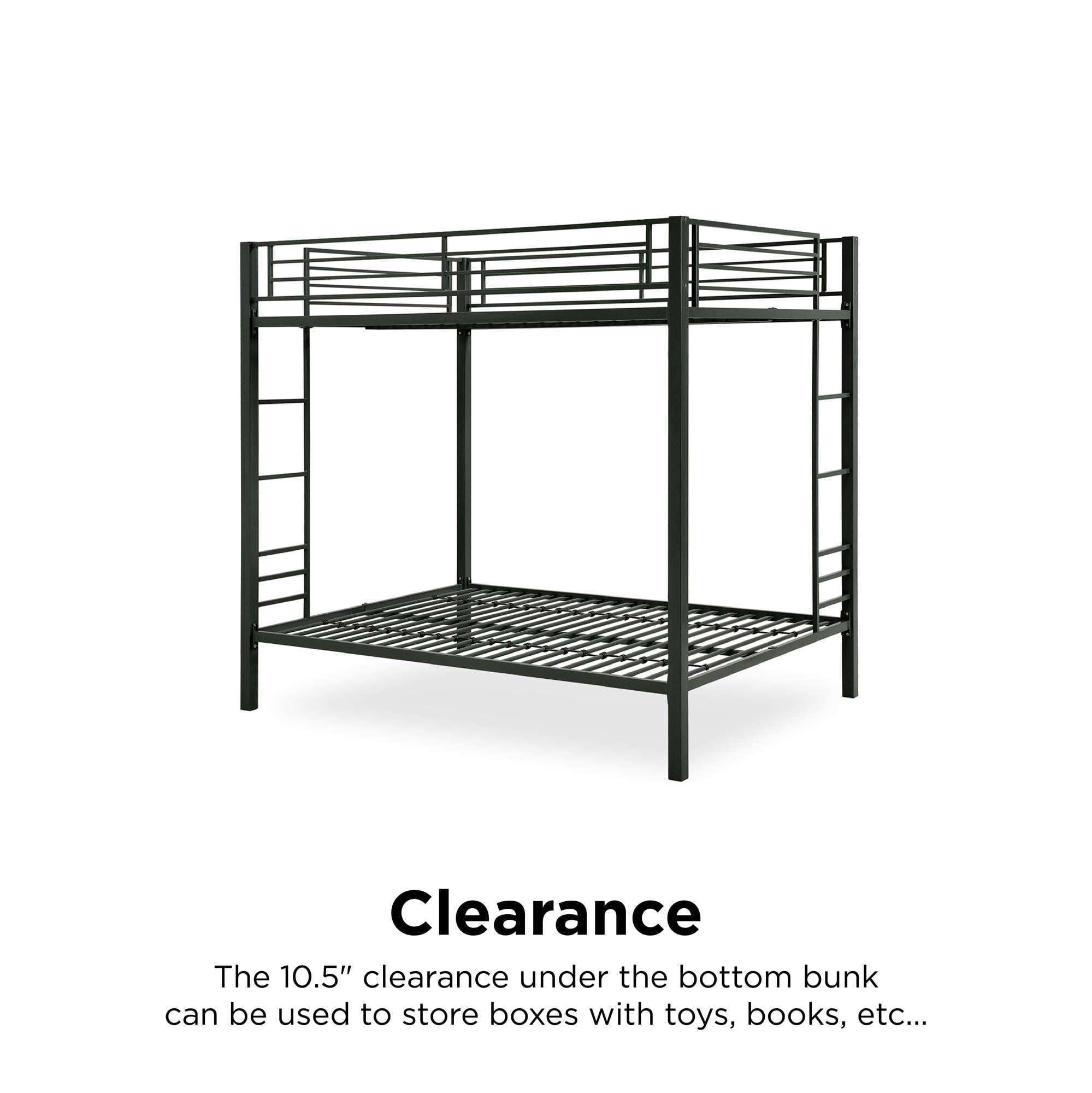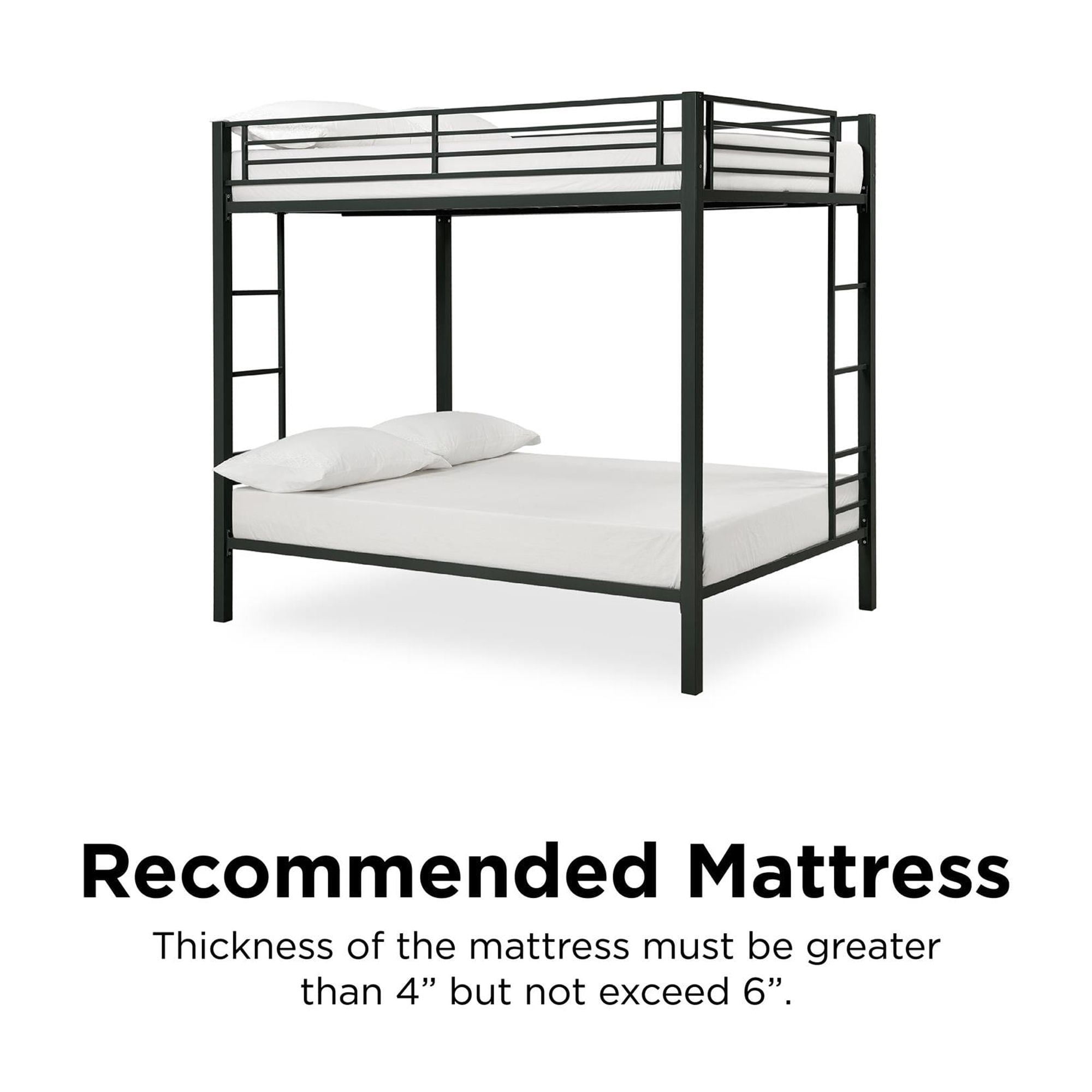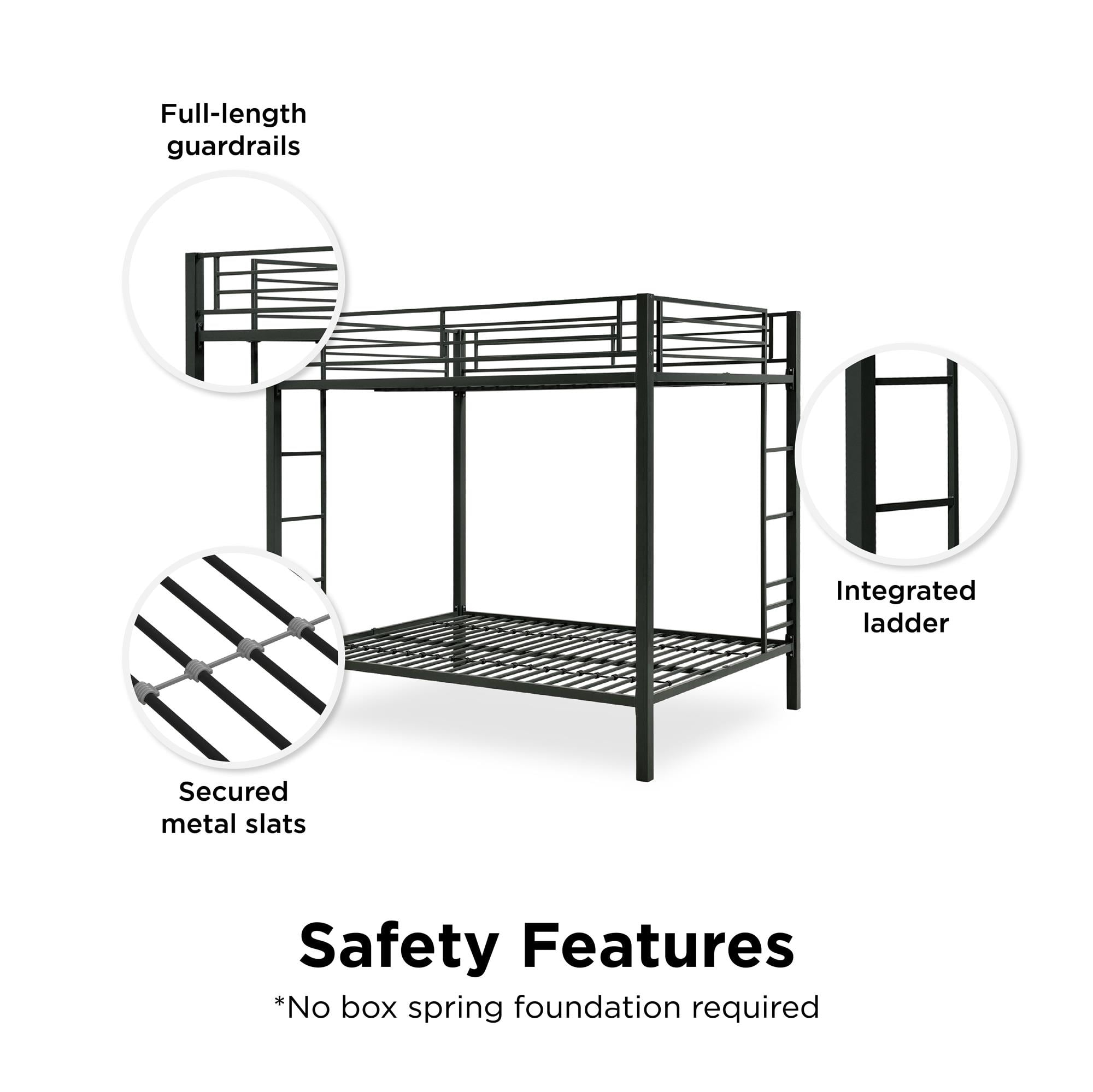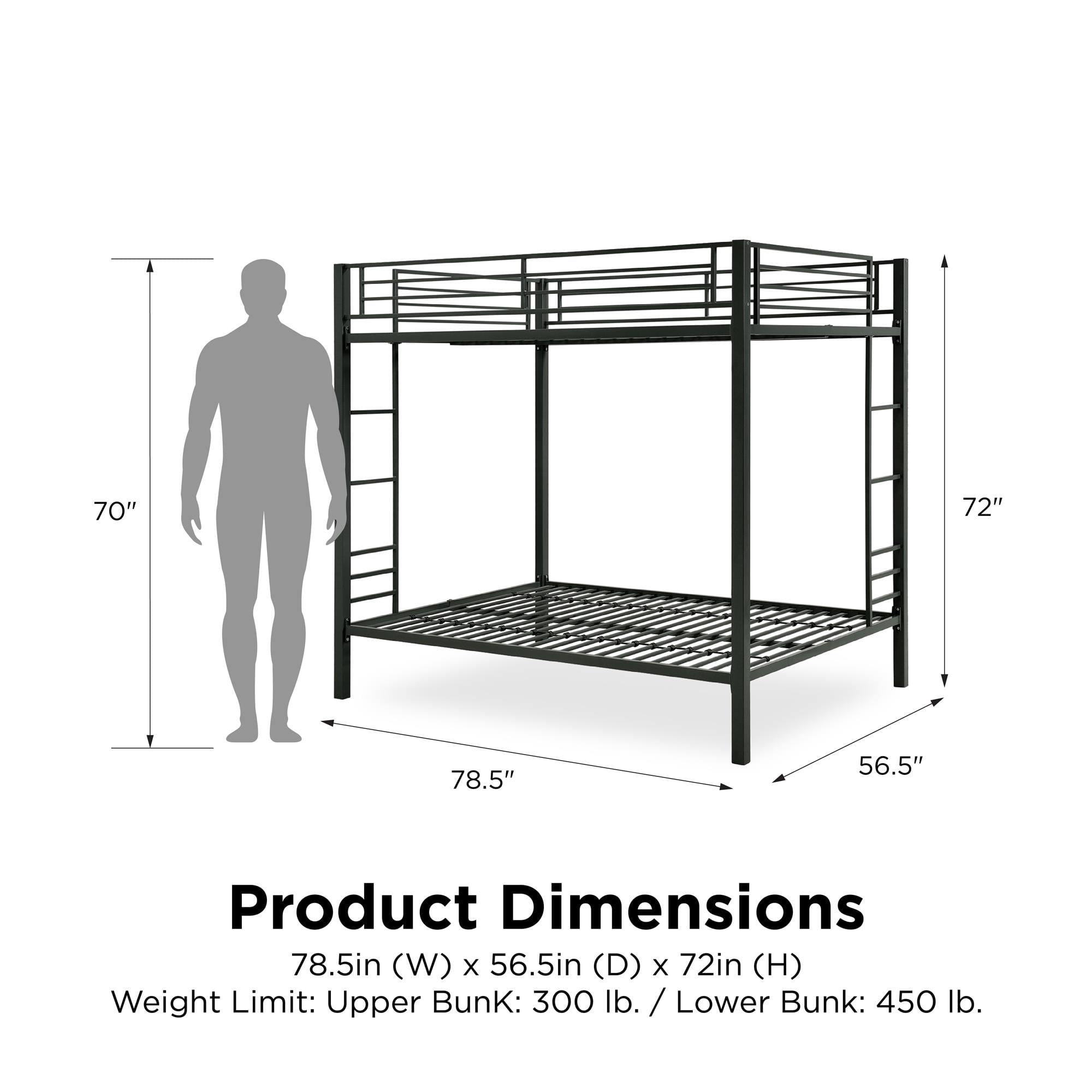 Sturdy, metal frame Includes guard rails on top bunk and integrated ladder Mattress support slats included Accommodates two standard full-size mattresses, 75″ x 54″ (not included) Maximum upper mattress thickness of 6 inches Weight limit for the upper bunk is 300lbs Weight limit for the lower bunk is 450lbs Weight limit for the lower bunk is 450lbs