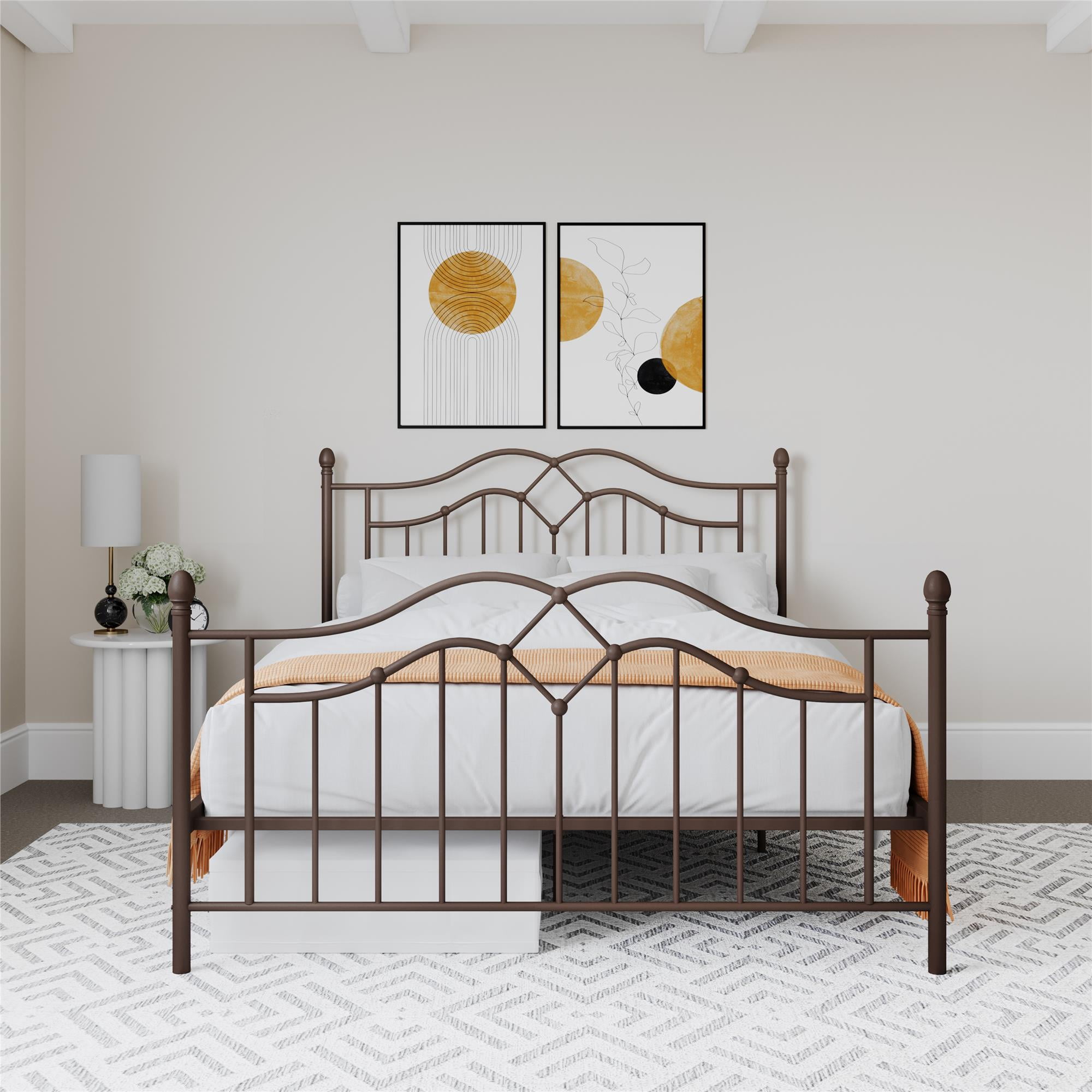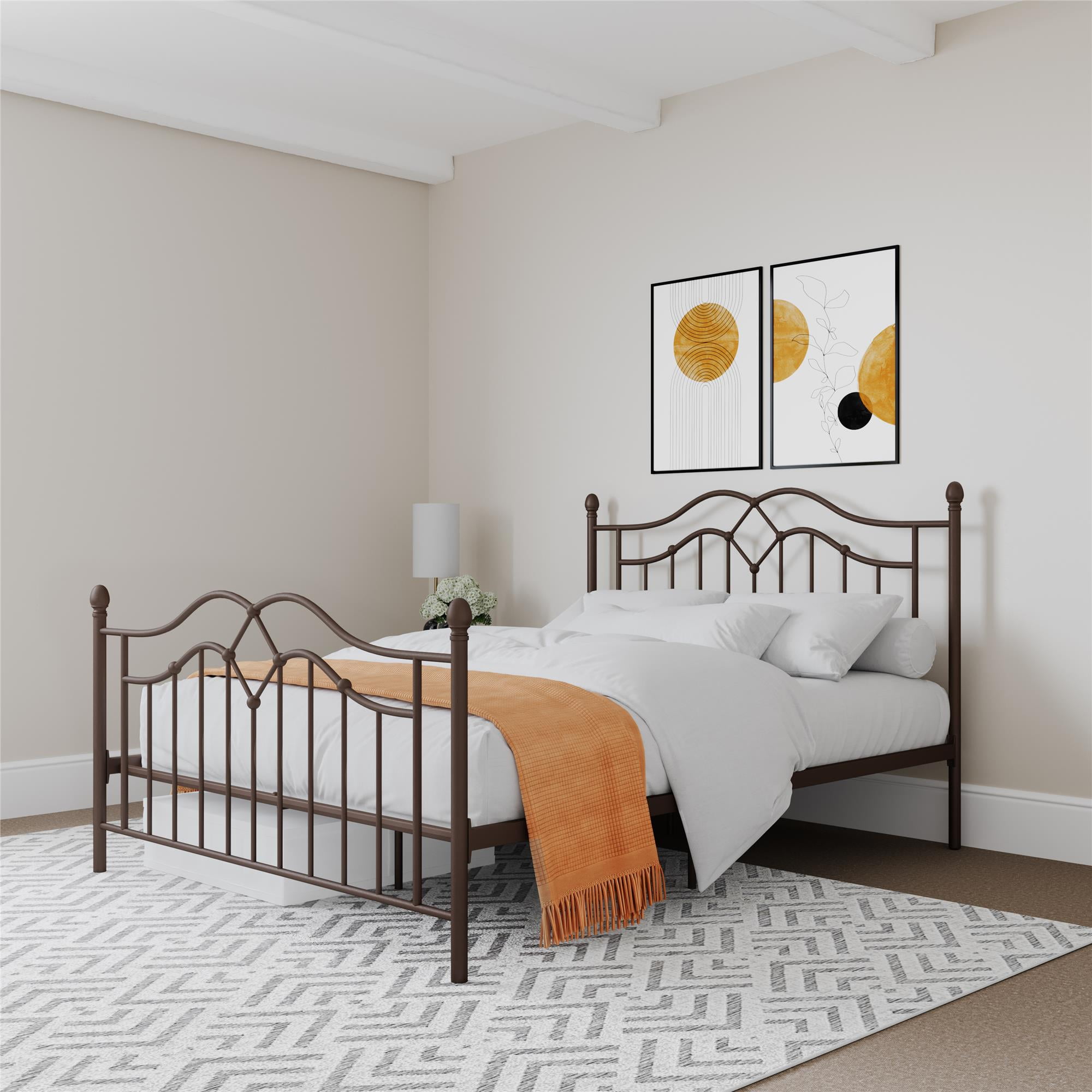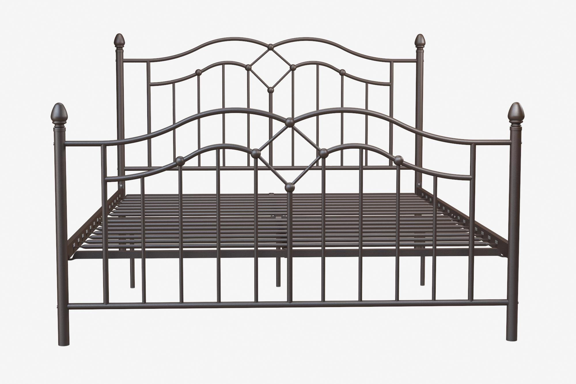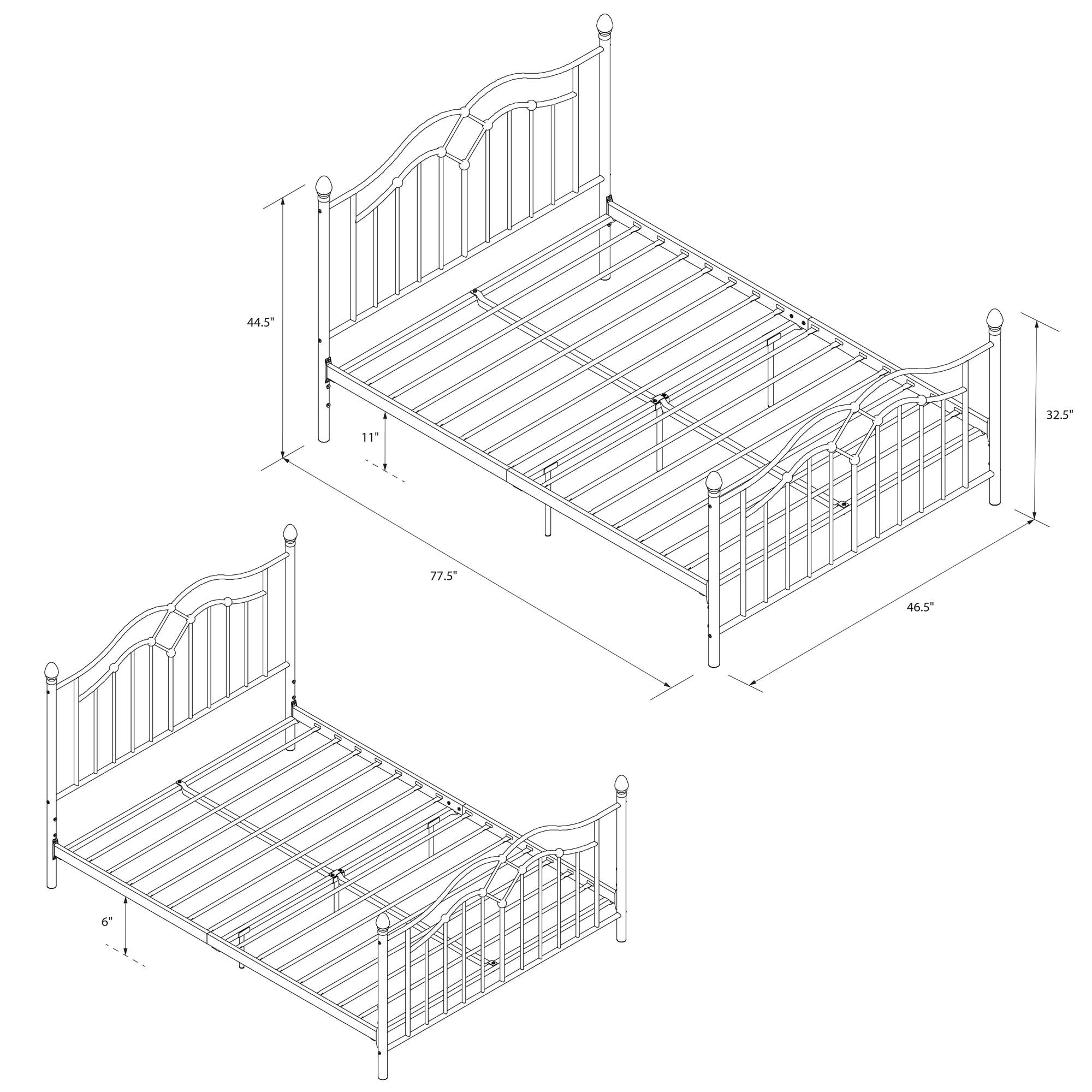 The DHP Tokyo Metal Bed is a beautiful welcome to any bedroom. The intricate headboard and footboard help make this a statement bedframe perfect for your master bedroom, a guest bedroom or your teen’s room. The Tokyo is designed with a brushed metal frame and intricate lines that provide a timeless look that is great to enhance any modern decor. Its high profile headboard and low profile footboard topped with spindles create a warm and elegant feel to any bedroom. Thanks to the 11″ clearance, this frame allows you to use the space under your bed for much needed additional storage. Sturdily constructed, the bed includes secured metal slats and supporting legs for added stability and comfort. The slats also provide additional mattress support and remove the need for any additional box spring or foundation. Available in full, queen and king sizes, in white and bronze, the DHP Tokyo Metal Bed is a must-have in every home!