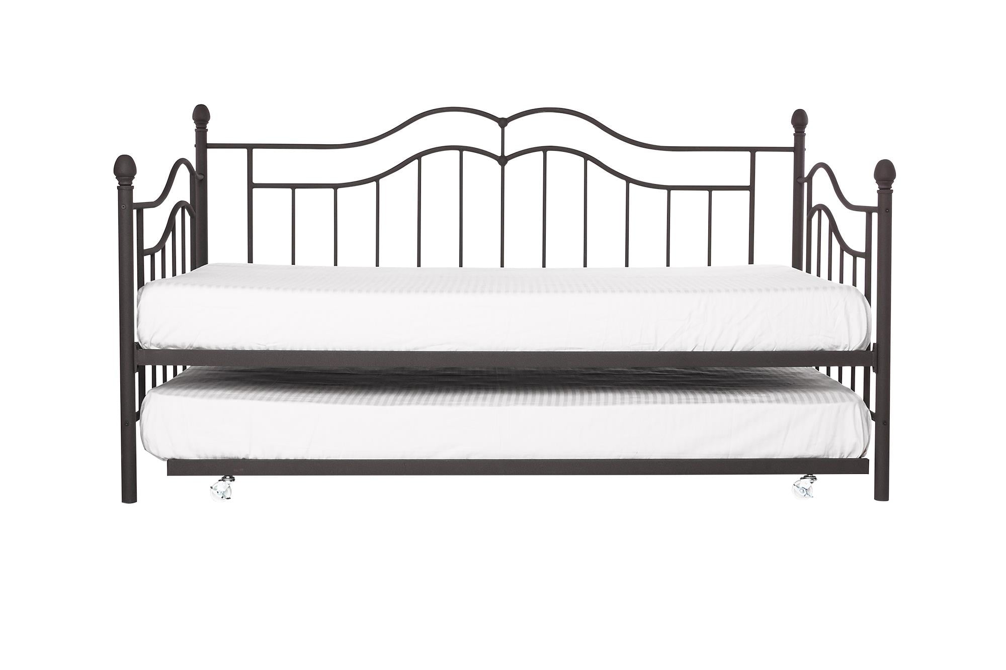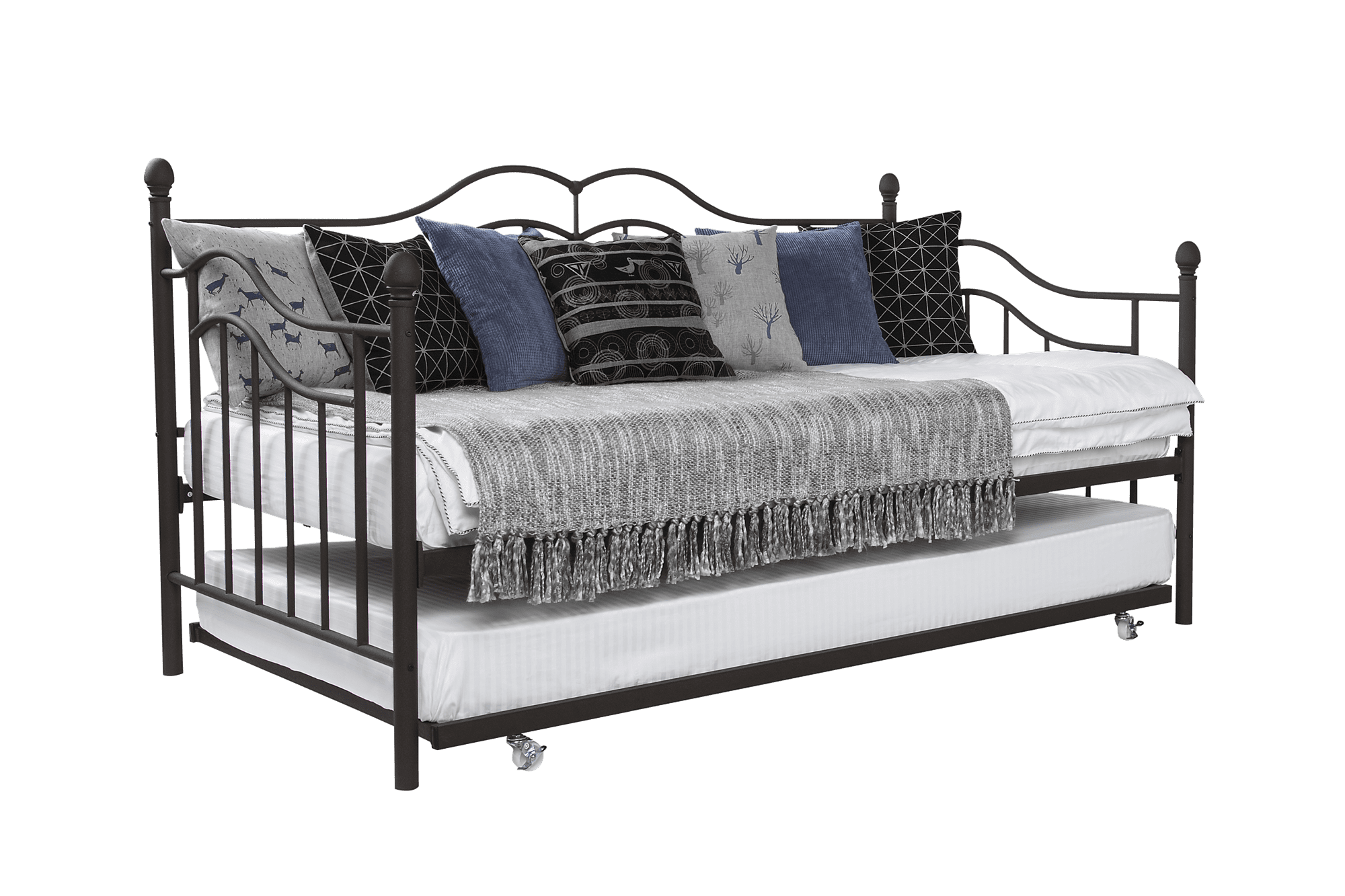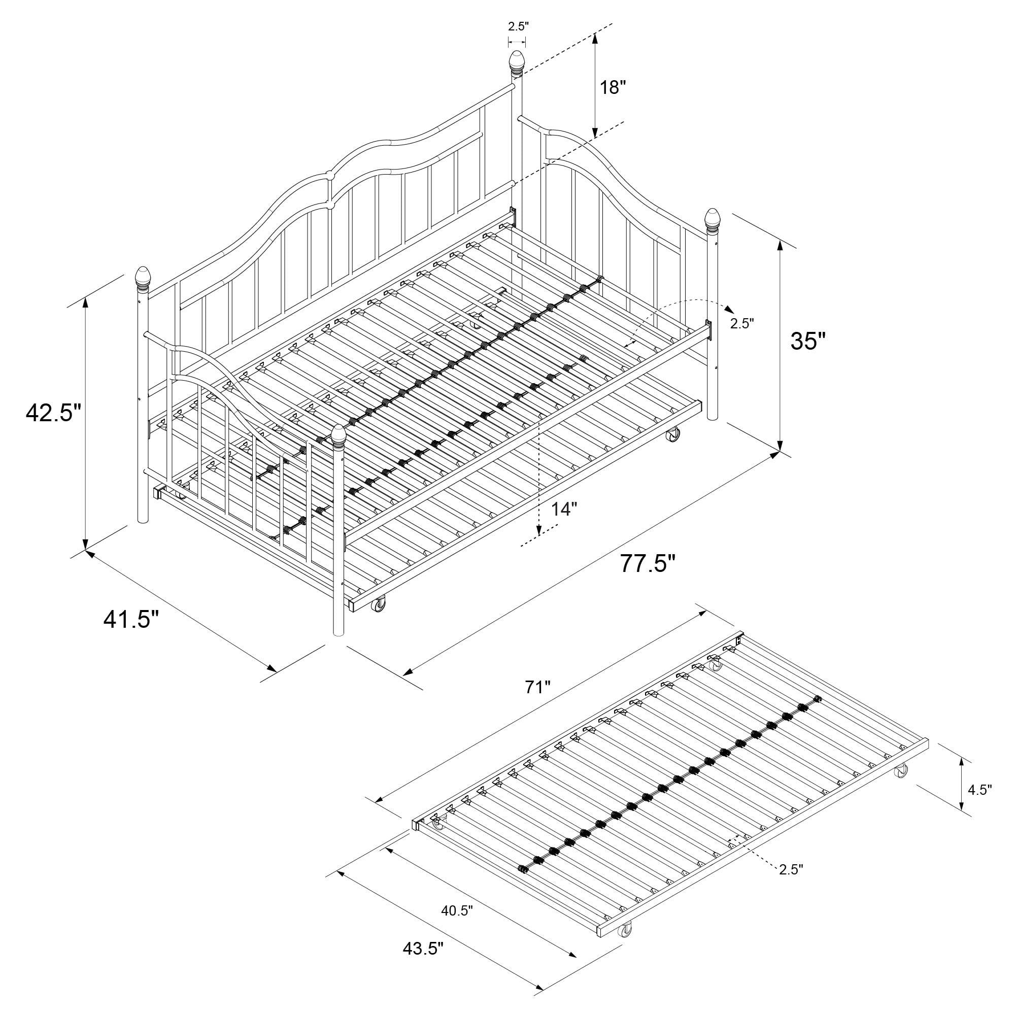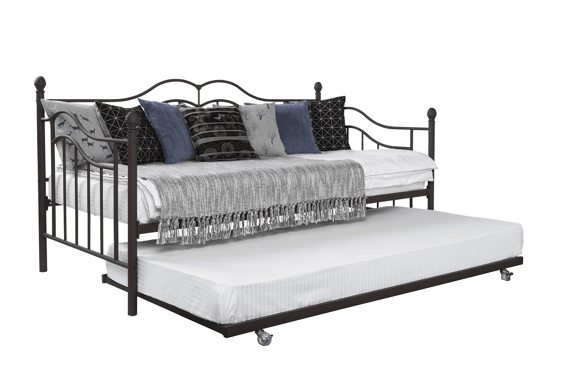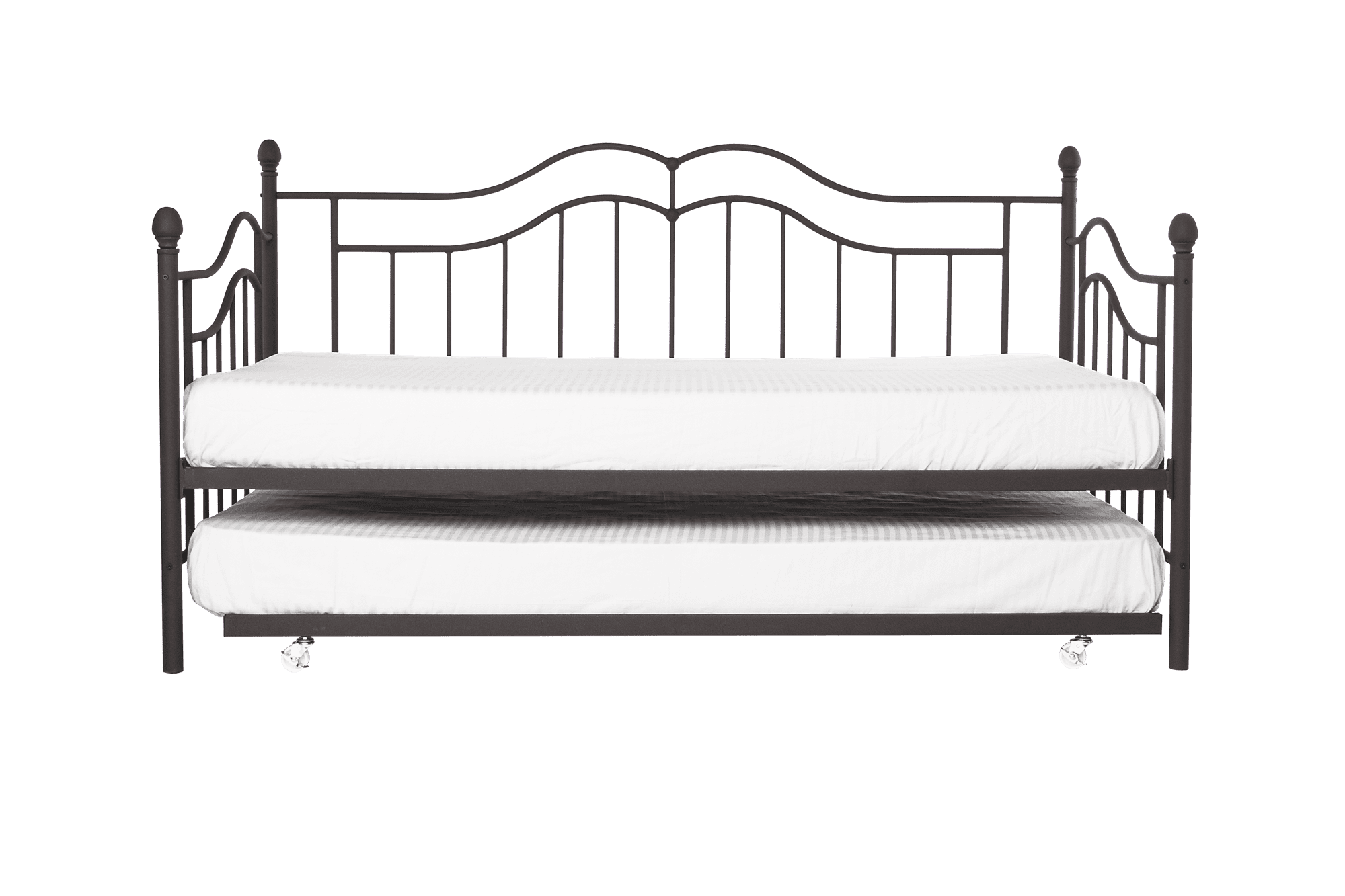 Classic design to fit any living interiors with round finial detailing. Must-have piece of furniture for small living spaces or for accommodating extra guests. Sturdy metal frame and slats for support and durability. Designed to fit two Twin size mattresses – sold separately. Comes with a roll-out trundle. Trundle includes four (4) casters – 2 locking and 2 non-locking. Quick and easy assembly. No additional foundation required. Designed to fit two twin size mattresses (75″ x 39″) – sold separately. Daybed dimensions: 77.5″L x 41.5″W x 42.5″H. Weight Limit: 400 lbs. Net weight: 62 lbs. Trundle dimensions: 71″L x 40.5″W x 4.5″H. Weight Limit: 250 lbs. Shipping dimensions: 77″L x 31″W x 3″H. Gross weight: 72 lbs. Clearance: 14″.