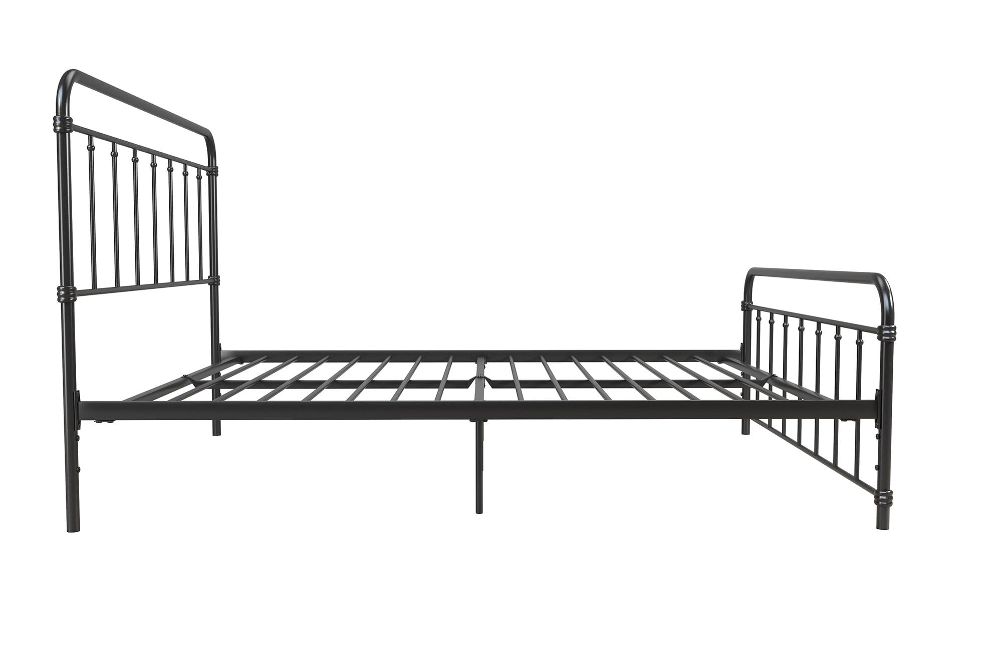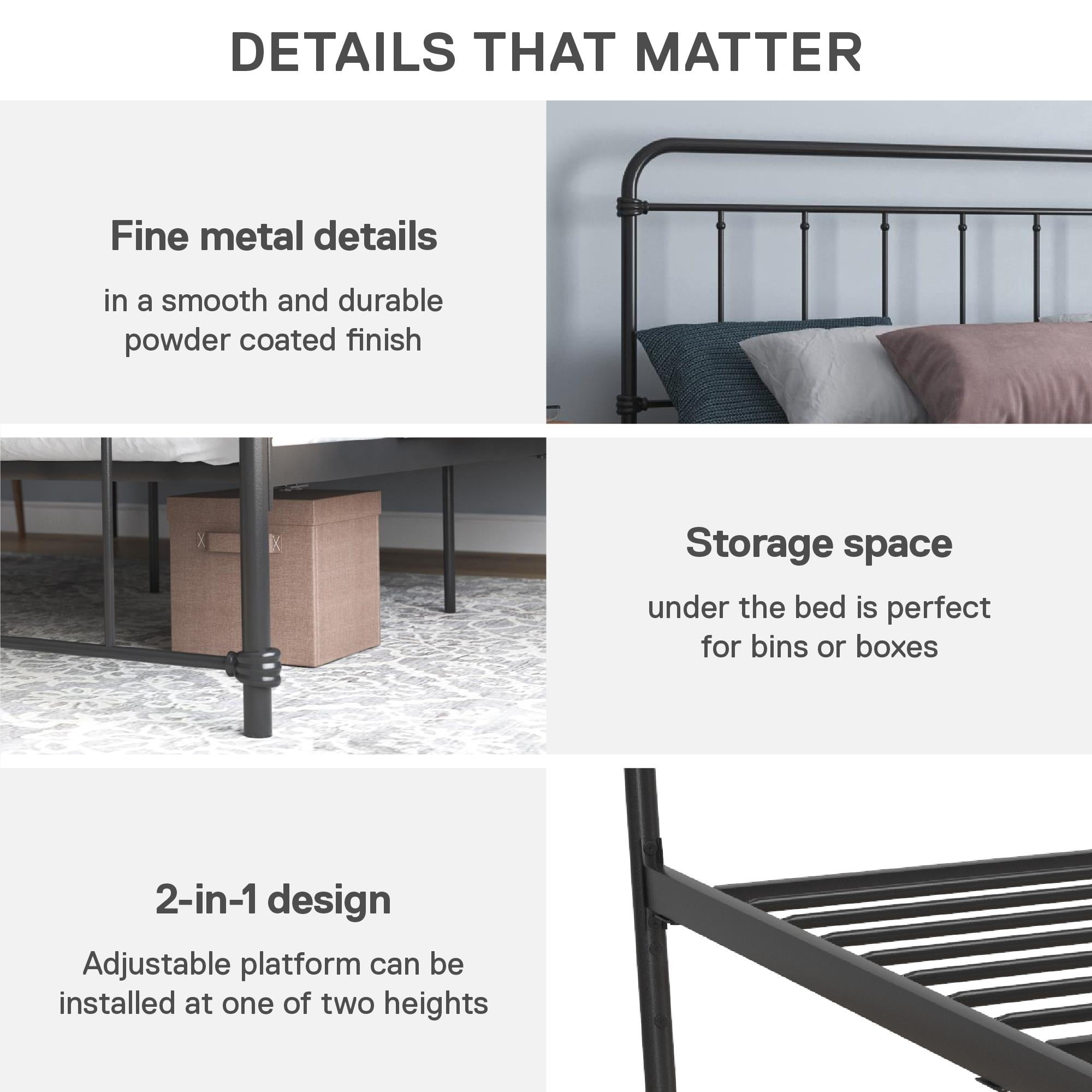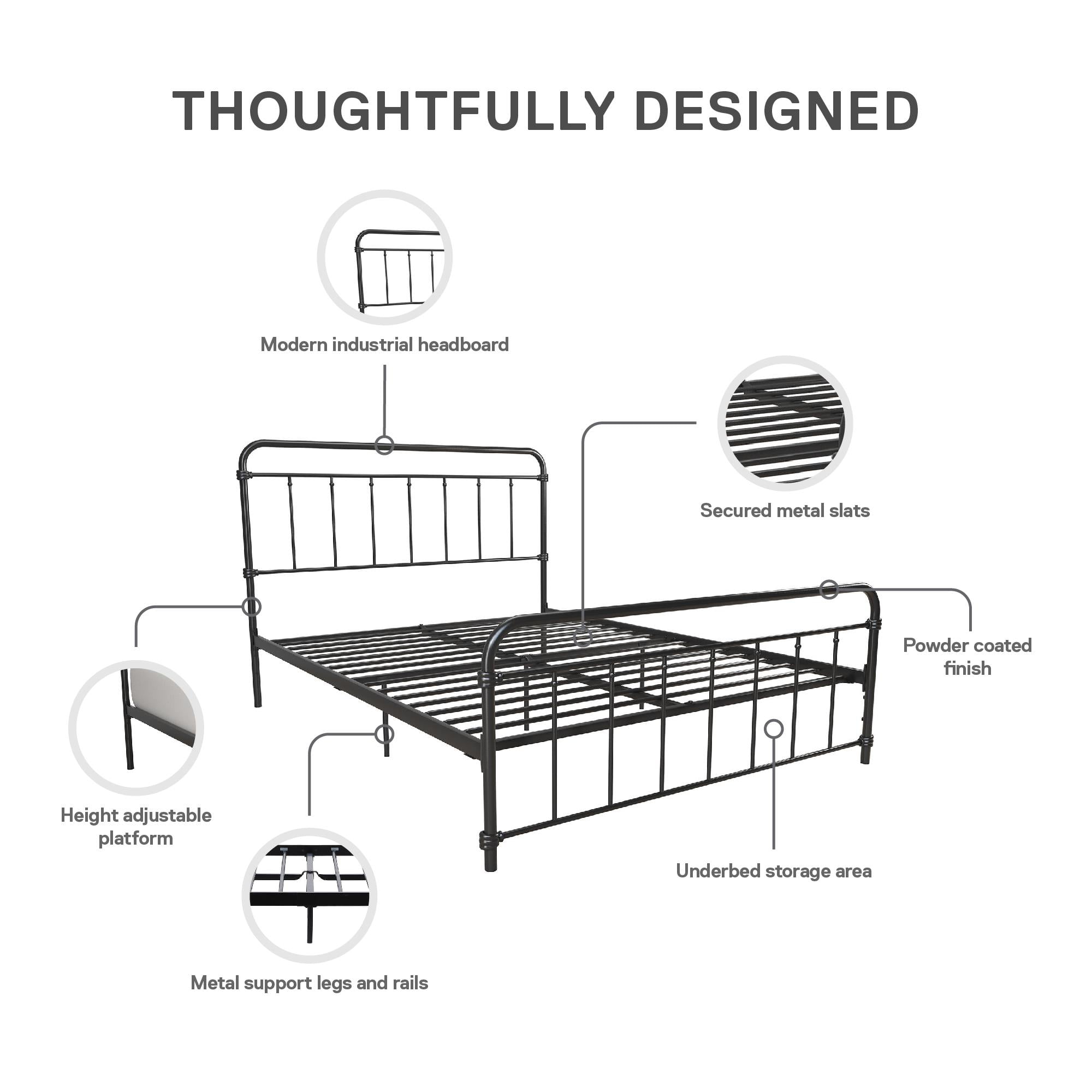 Modern Farmhouse Design: Rustic meets industrial with a stylish spindle bed that showcases a sleek curved edge headboard and footboard for a fresh bedroom look. Great bed for kids, teens, adults or guests. Available in multiples sizes and colors Adjustable Height: Designed to maximize space, the adjustable bed frame’s height can be installed at 7″ from the floor for a lower profile or 11″ for more under bed clearance and storage space. Dimensions: 83.5″L x 63″W x 46″H. Max weight limit: 500 lbs Sturdy construction: Strong metal structure creates a stable frame supported by center legs and a metal bar for superior stability. Premium powder coated metal finish provides a smooth and longer lasting finish that protects against corrosion, rust No Box Spring Needed: Heavy duty metal slats ensure excellent air flow and support your mattress without the need for a box spring. The secured slats and raised sides keep your mattress in place to prevent it from sliding Stress-free Assembly: All tools and instructions are included and easy to follow. Get answers to all your questions with customer support 7 days a week by phone, email or chat. Easily order parts online or by phone. Enjoy a 1 year limited warranty