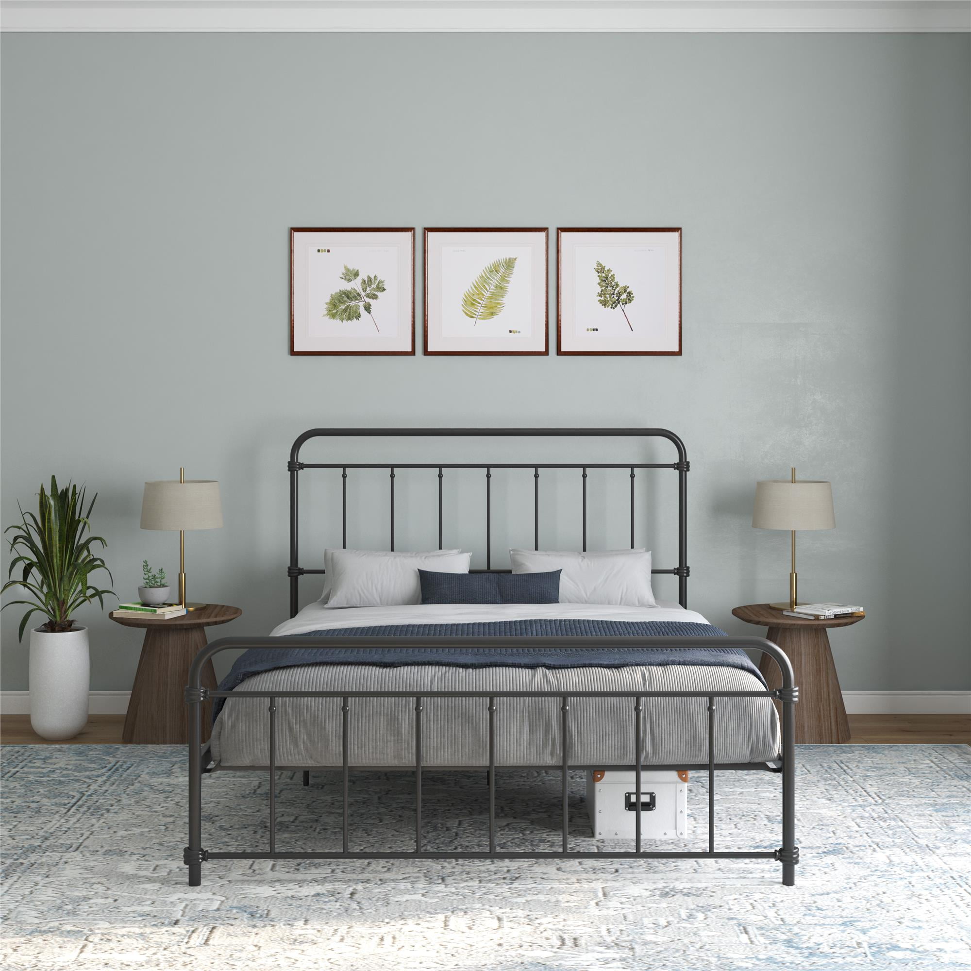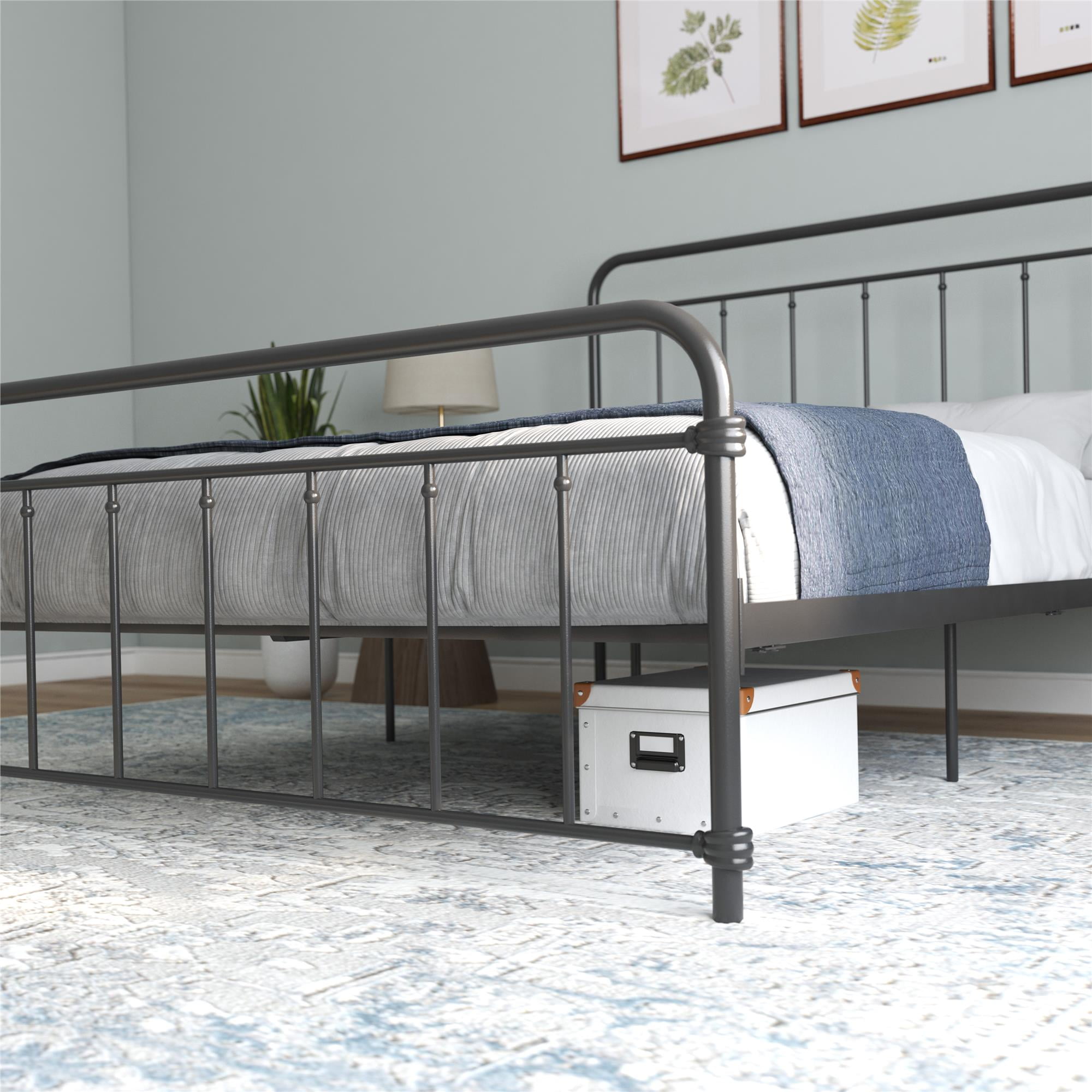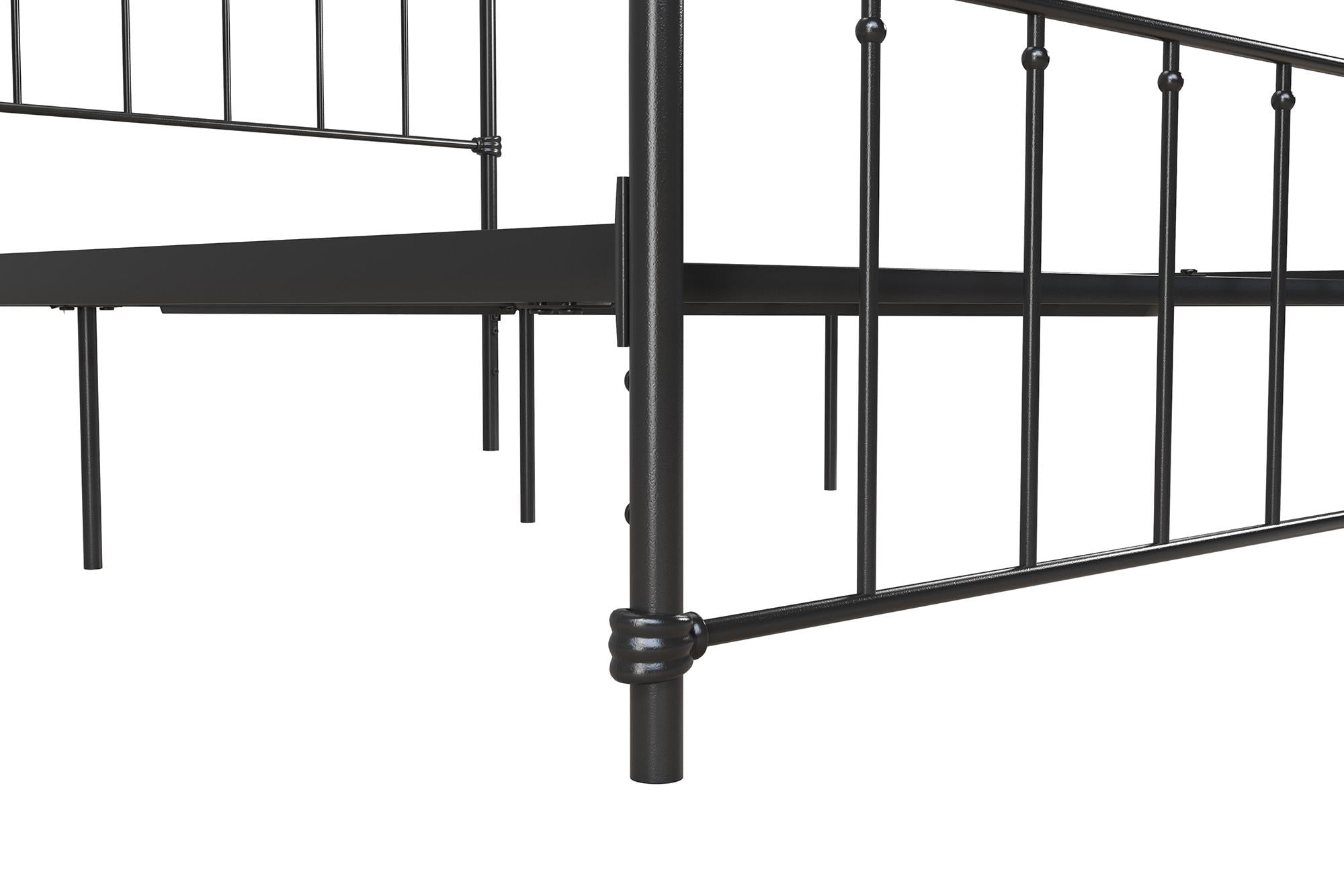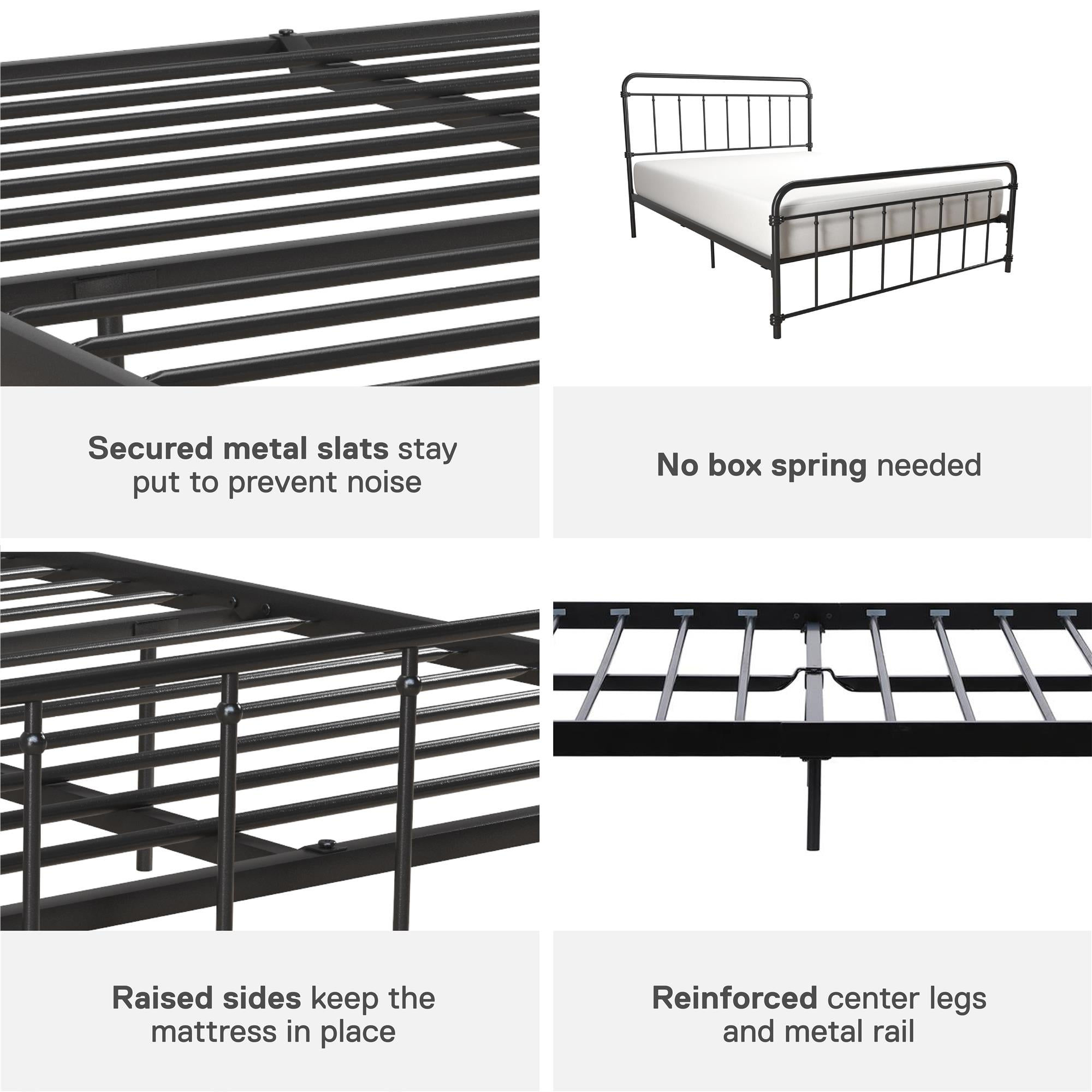 Modern Farmhouse Design: Rustic meets industrial with a stylish spindle bed that showcases a sleek curved edge headboard and footboard for a fresh bedroom look. Great bed for kids, teens, adults or guests. Available in multiples sizes and colors Adjustable Height: Designed to maximize space, the adjustable bed frame’s height can be installed at 7″ from the floor for a lower profile or 11″ for more under bed clearance and storage space. Dimensions: 83.5″L x 63″W x 46″H. Max weight limit: 500 lbs Sturdy construction: Strong metal structure creates a stable frame supported by center legs and a metal bar for superior stability. Premium powder coated metal finish provides a smooth and longer lasting finish that protects against corrosion, rust No Box Spring Needed: Heavy duty metal slats ensure excellent air flow and support your mattress without the need for a box spring. The secured slats and raised sides keep your mattress in place to prevent it from sliding Stress-free Assembly: All tools and instructions are included and easy to follow. Get answers to all your questions with customer support 7 days a week by phone, email or chat. Easily order parts online or by phone. Enjoy a 1 year limited warranty