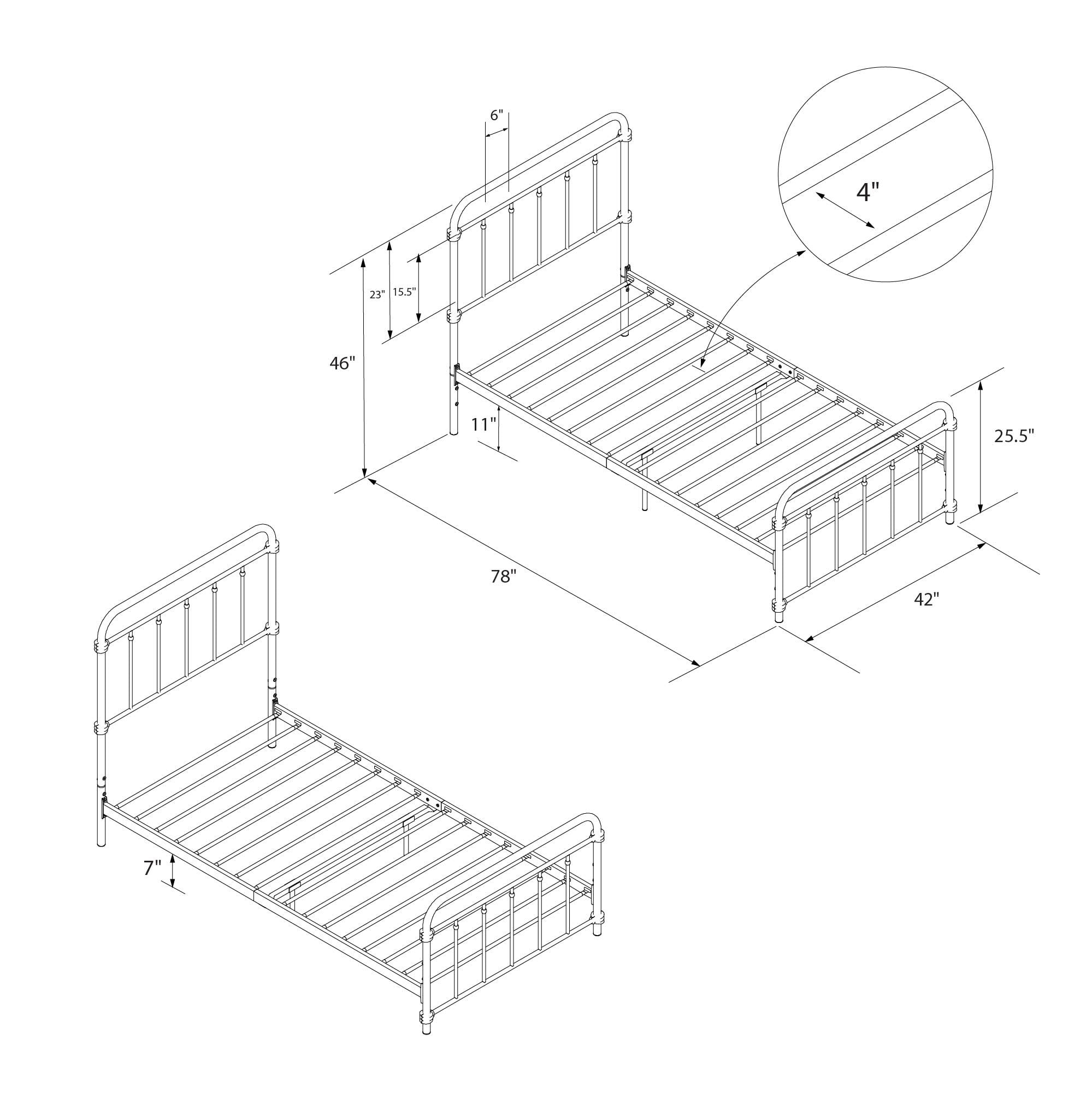 Modern Farmhouse Design: Rustic meets industrial with a stylish spindle bed that showcases a sleek curved edge headboard and footboard for a fresh bedroom look. Great bed for kids, teens, adults or guests. Available in multiples sizes and colors Adjustable Height: Designed to maximize space, the adjustable bed frame’s height can be installed at 7″ from the floor for a lower profile or 11″ for more under bed clearance and storage space. Dimensions: 78″L x 42″W x 46″H. Max weight limit: 250 lbs Sturdy construction: Strong metal structure creates a stable frame supported by center legs and a metal bar for superior stability. Premium powder coated metal finish provides a smooth and longer lasting finish that protects against corrosion, rust No Box Spring Needed: Heavy duty metal slats ensure excellent air flow and support your mattress without the need for a box spring. The secured slats and raised sides keep your mattress in place to prevent it from sliding Stress-free Assembly: All tools and instructions are included and easy to follow. Get answers to all your questions with customer support 7 days a week by phone, email or chat. Easily order parts online or by phone. Enjoy a 1 year limited warranty