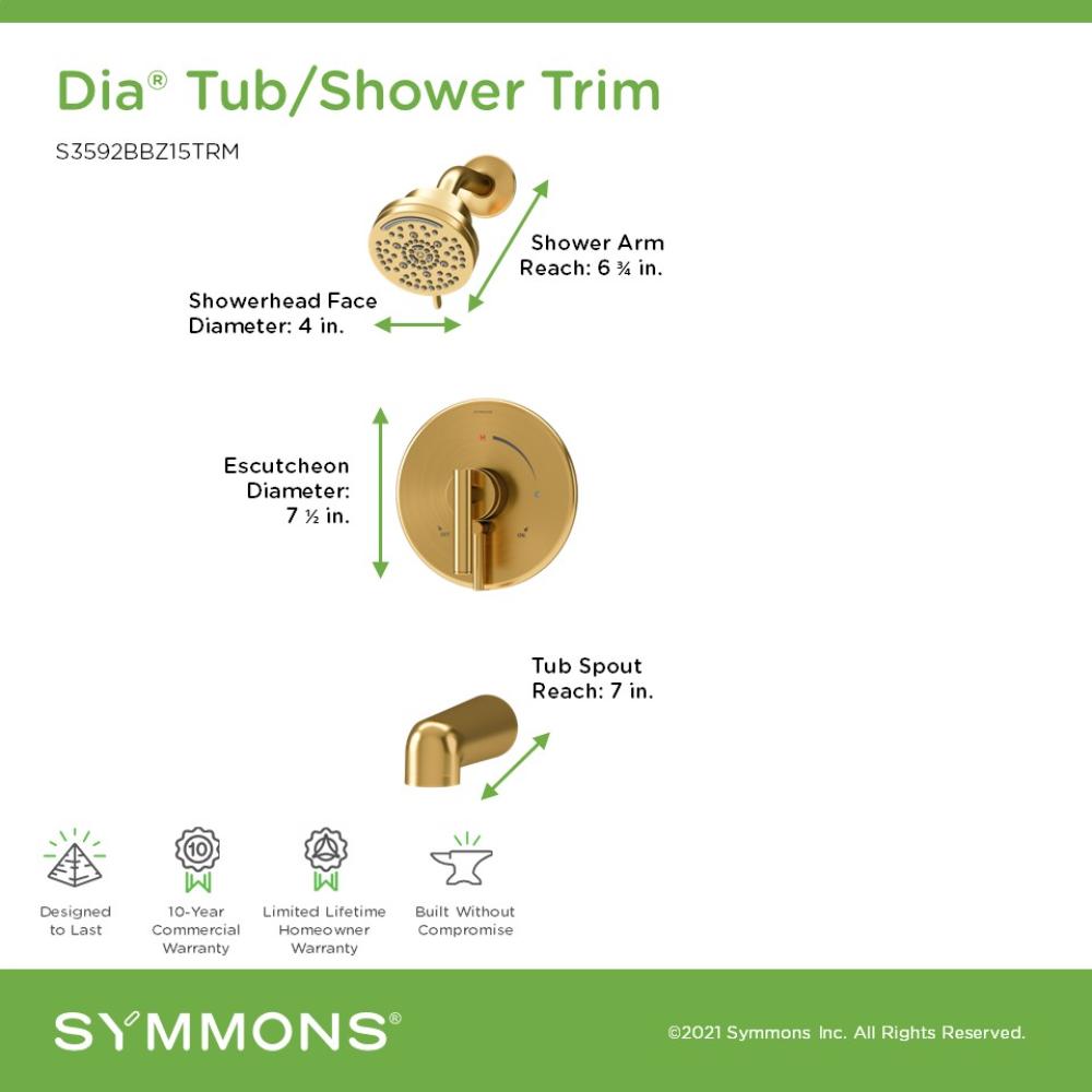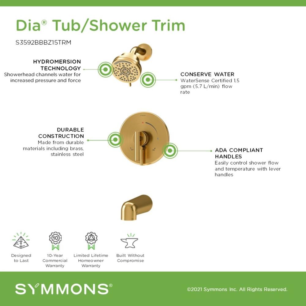 Elevate your showering experience with the Dia Single Handle Multi Spray Wall Mounted Tub and Shower Trim, featuring a modern 4 inch round showerhead with innovative HydroMersion technology. The showerhead offers 7 spray and control modes, ensuring a customizable and luxurious shower experience every time. Crafted with durability in mind, this shower trim is plated in a scratch resistant finish over solid metal, guaranteeing long lasting style for a lifetime. Its ADA compliant single lever handle design, paired with a solid brass valve cover plate featuring hot and cold indicators, makes water temperature adjustment effortless for everyone in your household. Not only does this tub and shower system prioritize convenience and style, but it also emphasizes environmental sustainability. With a water saving eco friendly low flow rate of 1.5 gallons per minute, the multi mode showerhead conserves water without sacrificing performance. Installation is a breeze with everything you need included in the kit: a shower arm, low flow showerhead, diverter tub spout, brass escutcheon, and an adjustable lever handle. Plus, you won’t need to replace your valve, making the upgrade hassle free. Backed by Symmons’ limited lifetime warranty, you can trust in the quality and durability of this trim for years to come.