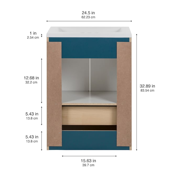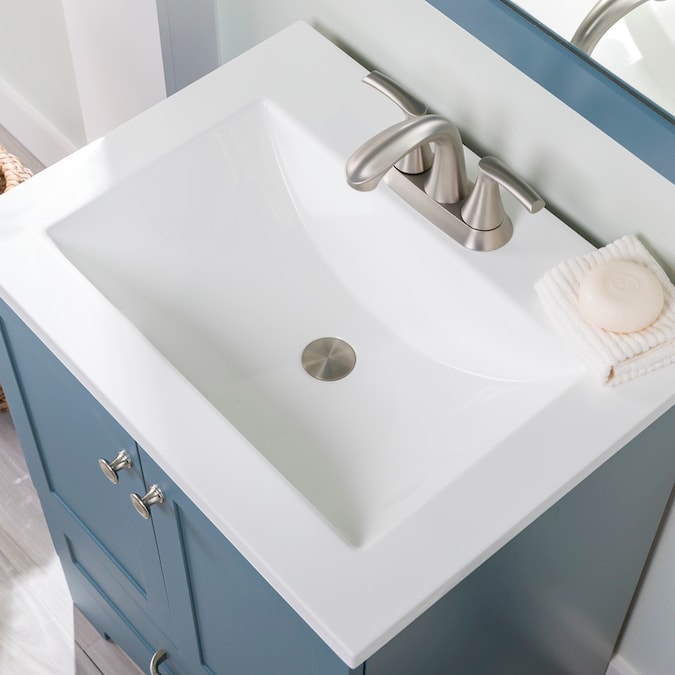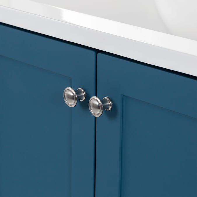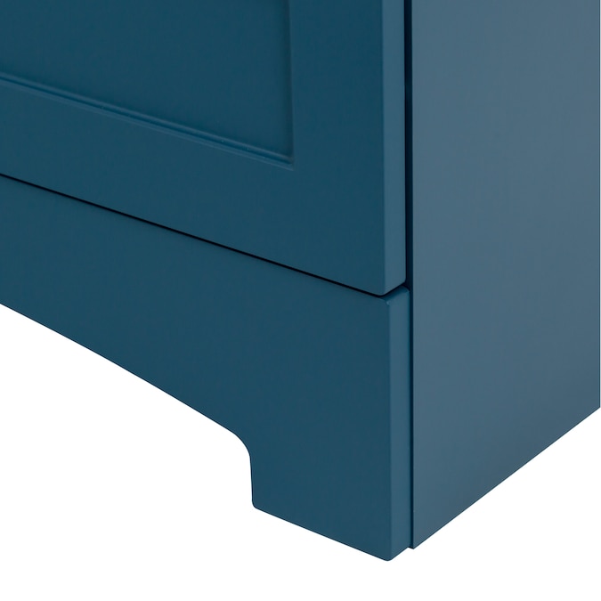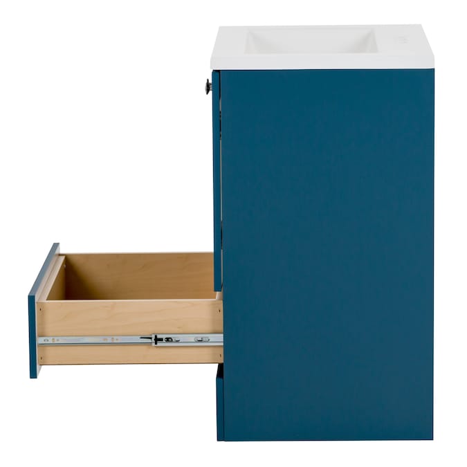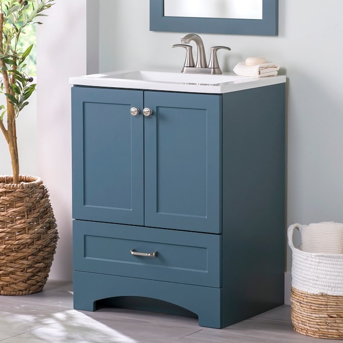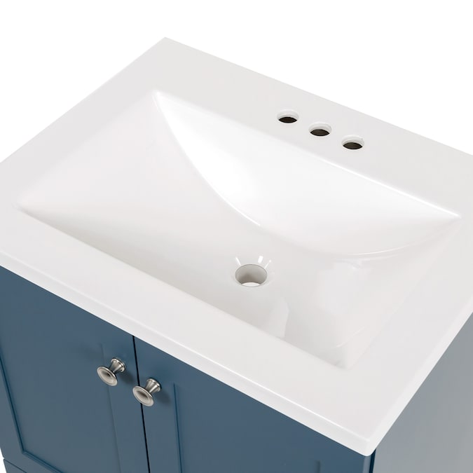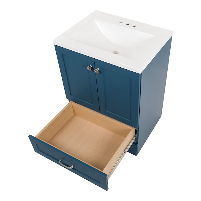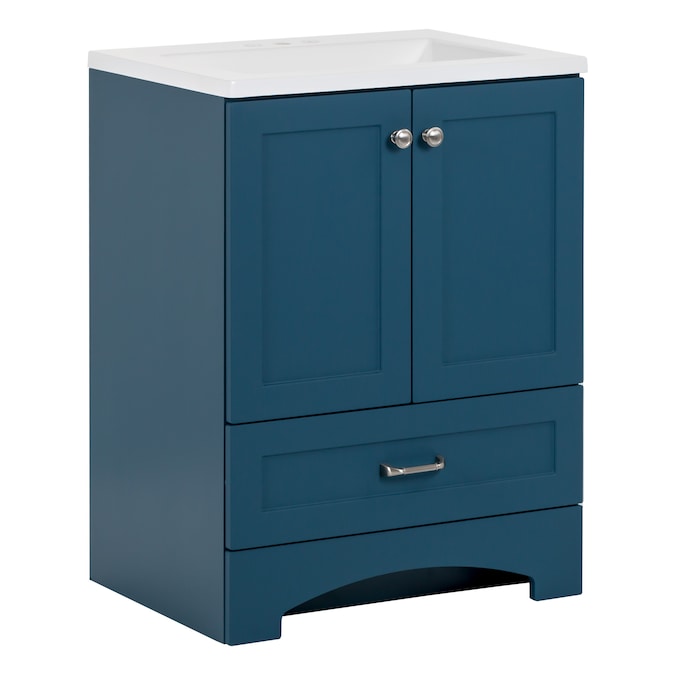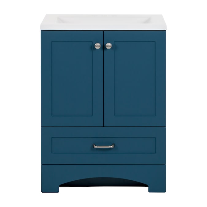 Update your bathroom with the Cassidy 24.5-in admiral blue vanity with white single-sink top. This freestanding bathroom vanity features a Shaker-style design in a vibrant blue finish that’s accented by a soft white vanity top and fine grain nickel door and drawer pulls for a contemporary look. Designed to maximize storage, this freestanding bathroom vanity features a full-extension drawer that lines the bottom to keep bathroom essentials organized and tucked away. Its 2-door under-sink cabinet provides easy access to your plumbing along with additional open storage space. And at 24.5-in W x 18.75-in D x 32.89-in H, this pre-assembled bathroom vanity is ideal for adding style and storage in half baths and small bathrooms.