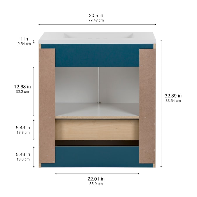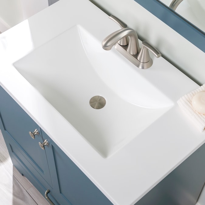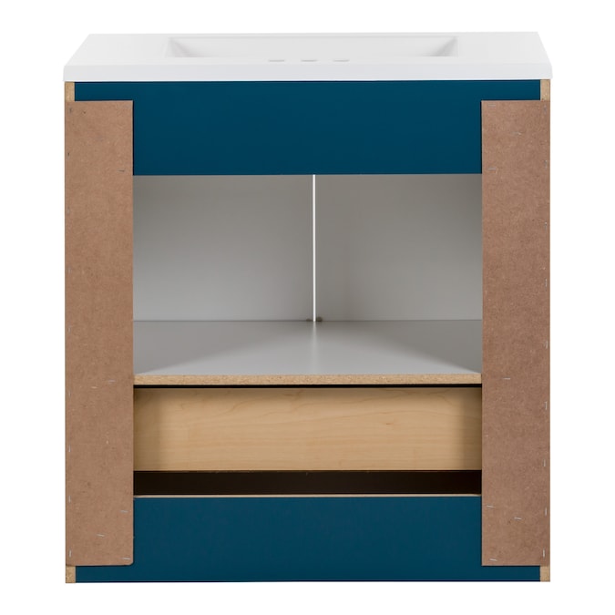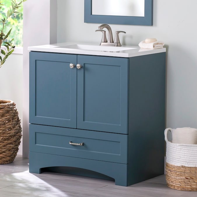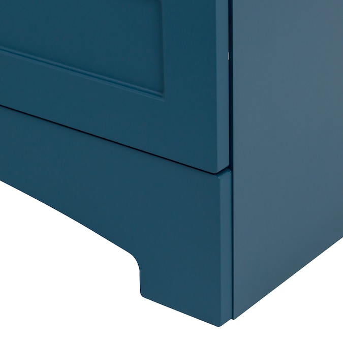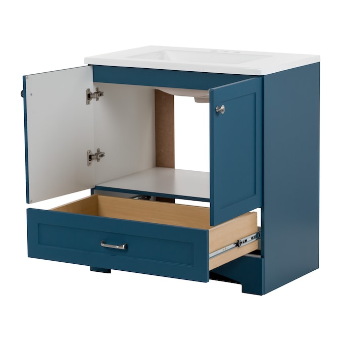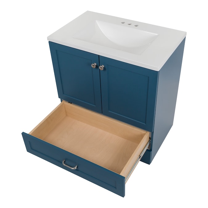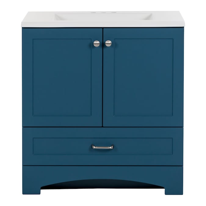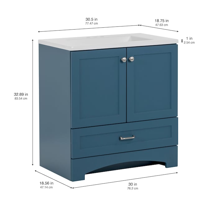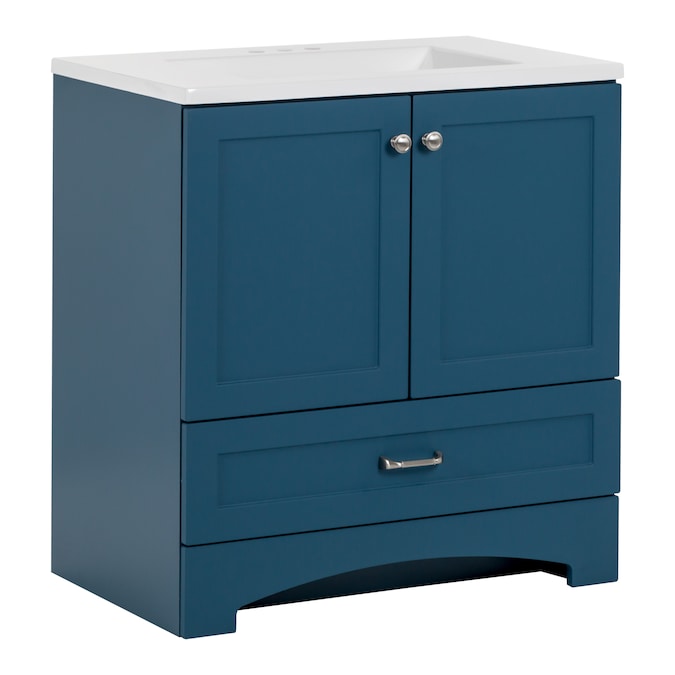 Update your bathroom with the Cassidy 30.5-in admiral blue vanity with white single-sink top. This freestanding bathroom vanity features a Shaker-style design in a vibrant blue finish that’s accented by a soft white vanity top and fine grain nickel door and drawer pulls for a contemporary look. Designed to maximize storage, this freestanding bathroom vanity features a full-extension drawer that lines the bottom to keep bathroom essentials organized and tucked away. Its 2-door under-sink cabinet provides easy access to your plumbing along with additional open storage space. And at 30.5-in W x 18.75-in D x 32.89-in H, this pre-assembled bathroom vanity is ideal for adding style and storage in half baths and powder rooms.