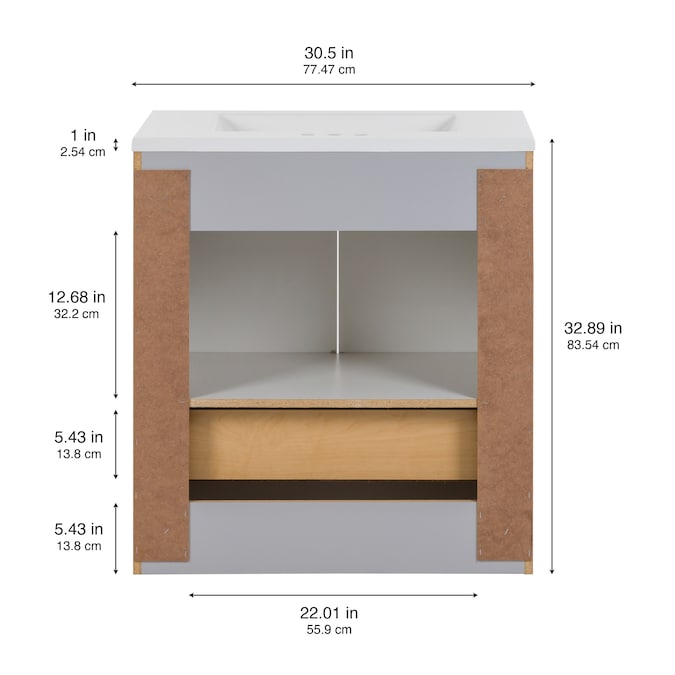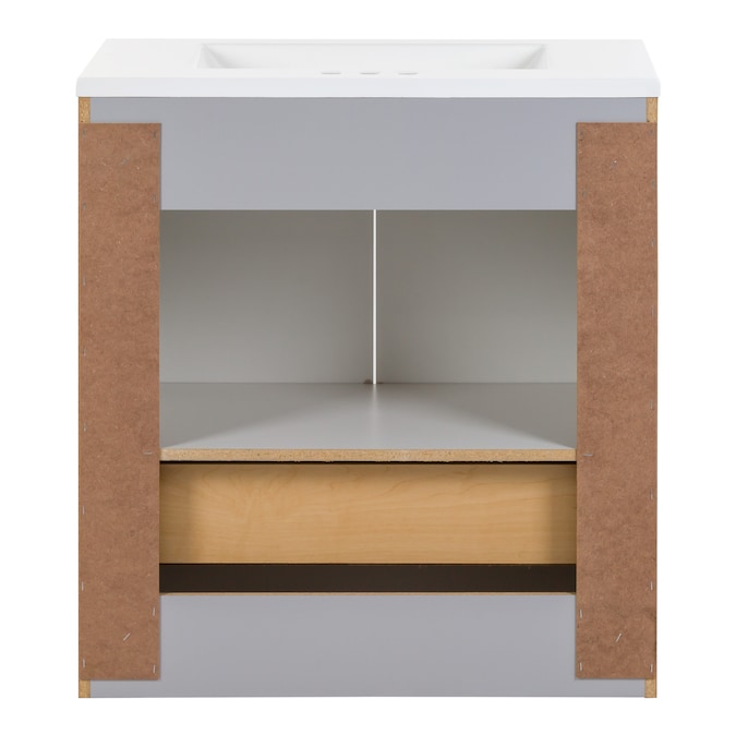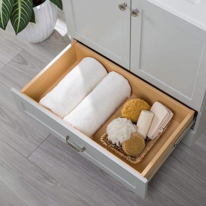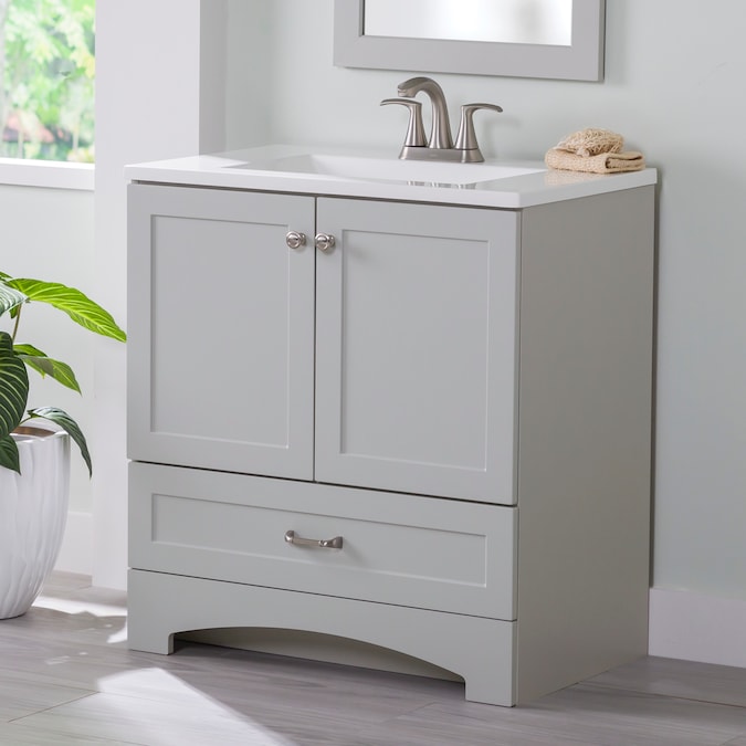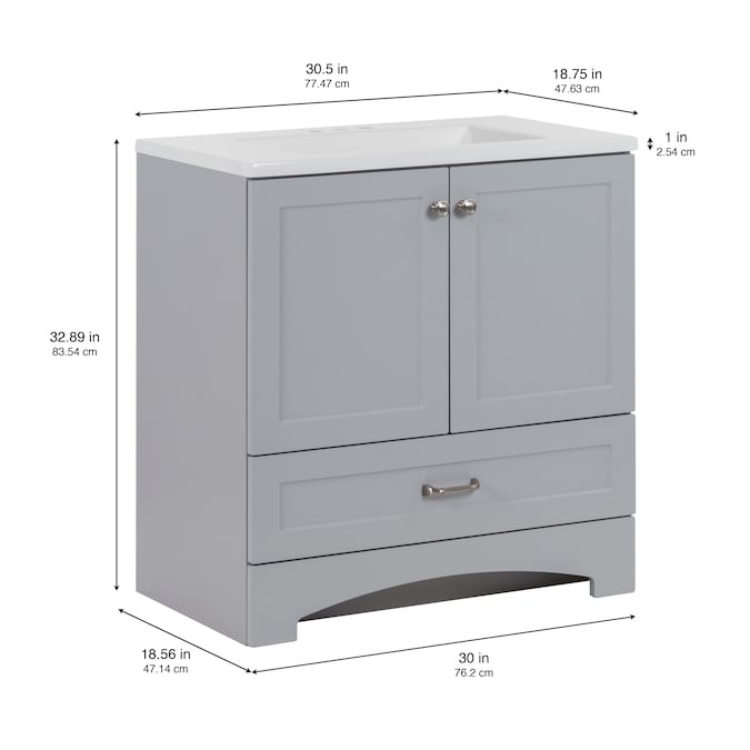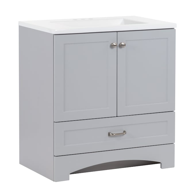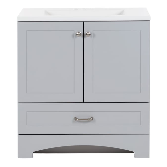 Update your bathroom with the Cassidy 30.5-in pearl gray vanity with white single-sink top. This freestanding bathroom vanity features a Shaker-style design in a cool-toned gray finish that’s accented by a soft white vanity top and fine grain nickel door and drawer pulls for a contemporary look. Designed to maximize storage, this freestanding bathroom vanity features a full-extension drawer that lines the bottom to keep bathroom essentials organized and tucked away. Its 2-door under-sink cabinet provides easy access to your plumbing along with additional open storage space. And at 30.5-in W x 18.75-in D x 32.89-in H, this pre-assembled bathroom vanity is ideal for adding style and storage in half baths and powder rooms.