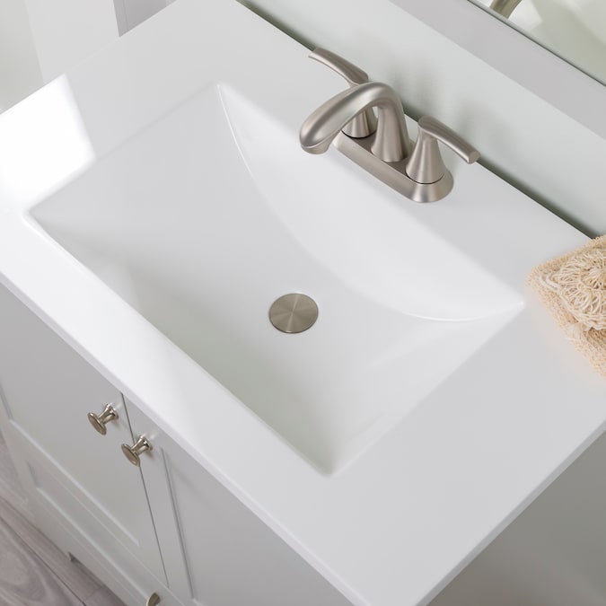 - 1-piece soft white vanity top is predrilled for a 4-inch centerset faucet, sold separately, and features an integrated rectangular sink; slight variations in hue are normal