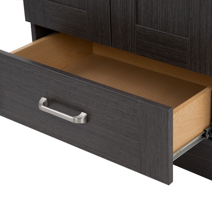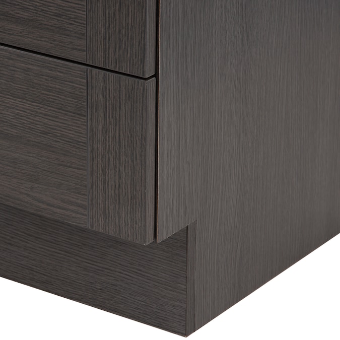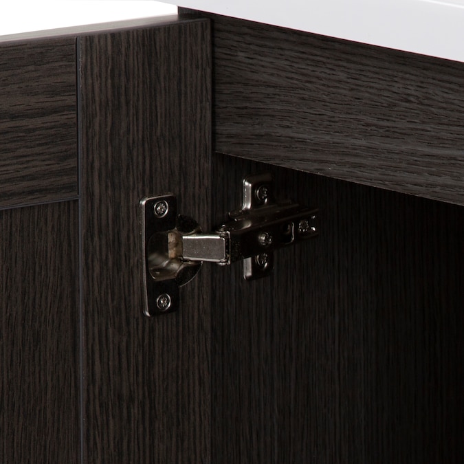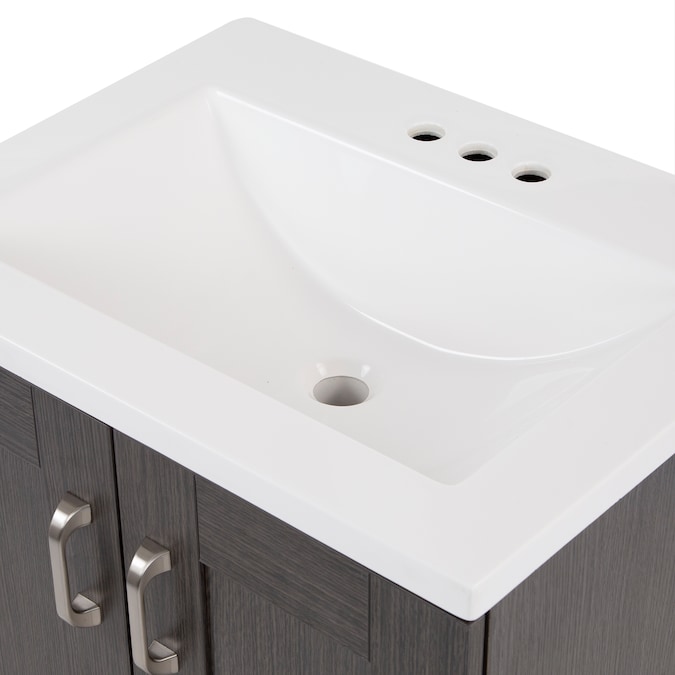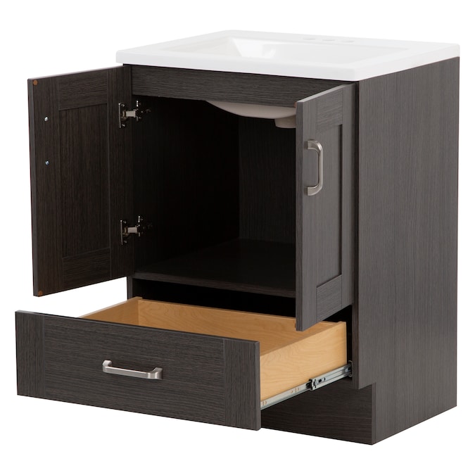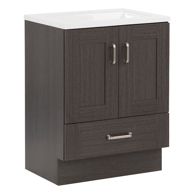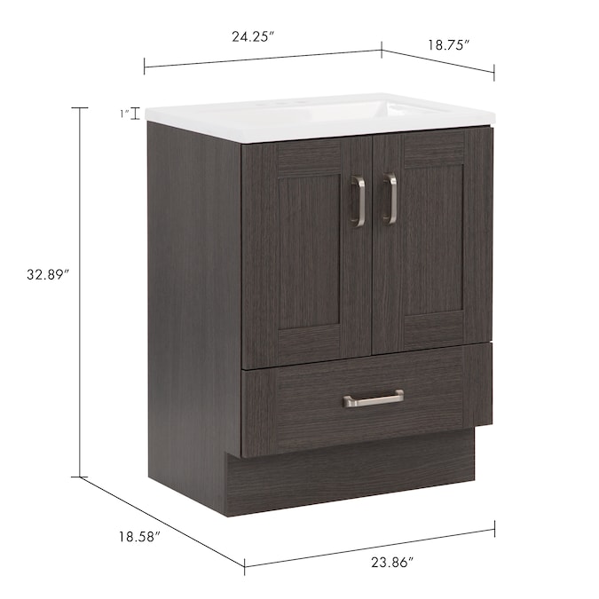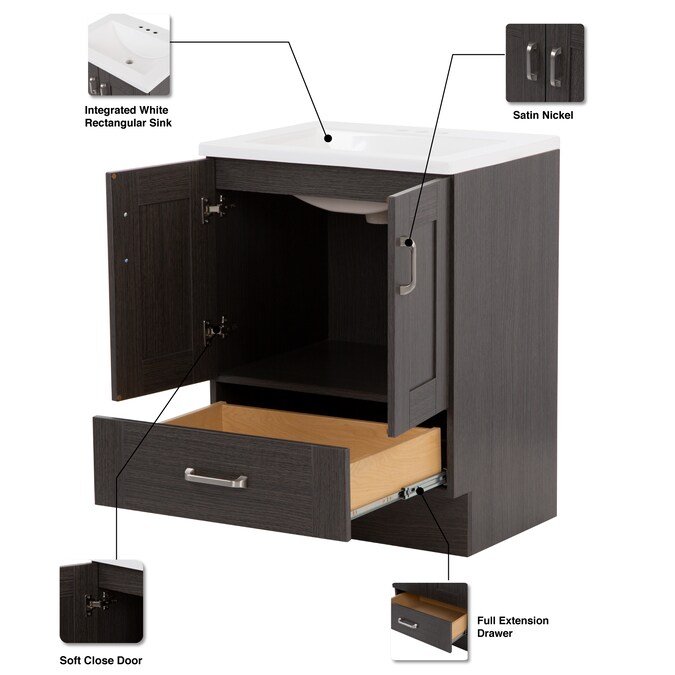 Add a contemporary update to your bathroom with the Collins 24.25-in Milano oak single-sink bathroom vanity. This freestanding vanity features an rich dark woodgrain finish with recessed-panel doors and a flat-panel drawer that are accented by satin nickel hardware. This vanity set is completed with a one-piece soft white vanity top with a centered integrated rectangular sink. Designed to maximize storage, this freestanding bathroom vanity features a full-extension base drawer to keep bathroom essentials organized and a soft-close 2-door cabinet for easy access to your plumbing and additional storage space. With its 24.25-in W x 18.75-in D x 32.89-in H size and integrated storage, this vanity is ideal for small- to medium-sized bathrooms.