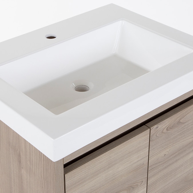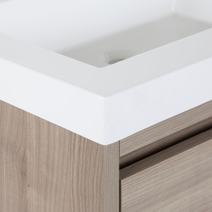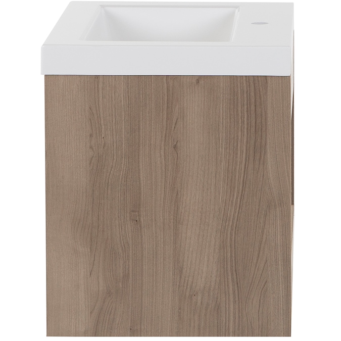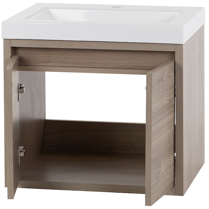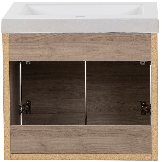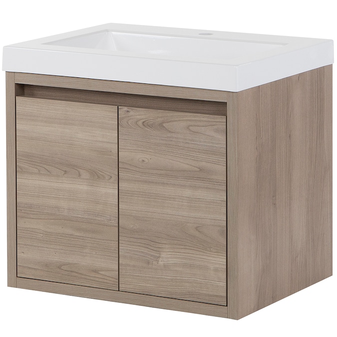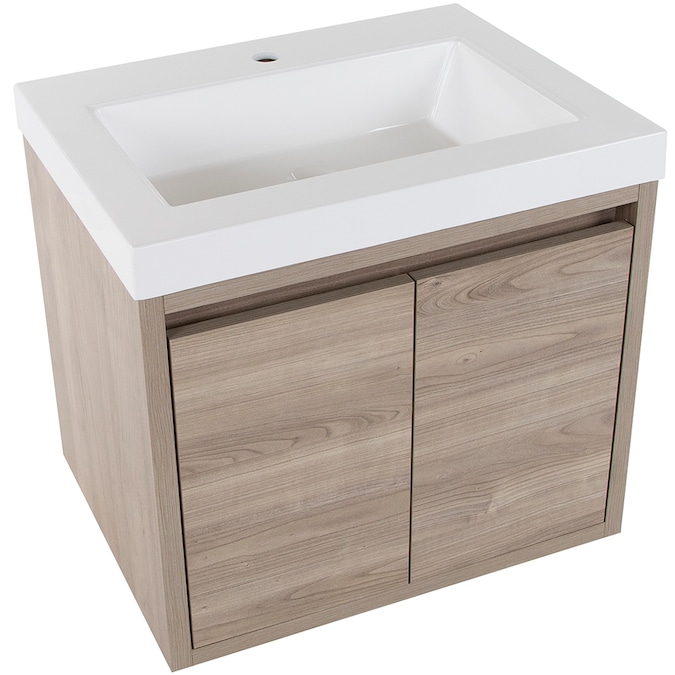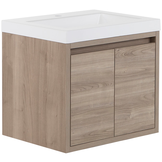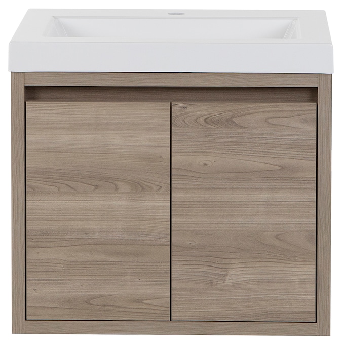 Add modern style to your bathroom with the Hollis 24.5-in forest elm woodgrain floating vanity with single-sink top. This contemporary bathroom vanity features a space-saving, wall-mount design with hardware-free inset doors and a cool-toned brown woodgrain finish for a minimalist look. A 1-piece soft white vanity top with a centered rectangular sink completes this floating vanity set. Designed with convenient storage in mind, this pre-assembled vanity includes a soft-close 2-door under-sink cabinet that also provides easy access to your plumbing. With its 24.5-in W x 18.75-in D x 22.25-in H size, this floating vanity adds style and functionality to small bathrooms without sacrificing floor space.