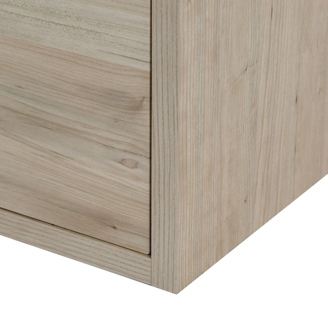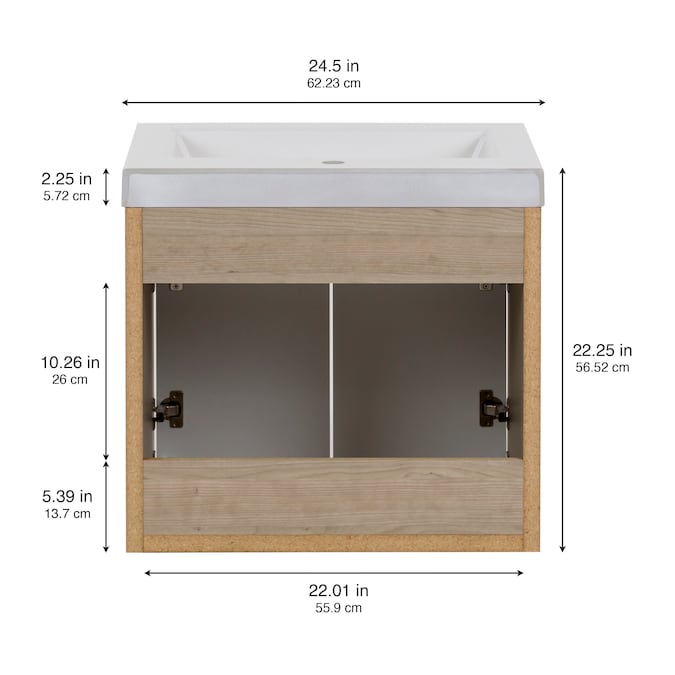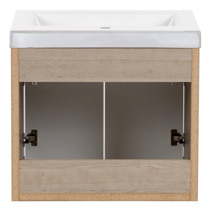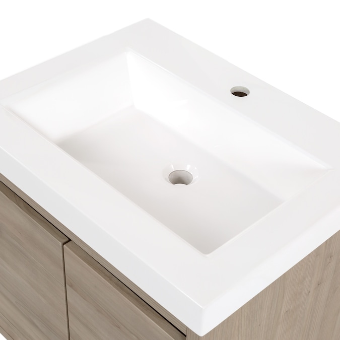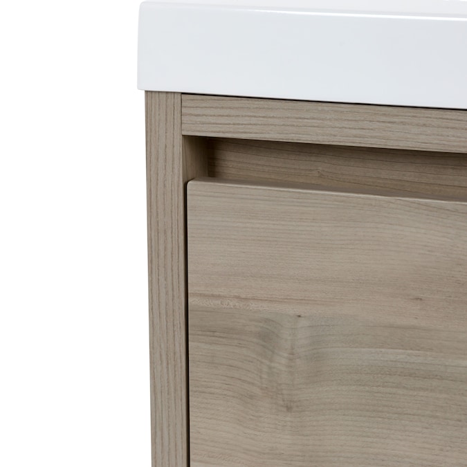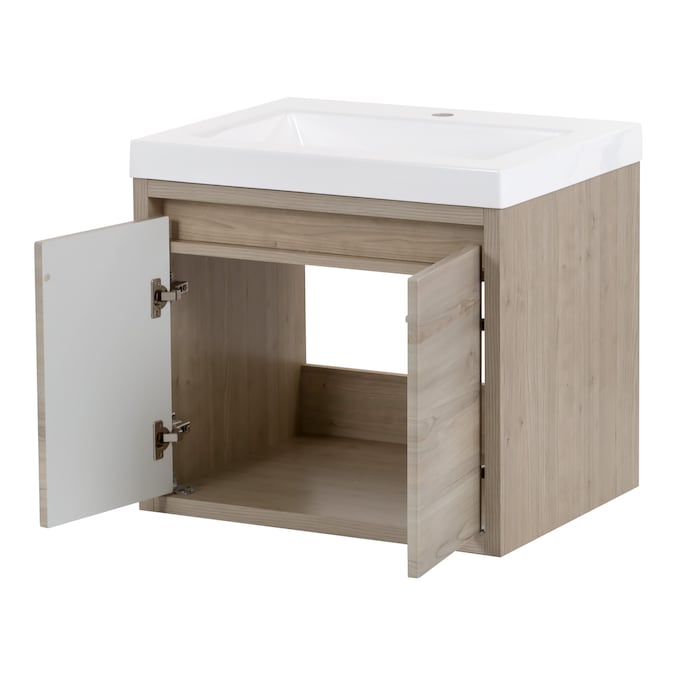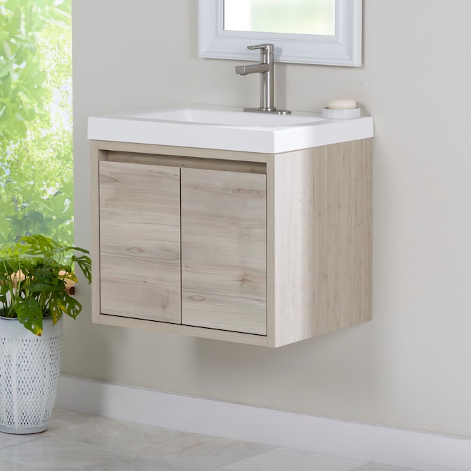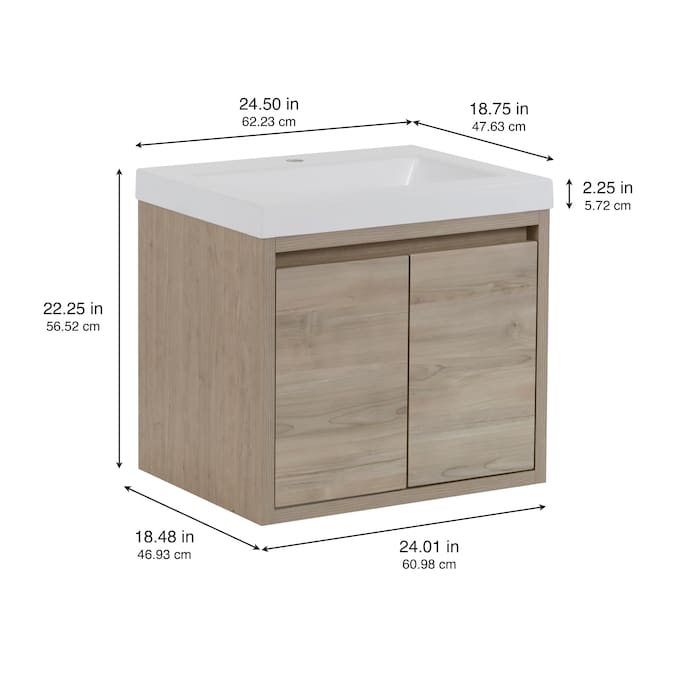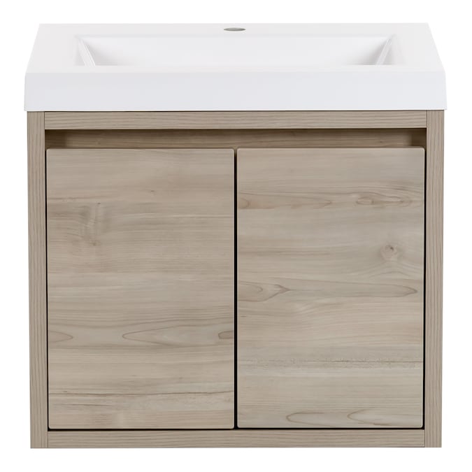 Add modern style to your bathroom with the Hollis 24.5-in sable woodgrain floating vanity with single-sink top. This contemporary bathroom vanity features a space-saving, wall-mount design with hardware-free inset doors and a light brown woodgrain finish for a minimalist look. A 1-piece soft white vanity top with a centered rectangular sink completes this floating vanity set. Designed with convenient storage in mind, this pre-assembled vanity includes a soft-close 2-door under-sink cabinet that also provides easy access to your plumbing. With its 24.5-in W x 18.75-in D x 22.25-in H size, this floating vanity adds style and functionality to small bathrooms without sacrificing floor space.