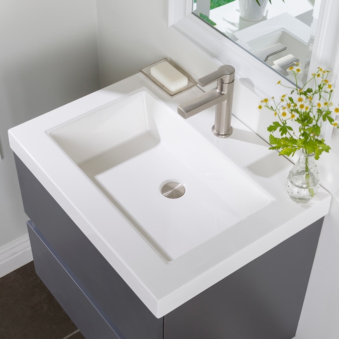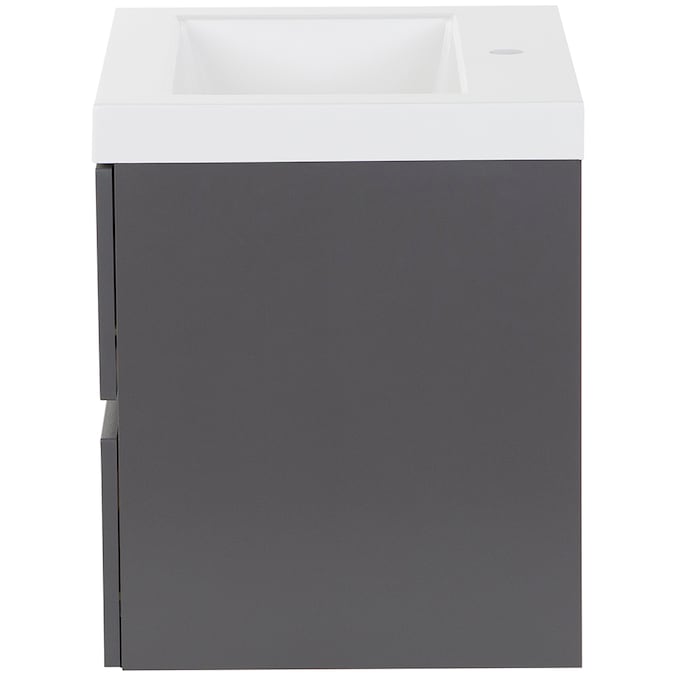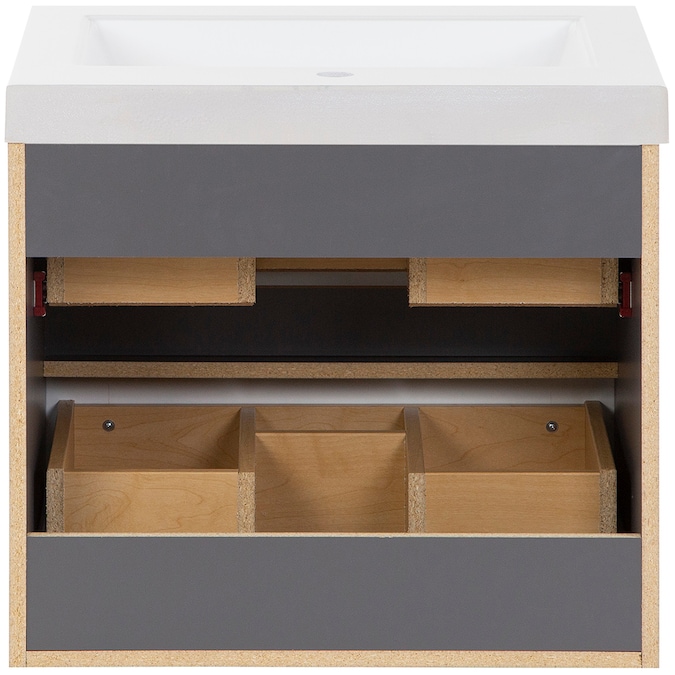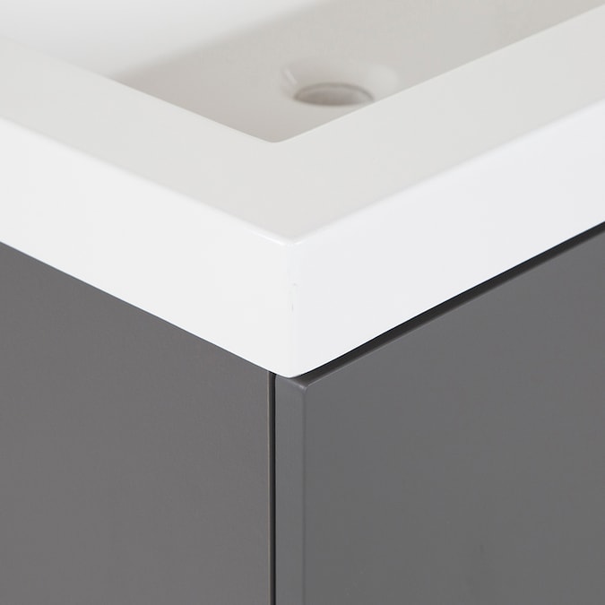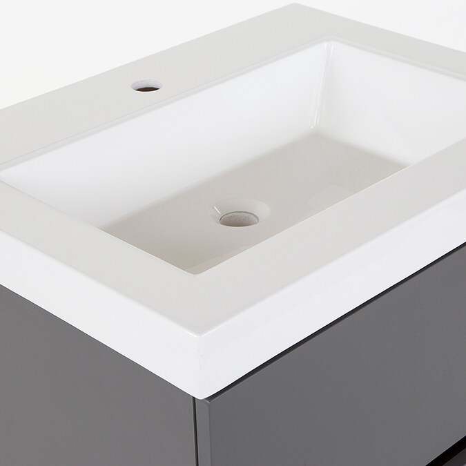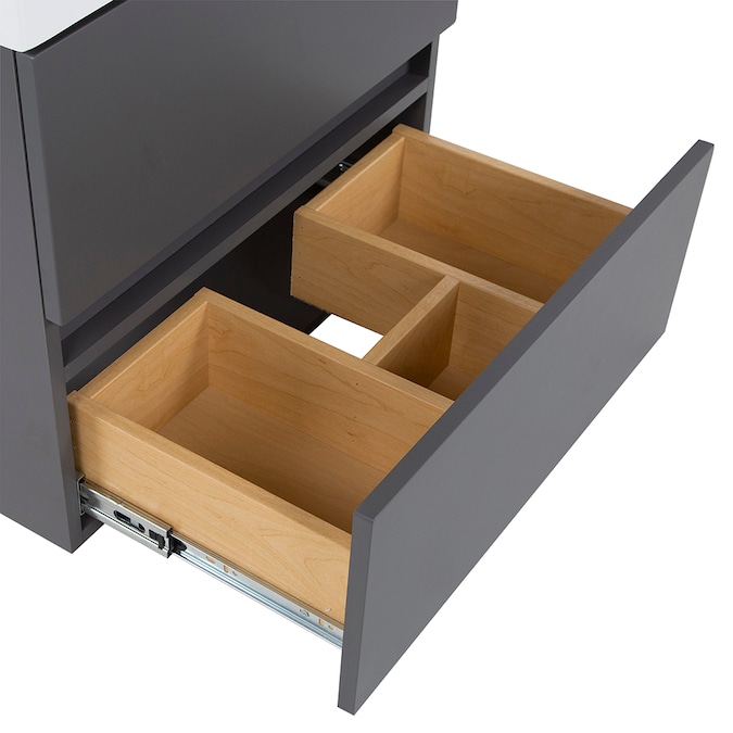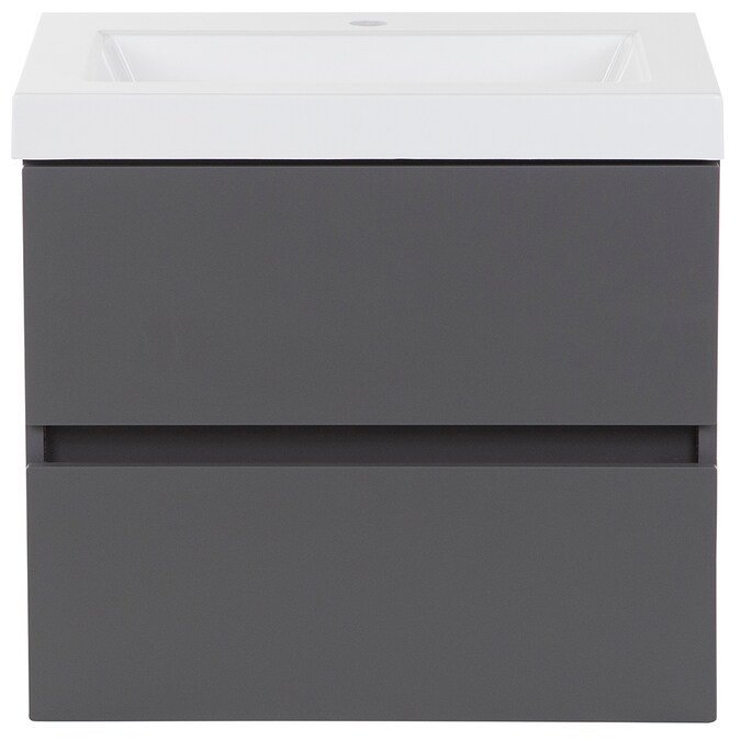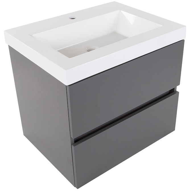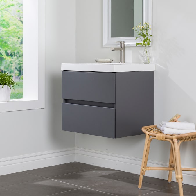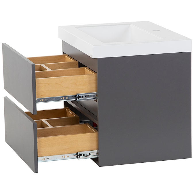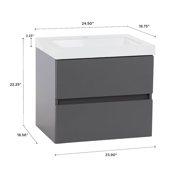 Modernize your bathroom with the Vienna 24.5-in cement gray floating bathroom vanity with white single-sink vanity top. This contemporary vanity features a space-saving, wall-mount design with hardware-free drawers in a cool-toned dark gray finish for a minimalist look. A soft white 1-piece cultured marble vanity top completes this vanity set. Designed with convenient storage in mind, this pre-assembled bathroom vanity includes 2 three-compartment drawers on full-extension, soft-close glides to keep bathroom essentials organized and within easy reach. And with its 24.5-in W x 18.75-in D x 22.25-in H size and integrated storage, this wall-mounted bathroom vanity is ideal for small bathrooms, powder rooms, and half baths.