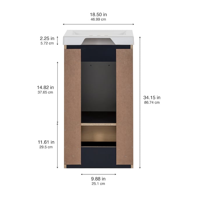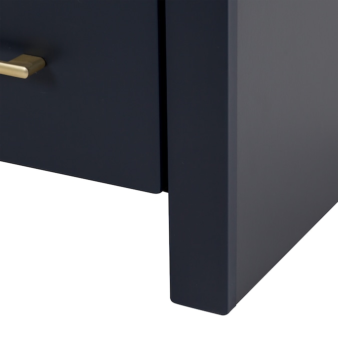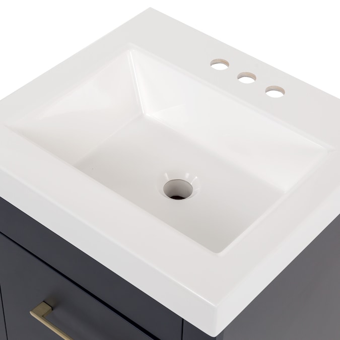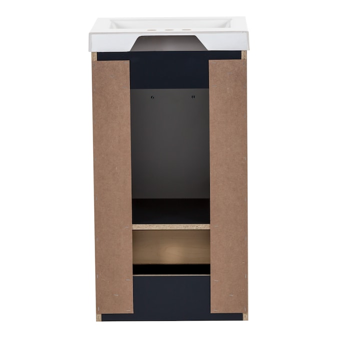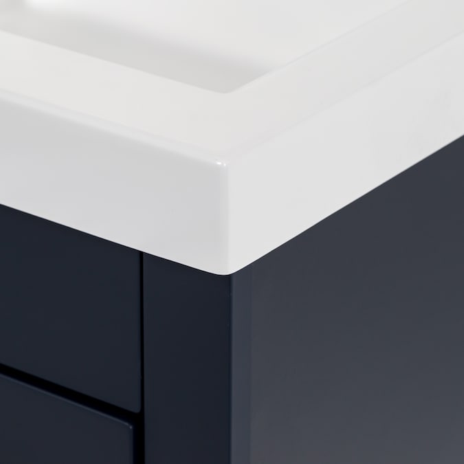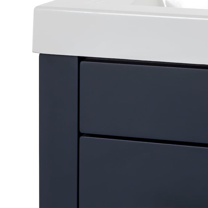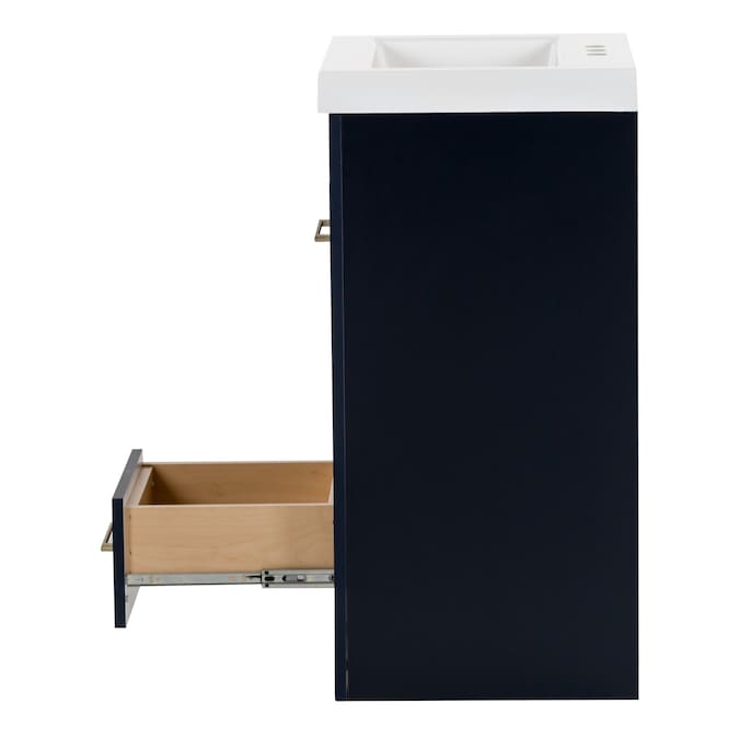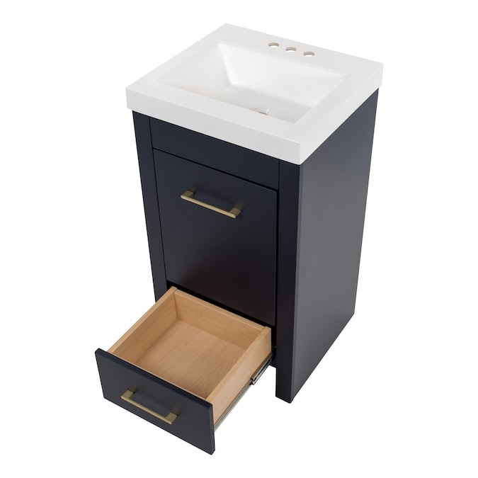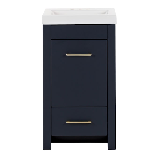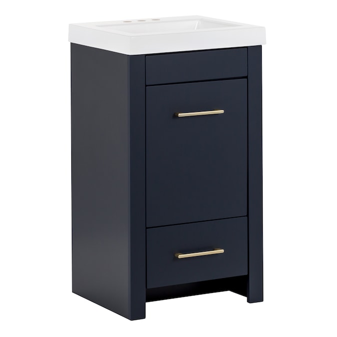 Add a modern accent to your bathroom with the Winnie 18.5-in deep blue single sink vanity. This freestanding vanity features flat panel door- and drawer-faces that are accented by slim gold pulls for an elevated look. Finished in a dark blue laminate, this vanity cabinet is complemented by a 1-piece soft white vanity top. And its soft-close 1-door under-sink cabinet and full-extension bottom drawer keep bathroom necessities organized and easily accessible. With its 18.5-in W x 16.75-in D x 34.15-in H size and integrated storage, this vanity is ideal for small bathrooms and powder rooms.