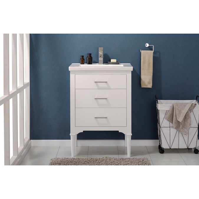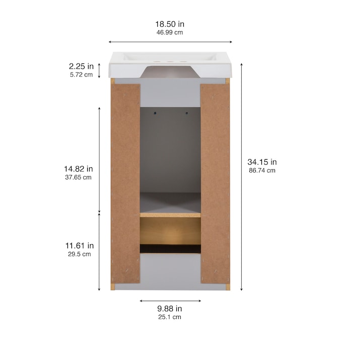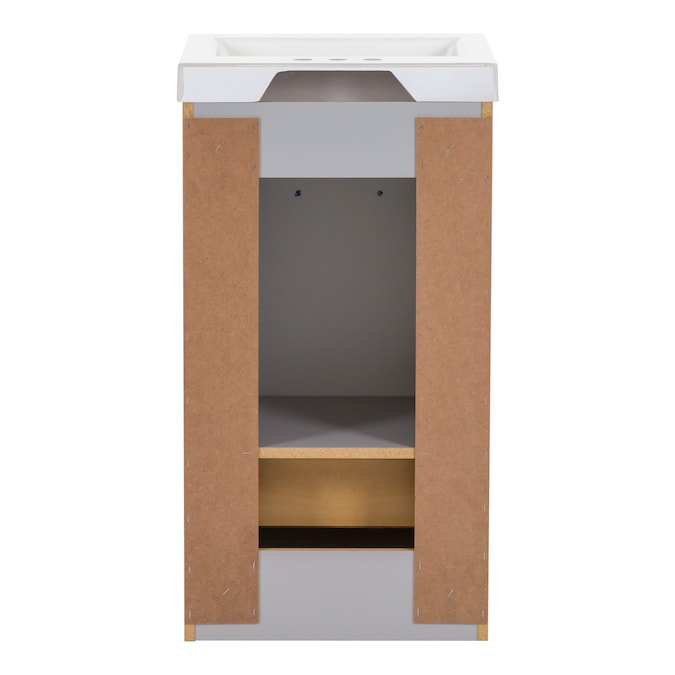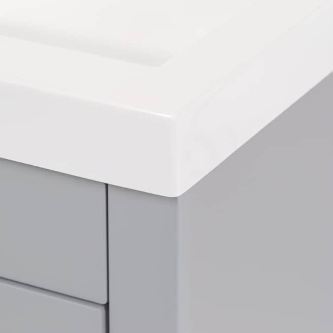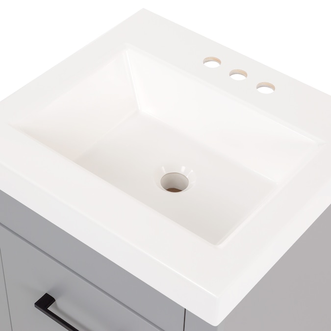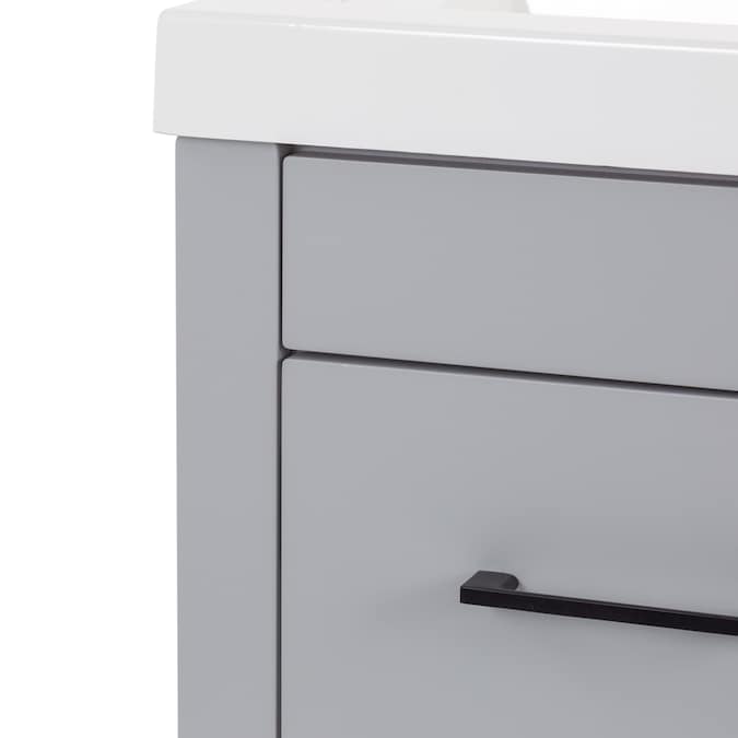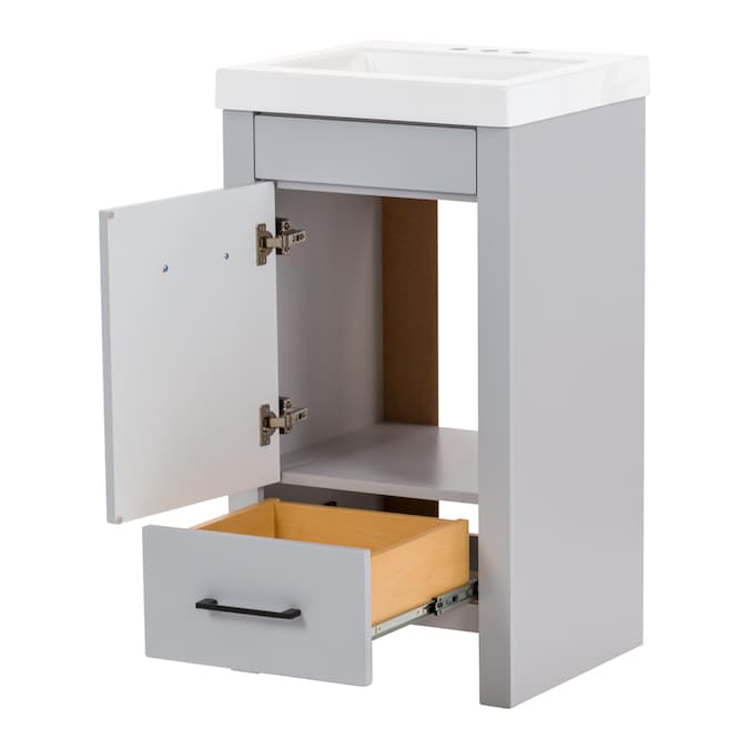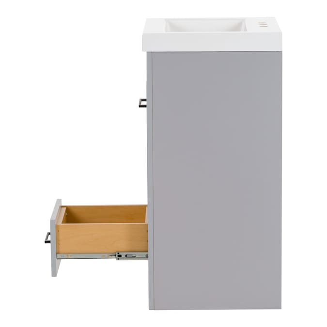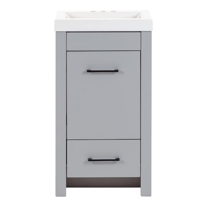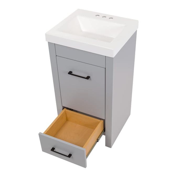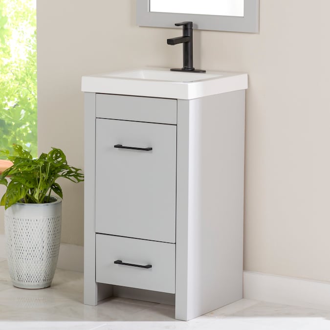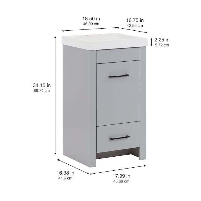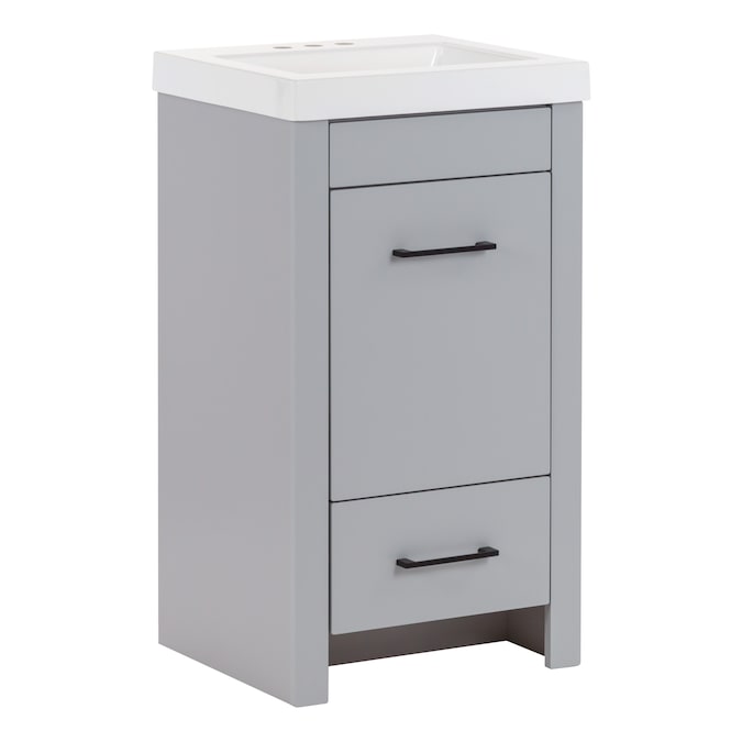 Add a modern accent to your bathroom with the Winnie 18.5-in pearl gray vanity with single-sink top. This freestanding vanity features flat panel door- and drawer-faces that are accented by slim black pulls for an elevated look. Finished in a cool-toned gray laminate, this vanity cabinet is complemented by a 1-piece soft white vanity top. And its soft-close 1-door under-sink cabinet and full-extension bottom drawer keep bathroom necessities organized and easily accessible. With its 18.5-in W x 16.75-in D x 34.15-in H size and integrated storage, this vanity adds style and functionality to small bathrooms and powder rooms.