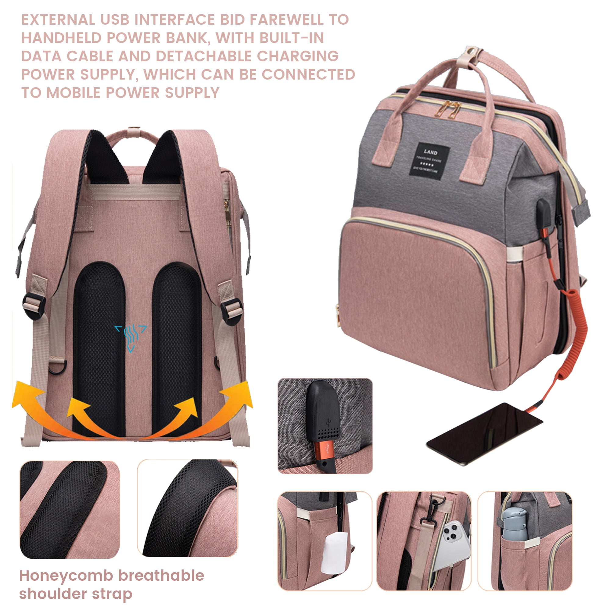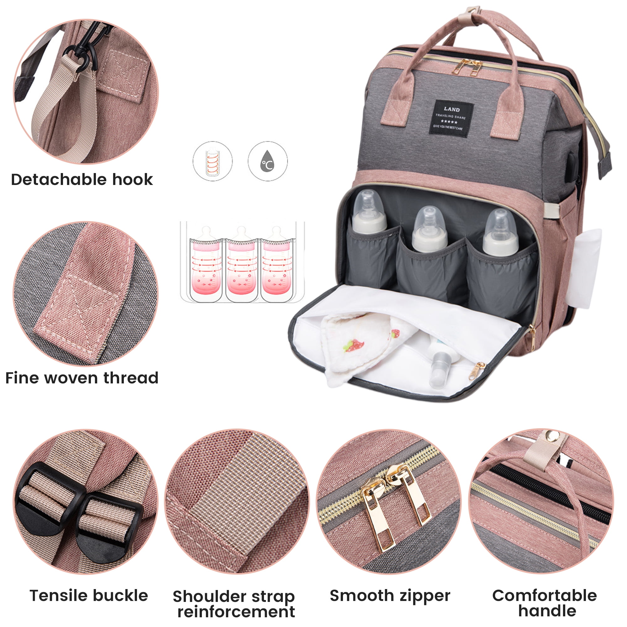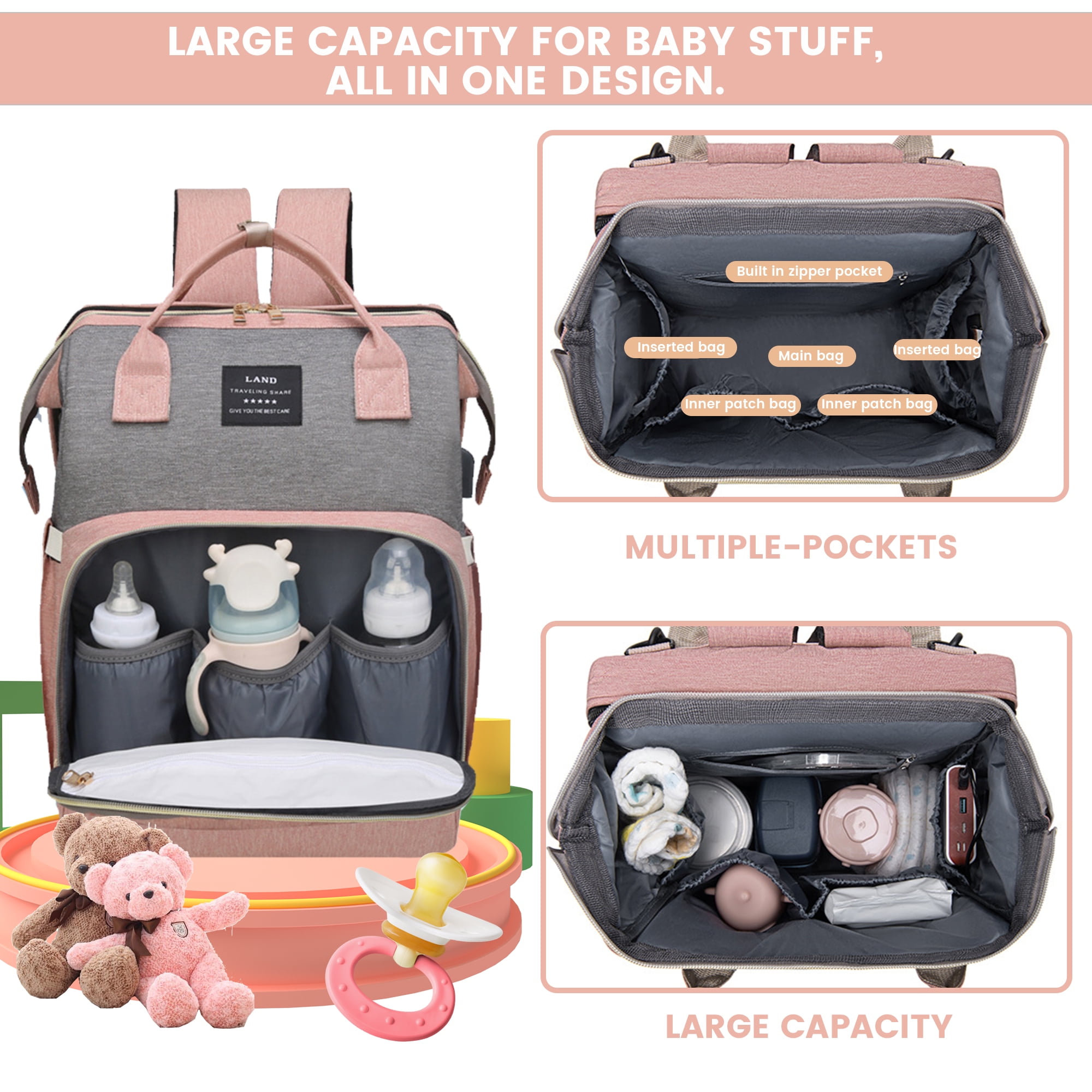 Diaper Backpack, Baby Diaper Bag Backpack for Boys& Girls, Large Capacity Baby Changing Bag w/ Foldable Crib & Insulated Milk Bottle Pocket – Waterproof and Stylish (Pink)