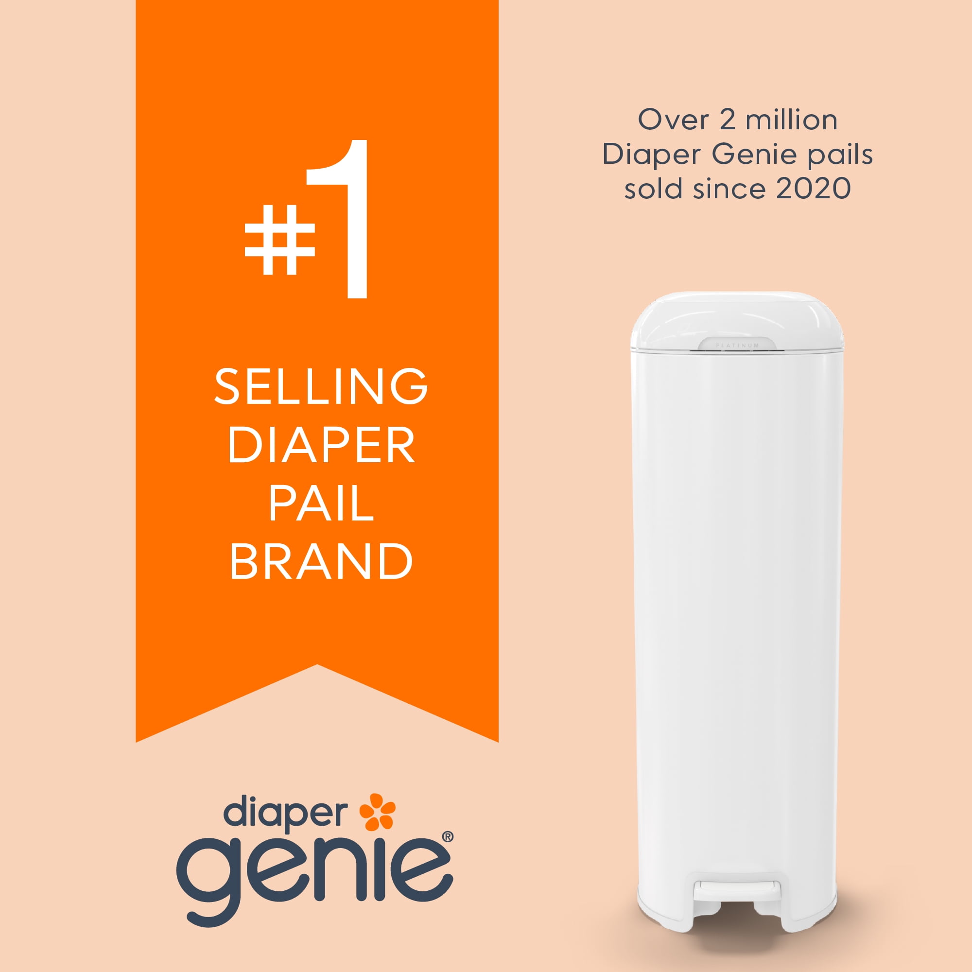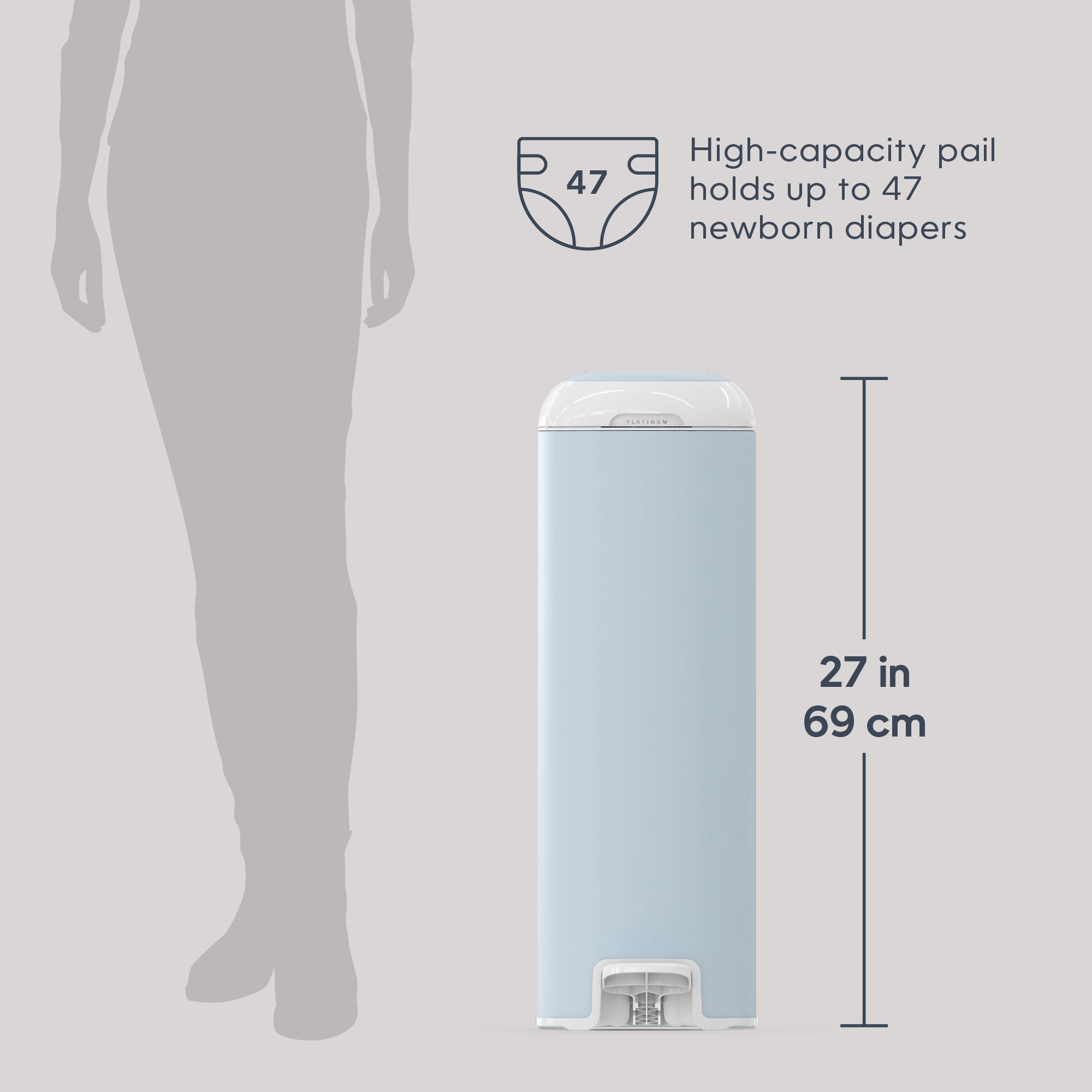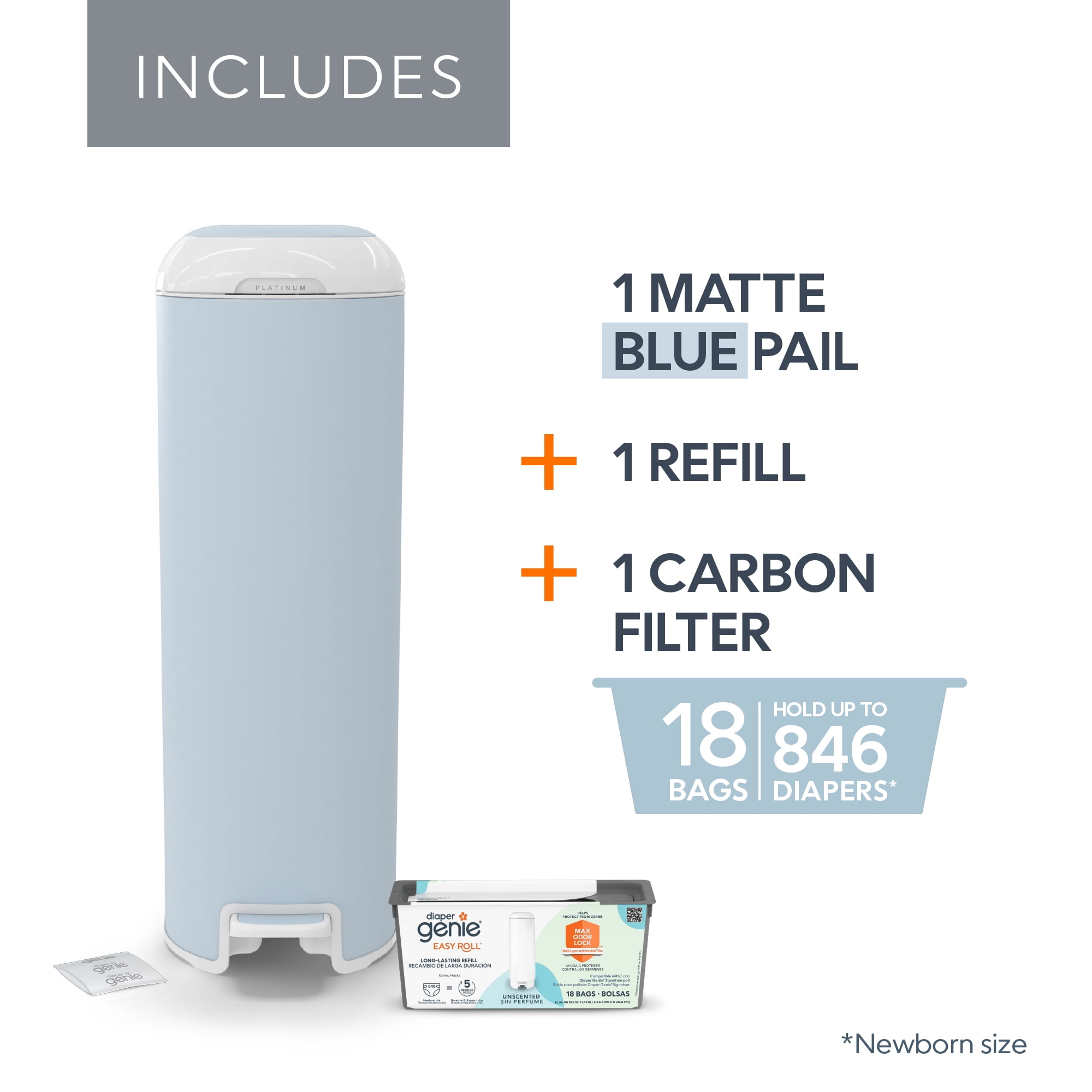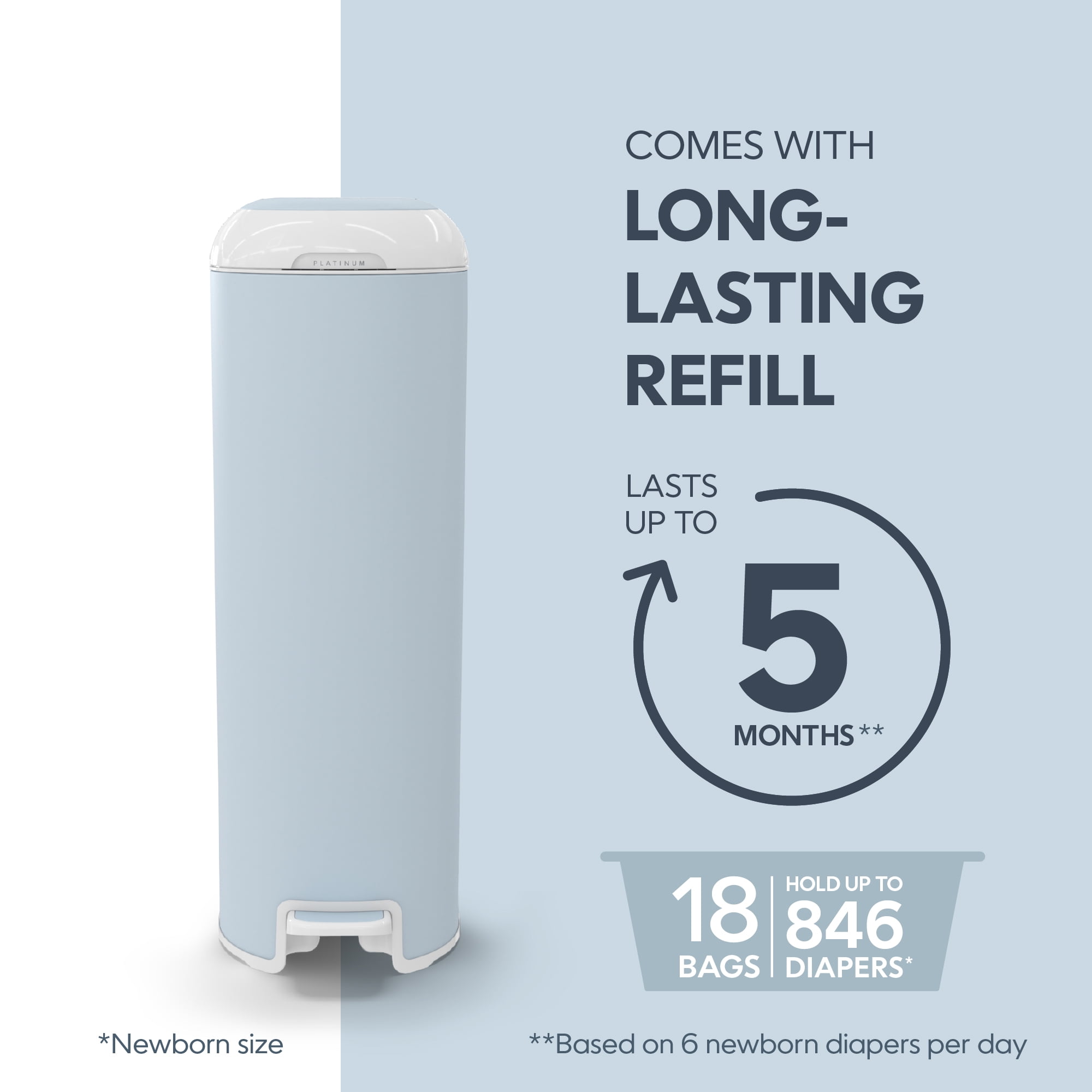Diaper Genie Platinum Pail, Stainless Steel Diaper Pail, Includes 18 Refill Bags, 5 Month Supply, Glacial Blue Keep your nursery smelling fresh – our new pail has odor-locking clamps that help prevent odors from escaping for ultimate odor control. Durable – Made of stainless steel. Soft-closing lid – less noise in the nursery while baby is sleeping. Ultimate convenience – pail has a foot pedal for easy one-handed operation. Wide disposal opening and capacity of up to 47 newborn diapers. Long lasting refill – pail comes with Easy Roll™ refill that holds up to 846 newborn diapers and lasts up to 5 months. Easy tear off bags – one Easy Roll™ refill contains 18 bags that are perforated, on a roll for convenient use and disposal. Better for the environment – one Easy Roll™ refill is equal to 3 Diaper Genie® round refills, which means less plastic being used. Available in 4 different colors. Compatible With: Easy roll refill