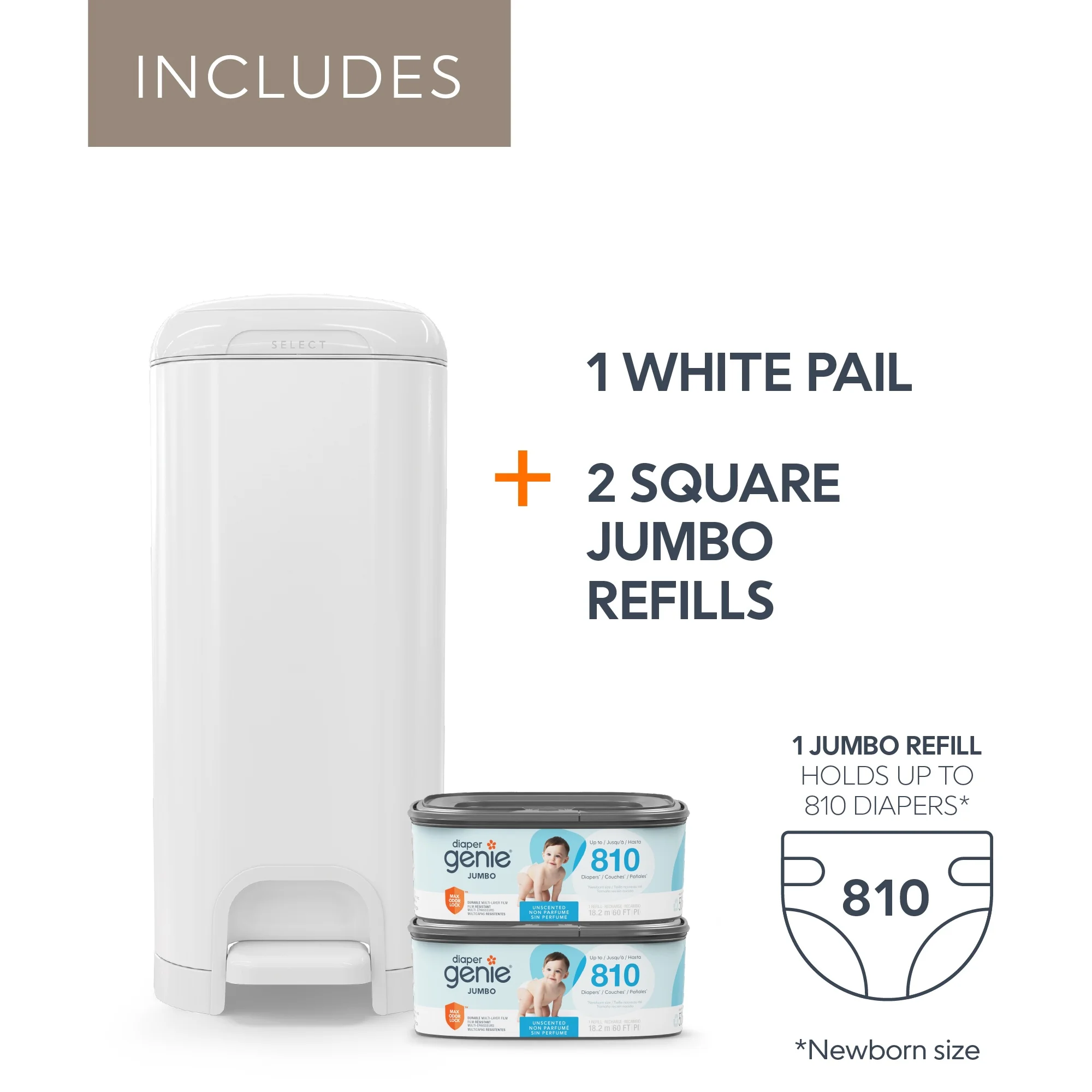 Diaper Genie Select Gift Set,White,Stainless Steel,1 Diaper Pail,2 Jumbo Square Refills-1620 Count, Infant