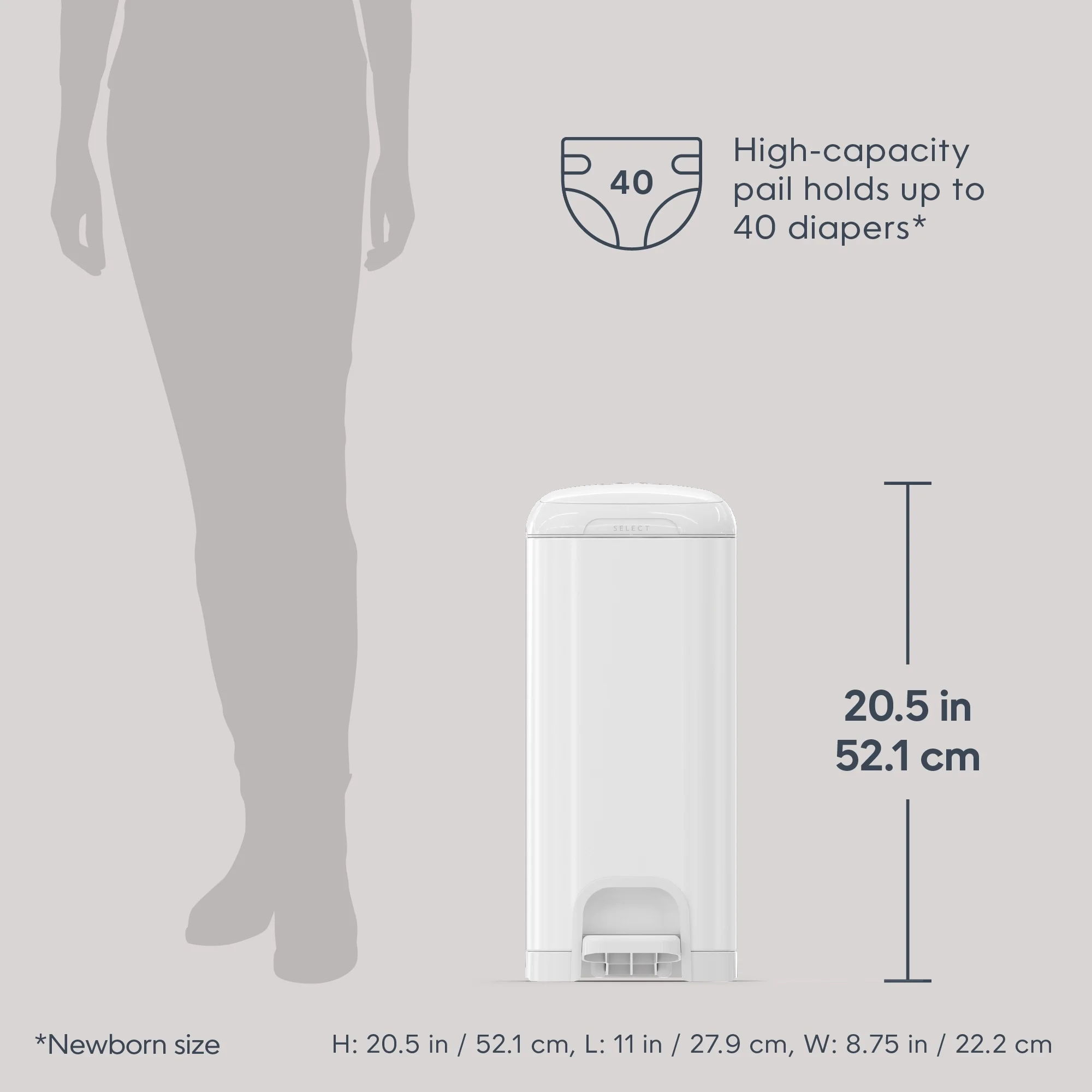 Diaper Genie Select Gift Set,White,Stainless Steel,1 Diaper Pail,2 Jumbo Square Refills-1620 Count, Infant Keep your nursery smelling fresh – holds up to 40 newborn diapers and features a Push N Lock clamp that helps prevent odors from escaping for ultimate odor control. Durable & Ultimate convenience – made of stainless steel and equipped with a foot pedal for easy one-handed operation. Soft-closing lid – less noise in the nursery while baby is sleeping. Product Length: 11.93 in Product Height: 22.05 in Product Width: 11.1 in Antimicrobial
