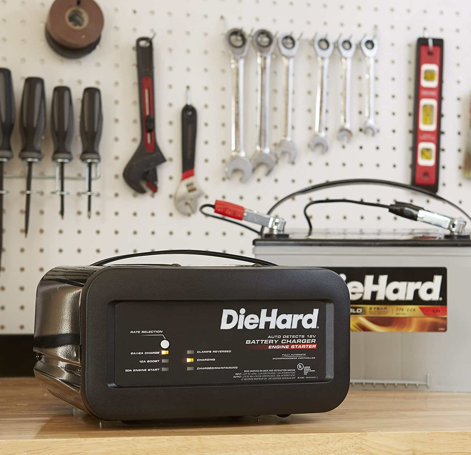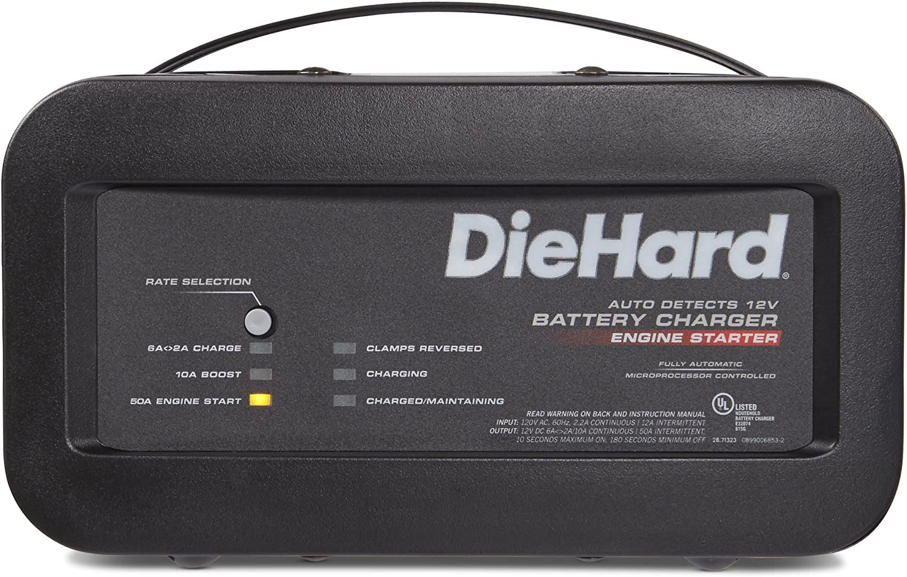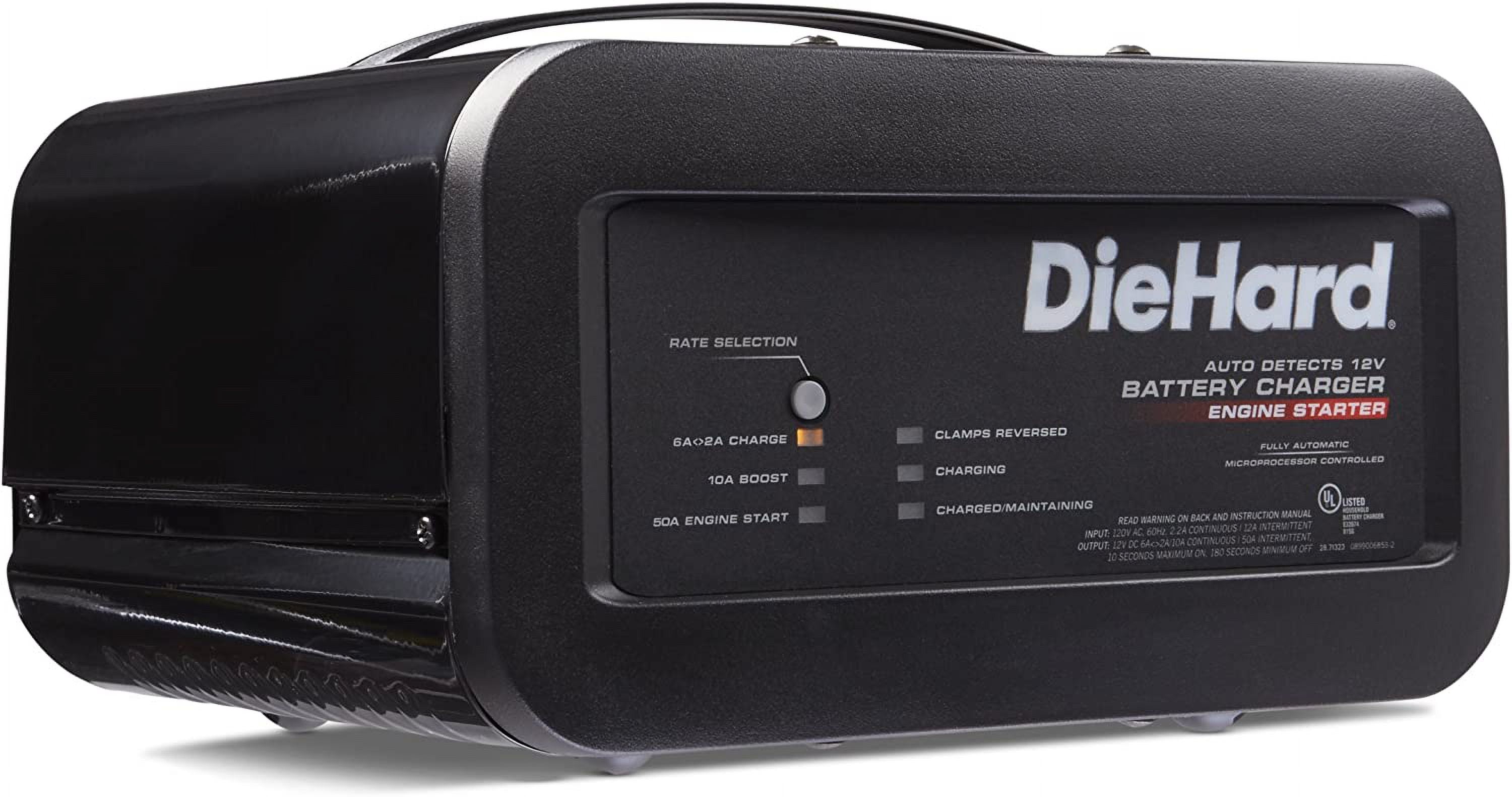 DieHard 12V 6A Automatic Battery Charger with 10A Boost & 50A Jump-Starting Capabilities Intelligent charge technology with multi-stage 12V 6A charging for enhanced precision, safety, and battery longevity Automatically detects 12V, making it suitable for various battery types Battery maintenance feature prevents overcharging Equipped with 10A boost and 50A jump-starting capabilities for quick power Reverse hookup protection ensures safe operation by preventing charger activation if clamps are incorrectly connected