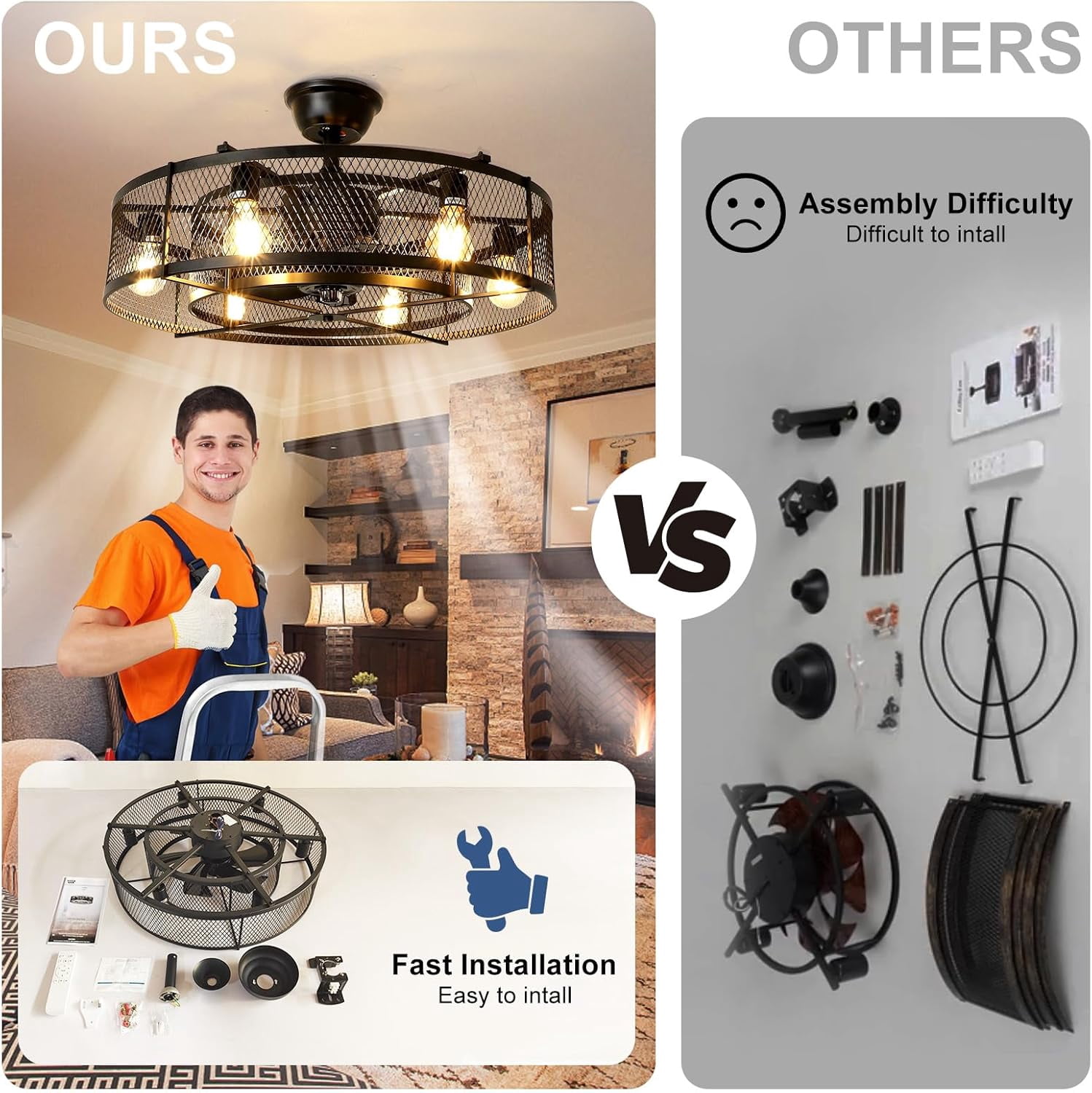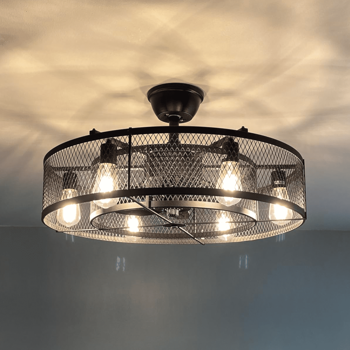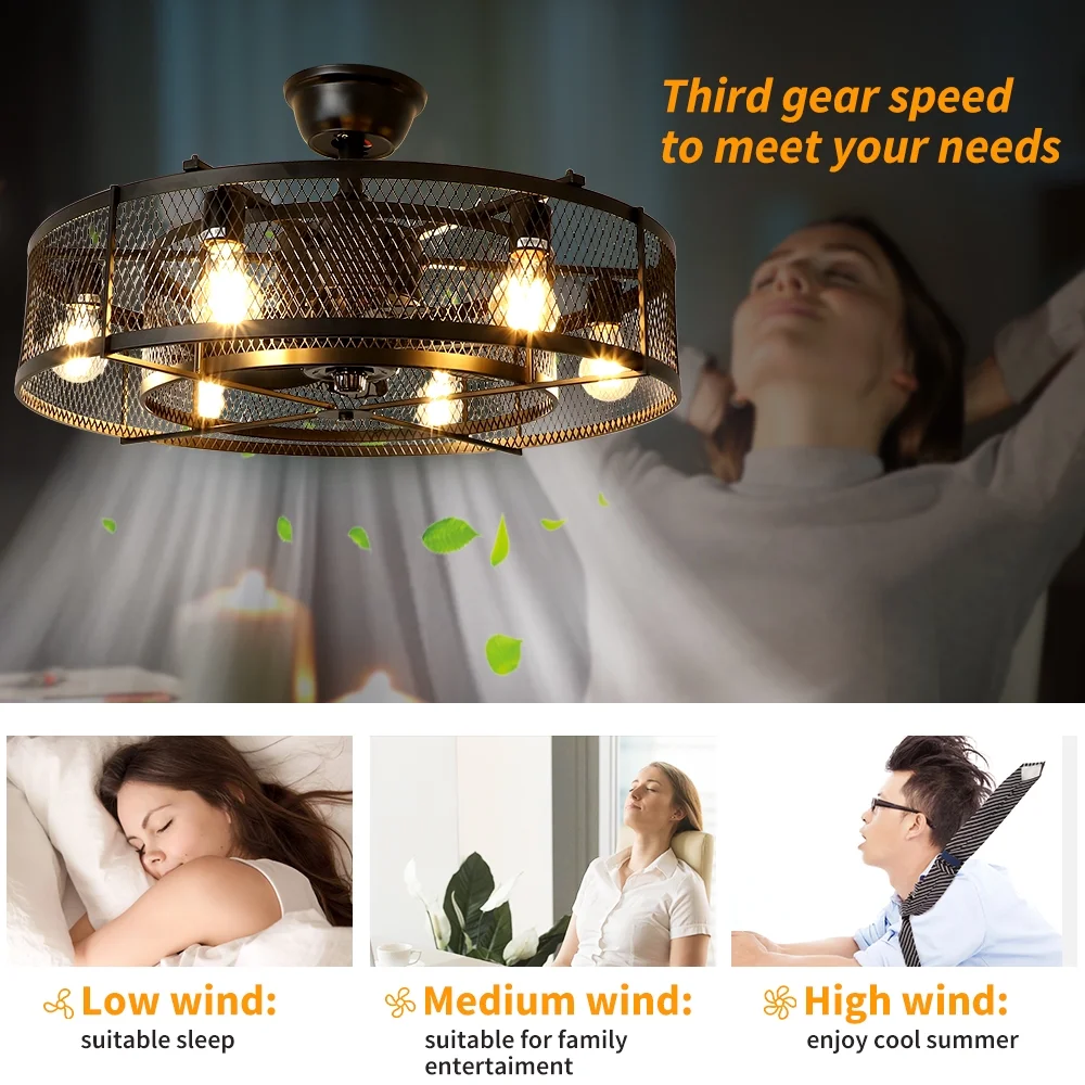 This beautiful ceiling fan offers such a unique aesthetic, bringing a calming warmth, yet rustic depth into the comfort of your home. Speed & Time Control: The flush mount ceiling fan lights fixture with 3-speed adjustment (low / medium / high) and 4 fan timing options (1/2/4/8H ), light and fans can be controlled individually by remote control. The 3 speed settings of your fan as well as the light output all from the convenience of an easy-to-use remote control. Controlling your fan has never been easier! Super quiet: This 26 inch fan light is insert with a silent pure copper motor, which can bring stable and strong power with noiseless. Unique and Safe design: This industrial/rustic caged ceiling fan looks very beautiful,it is enclosed with 6 ABS blades hidden in the cage to avoid accident caused by getting involved in the blades ,so it’s much safer than traditional fans. Wide Application: Fan dimensions 26 inch , which is perfect designed for medium to large sized rooms such as a bedroom, living room, dining room, basement, living room, kitchen, or any outdoor space. You can choose where it is installed according to your actual needs.perfectly decorate farmhouse, industrial, vintage, rustic and modern style homes. Material: Black iron metal case and ABS fan blades. Equipped with 6 E26 sockets bases (Bulbs NOT Included), widely compatible with LED, CFL, incandescent, halogen and Edison bulbs. Each bulb recommended maximum 60W. ( Please note:Not support dimmable bulbs) Installation & Customer Service: The product includes installation accessories and manual, remote control and installation instructions. And we provide 12 months quality assurance for our fan ceiling. If you have any question about the received products and need our help, please feel free to contact us.