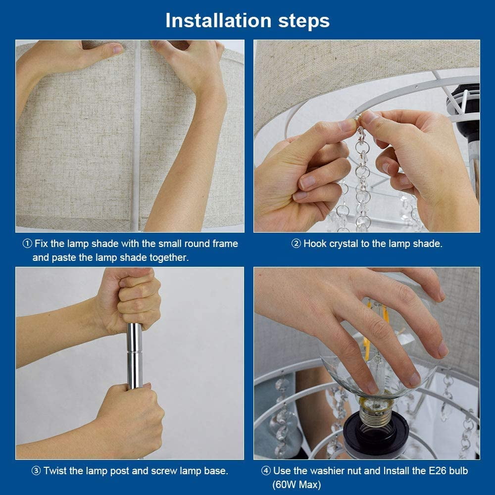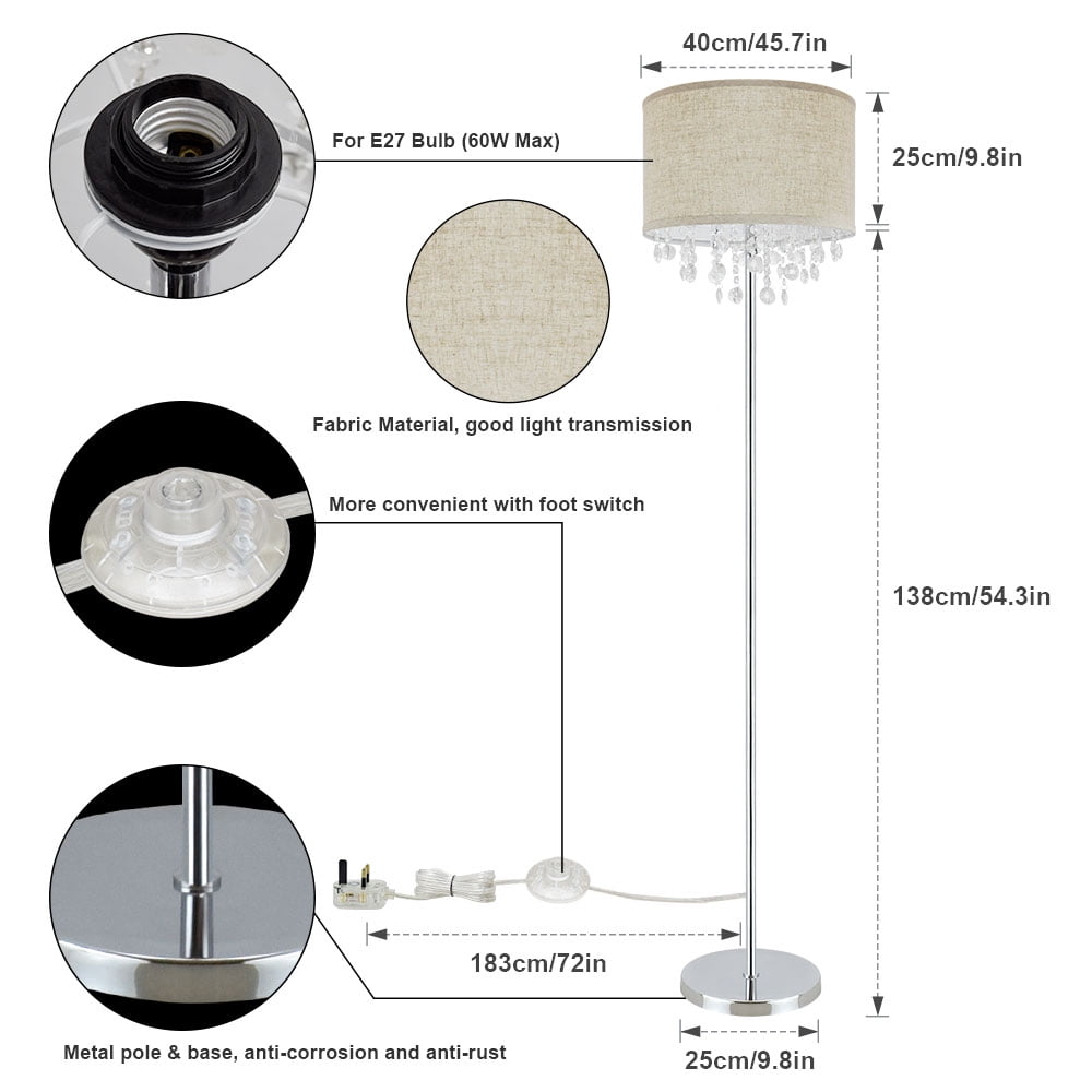 Why choose US Focus on LED Lighting over 12 years, owned factory, professional R&D and support team High Quality performance Super Bright but Energy Saving High Color Reflection, reflect real color and Eye-caring Quick Response Customer Service The retro glam floor lamp designed with crystal very beautiful and elegant, so it can make your home more stylish. Foot switch feature of tall trendy floor lamp is more convenient to switch the light on/off . Safe for Children & Pets: The lamp pole tall is 64 inch and lamp base is metal, thick and stable, great lamp to stand up over the living room or kids bedroom sectional there is no easy to fall, support the lamp body, safely around kids and pets. Bulb Requirement: E26 type light bulb (60W Max). The trendy floor lamp only draw a mere 9 watt, warm light, 3000K, 720Lumens, 20,000 hours, it can be used by ordinary family for 20 years. So there is no need to replace bulb, saving money and energy. Easy to Install: The lamp has simple structure and everything is included in it, so you can assemble the lamp easily and quickly, and the crystal can be hung according to your own idea or crystal length and short, arranged from inside to outside. Customer Service: We offer full 12 months quality assurance, 60 days refund for quality. If you are not satisfied with our products, please feel free to contact us, our service purpose is to satisfy customers.