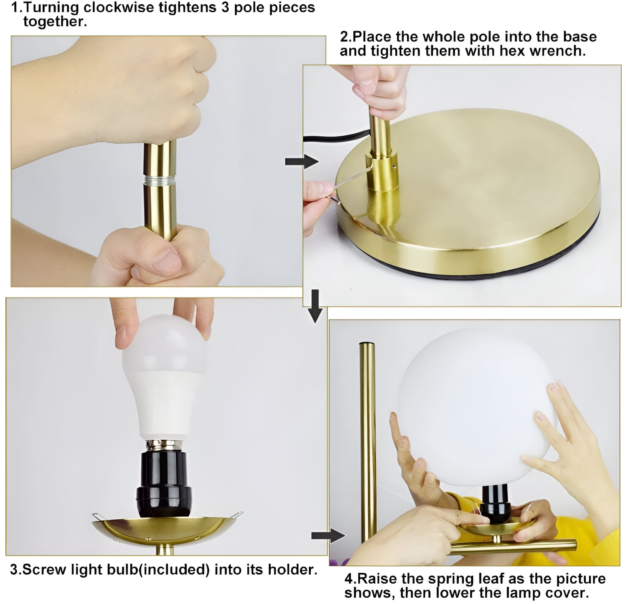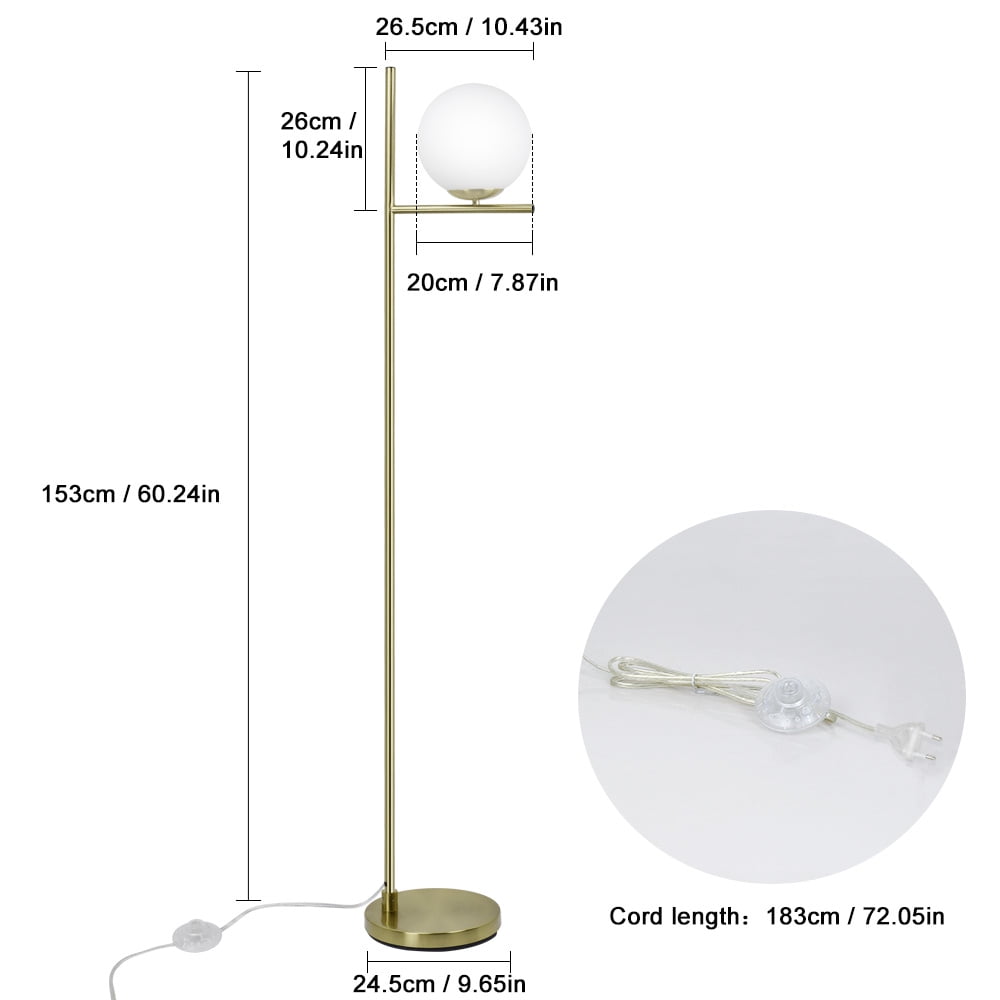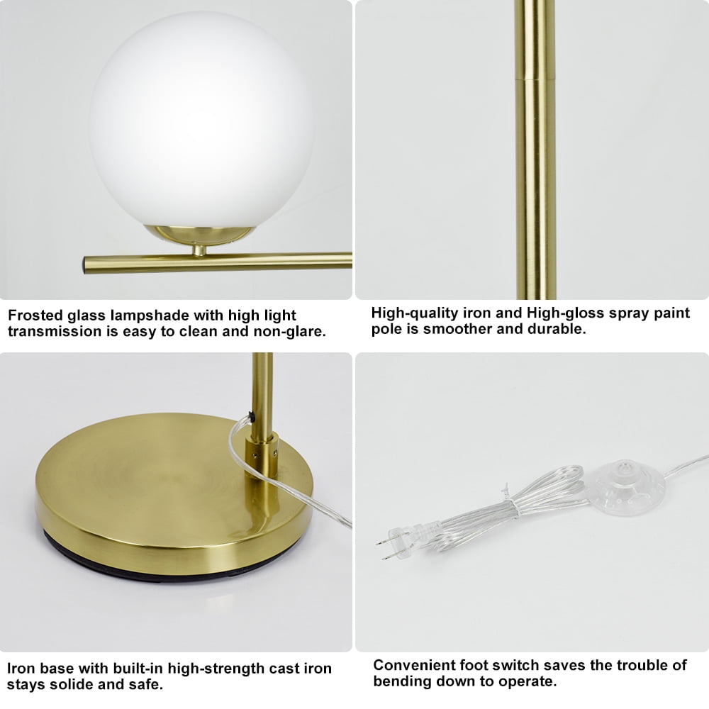 Why choose US Focus on LED Lighting over 12 years, owned factory, professional R&D and support team High Quality performance Super Bright but Energy Saving High Color Reflection, reflect real color and Eye-caring Quick Response Customer Service Glass Lampshade: Selected high quality material, this modern floor lamp gold have great light transmission, create a warm and comfortable atmosphere for your home. The convenient foot switch allows you to tap the lamp on or off with your foot. Elegant & Unique Design: Our globe floor lamps has a stable base to provide maximum stability, so that it would be free and safe around children and pets.In addition, Lunar frosted glass with high light pole, looks very elegant that is a very good decoration in the home. Bulbs Requirment: This gold stand up lamp includes 9 watt LED light bulb, it not only provides sufficient brightness, but also has a eye caring function while you are reading or working, you never have to replace a bulb and save more energy in comparison to halogen or incandescent bulbs.(bulb can be replaced with other bulbs, 60 watt max) Easy to Install: The tall pole lamp is easy to install quickly, and all instruction manual included with the package. Perfect for your living room, bedroom, office, nursery and kids room as Christmas & New Year gift. Customer Service: We provide 12 months quality assurance for our products. If you have any questions about products and need our help, please feel free to contact us.