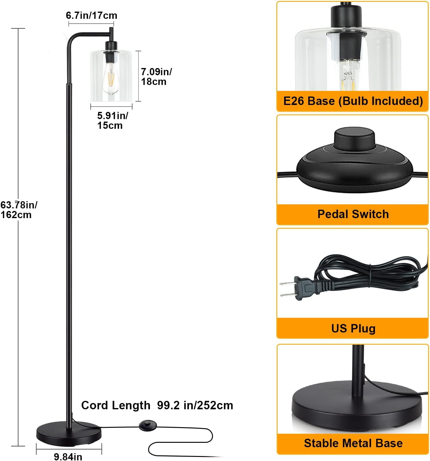 Why choose US Focus on LED Lighting over 12 years, owned factory, professional R&D and support team High Quality performance Super Bright but Energy Saving High Color Reflection, reflect real color and Protect your eyes Quick Response Customer Service This modern and industrial floor lamp features a sleek, black metal frame with a glass shade and an Edison-style bulb, creating a warm and inviting ambiance. The adjustable height allows you to customize the lighting to suit your needs, whether it’s illuminating a living room, dining area, or home office. With compatible E26 sockets, you can choose from a variety of bulb types to achieve the perfect lighting solution. Crafted with quality materials and backed by a 12-month warranty, this floor lamp is a versatile and stylish addition to any space. Industrial Design: This Industrial floor lamp combine Nordic Minimalism design, perfect decor for industrial, farmhouse, vintage, rustic, and modern rooms. Add a vintage for your living room or bedroom. Clear Glass Lamp shade: Our standing lamp is made of high-quality glass lampshade that is high temperature resistant. The glass doesn’t heat up, so you won’t burn yourself when you touch it. Enjoy this cozy reading light that creates a comfortable space beside your book chair, a great alternative to overhead lights. Safe for Children and Pets: Our black floor lamp comes with a weighted base and sturdy, would not be easy to fall down, safe around children and pets. A Bulb Included: Our modern floor lamp comes with E26 Standard Base(8W Bulb Included) You could use different shapes and colors of bulbs to create the perfect ambiance you prefer. Change the Bulb, Change the Look.(Please Note: Only for E26 bulbs, 60W max) Tip: The included bulb is not dimmable, but it can be replaced with a dimmable bulb Easy to Install: Our industrial standing light has simple structure, just minutes to build, even if you’re not handy. The total height of the floor lam is 64 inches. Customer Service: We are committed to creating better service for you. We offer 12 months warranty. If you have any questions about this fixture, please feel free to contact us. Upgraded Package: Our packages adopt foam shock-absorbing packaging, in order to reduce damage caused by transportation. If you received damage package or damage item, please contact us. We will provide solution as soon as possible. Product Details: Brand DingLiLighting Color Black Material Metal Style Modern / Farmhouse / Industrial Light fixture form Floor Lamp