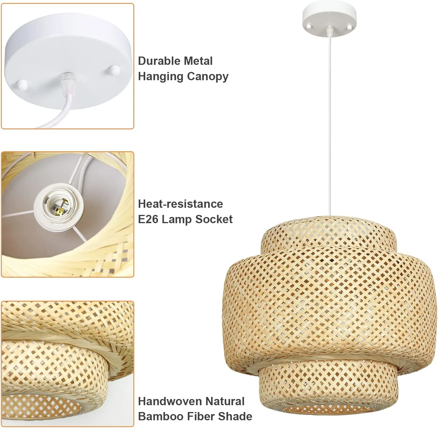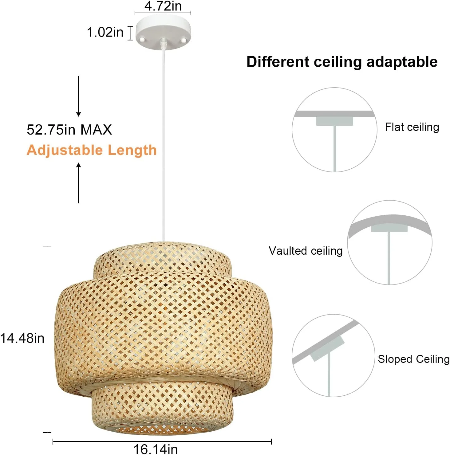 Why choose US Focus on LED Lighting over 12 years, owned factory, professional R&D and support team High Quality performance Super Bright but Energy Saving High Color Reflection, reflect real color and Protect your eyes Quick Response Customer Service Elevate your space with this stunning DingLiLighting Rattan Pendant Light. Crafted from natural bamboo, each hand-woven shade offers exceptional durability and an environmentally friendly design. Featuring a versatile domed shape, this adjustable pendant light is compatible with a variety of bulbs up to 60W, including energy-efficient LED and dimmable options for a warm, relaxed ambiance. Easy to install with all necessary accessories included, this pendant light is ideal for illuminating kitchen islands, dining areas, living rooms, and more, providing a touch of rustic charm to any decor. Backed by a 12-month quality assurance and 30-day refund policy, this pendant light is a reliable and stylish choice for your home. Natural Bamboo Material: The rustic bamboo pendant lamp shade is made of natural bamboo, and each lamp shade is hand-crafted. Hot dispassion, High temperature resistance, not easy to fade, environmental friendly. Indoor & Outdoor Usage: The unique lampshade with natural feature is an eye-catching addition to any space. This chandelier is ideal for use in multiple scenes, such as kitchen island, dining table, sofa or hallway, cafe, basement, corridor, stair, bar, office, entrance, bedroom, throwing nice warm light for your home. Bulb Requirement: This farmhouse light has US standard E26 socket, compatible with variety of bulbs(60W Max), such as LED, INCANDESCENT, CFL. We recommended Edison bulbs for pretty lighting effect. (Please Note: Bulbs Not Included). Light Color Dimmable: This ratten pendant light also compatible with dimmer, you could use dimmable bulb to create the warm and relaxed state atmosphere for your preference. (Please Note: Dimmer switch buy separately). Adjustable Height: This bamboo pendant light is suitable for both flat and sloping ceiling.The package comes with a hanging cord. Hanging cord adjustable from 0″ to 52.75″. You can adjust the hanging height of the bamboo light according to your need. Easy Installation: The woven pendant light fixture is easy to install. All necessary accessories and instruction for quick and easy installation are included. Customer Service: DingLiLighting is committed to creating good lighting for you. We offer 12 months quality assurance, and 30 days refund for quality. Any questions about this basket chandelier, please feel free to contact us. We will solve your problem as soon as possible. Upgraded Package: Our packages adopt foam shock-absorbing packaging, in order to reduce damage caused by transportation. If you received damage package or damage item, please contact us. We will provide solution as soon as possible. Product Details: Brand DingLiLighting Material Metal, bamboo Style Modern / Farmhouse / Industrial Light fixture form Ceiling Warm tips: If you don’t know how to install the light or fan, please refer to a licensed electrician. We would contain installation video and setup progress in the instruction. Please cut off the electricity supply before you install it. Please install in the dry environment. Please feel free to contact us with any questions. Our customer service team will reply as soon as possible.
