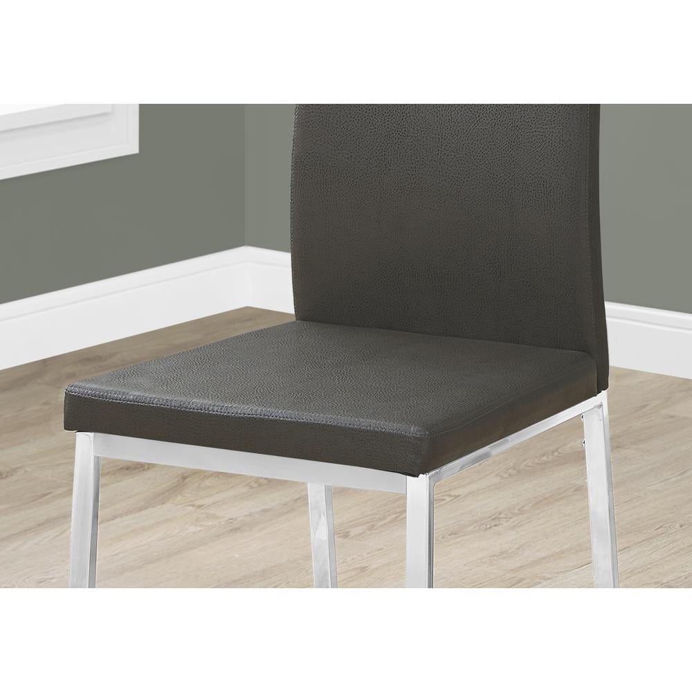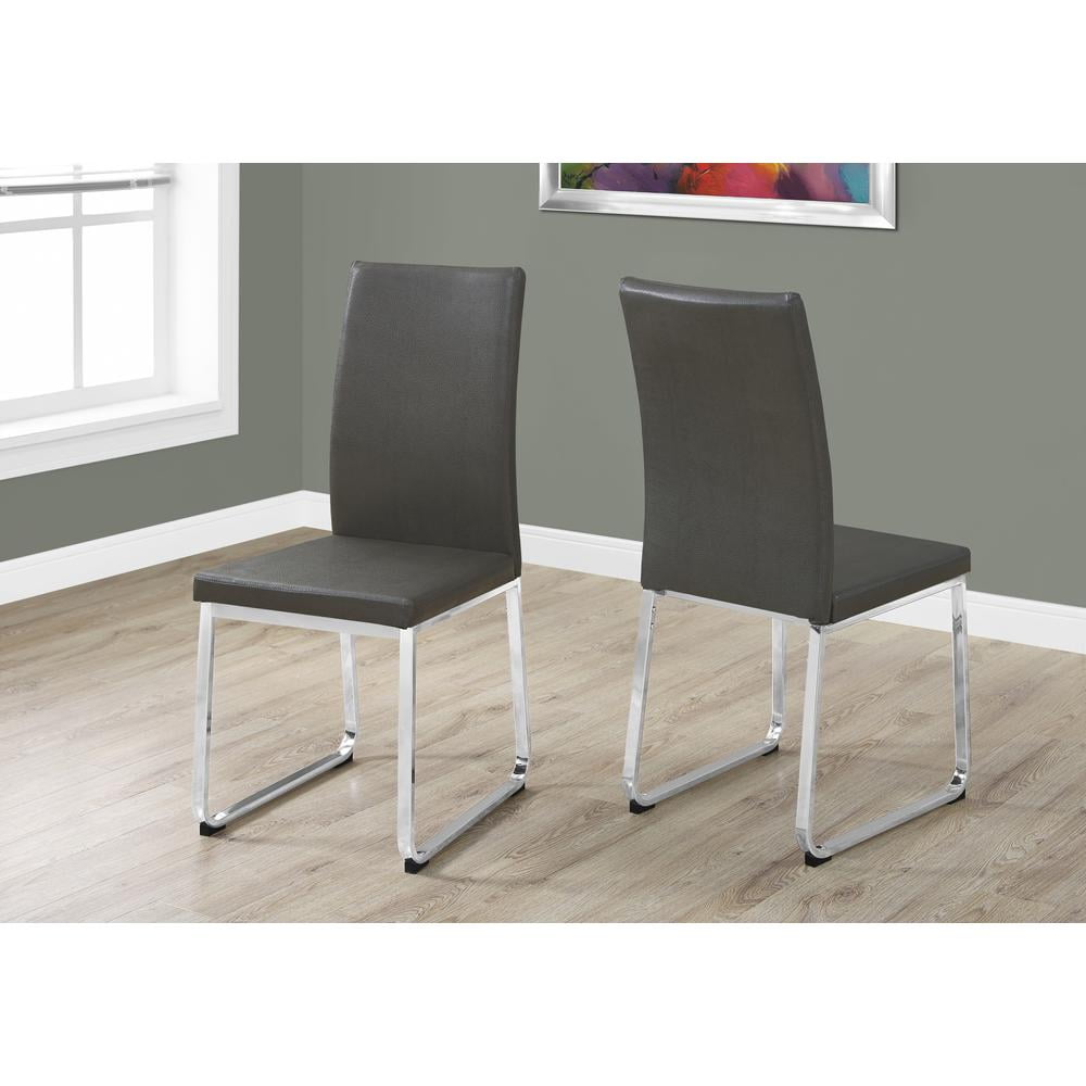 Finish: Gray Material: Polyurethane, Foam, Chrome Metal Set of 2 chairs in a chic and modern Gray and chrome finish Comfortably padded seat and back Sleek, stylish chrome metal legs Upholstered in an easy to clean leather-look material