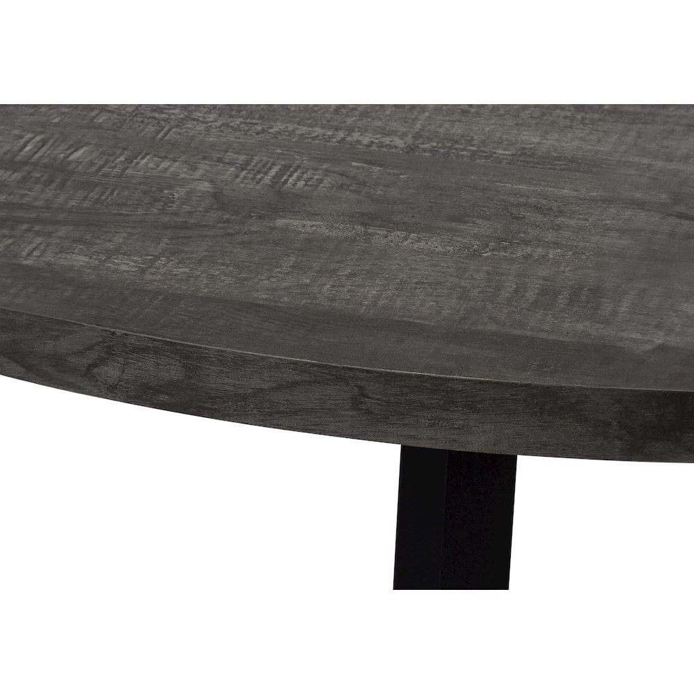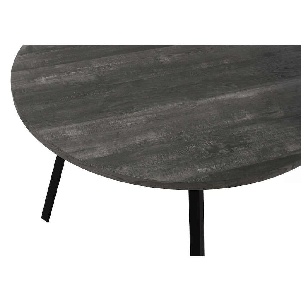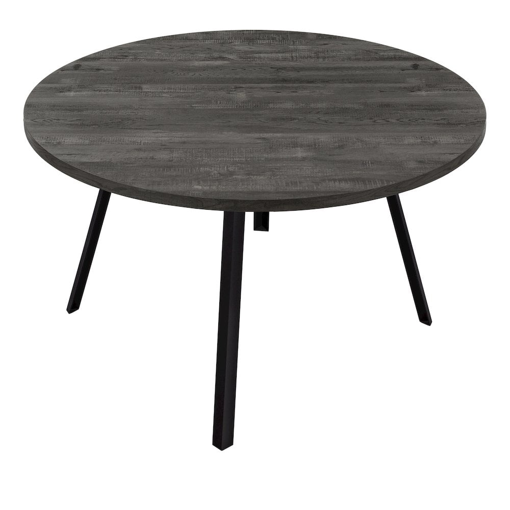 Finish: Reclaimed Black Materials: MDF, Laminate, Metal, and Particle Board Style: Contemporary and Industrial Mid-century inspired, contemporary round dining table for a casual kitchen or dining space Seats 4 people comfortably when eating or entertaining Warm black reclaimed wood look laminate tabletop, with contrasting slanted black metal legs for a sleek design Compact size ideal for small homes, condos, and apartments where space is limited but you still want style