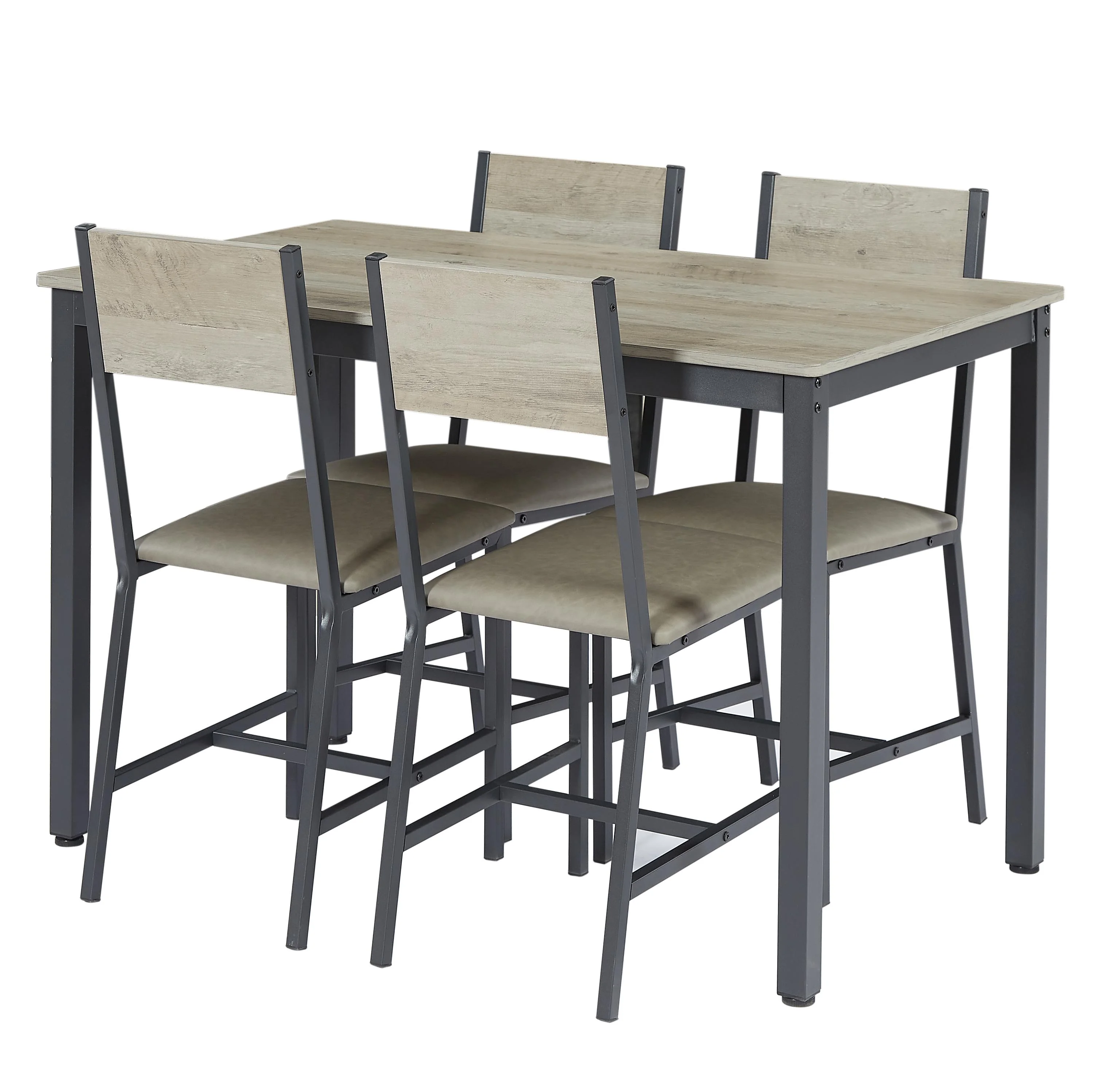 Dining Set for 5 Kitchen Table with 4 Upholstered Chairs Product Information Product Type:Dining table set 5Pcs Color:Rustic Brown, Black Material:Particleboard, Steel, PU, Sponge Table Size:47.2” L x 27.6” W x 29.7” H Chairs Size:15” W x 15” D x 34.3” H Max. Static Load Capacity of the Table:250 lb Max. Static Load Capacity of Each Stool:350 lb Package number:1 Package Contents:1 x Dining Table, 4 x Chair, 1 x Accessory Kit 1 x Instructions The simple lines and Vintage Wooden tabletop create a stunning visual effect allows you to use it in various scenarios, perfect as a dining table, computer desk, desk, writing desk or soho workbench, industrial DIY workbench, it is your faithful friend. Thanks to the detailed instructions and clearly marked parts, you can assemble this set of tables and chairs in no time, and after that, the great dinner can begin!