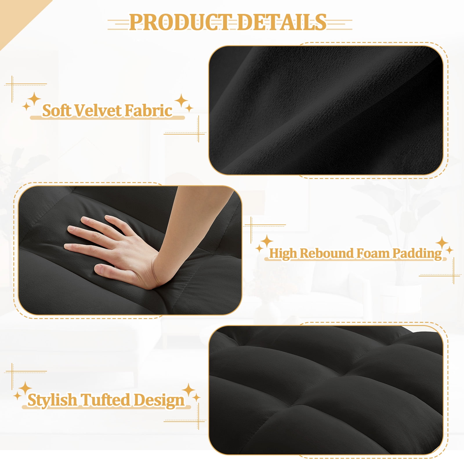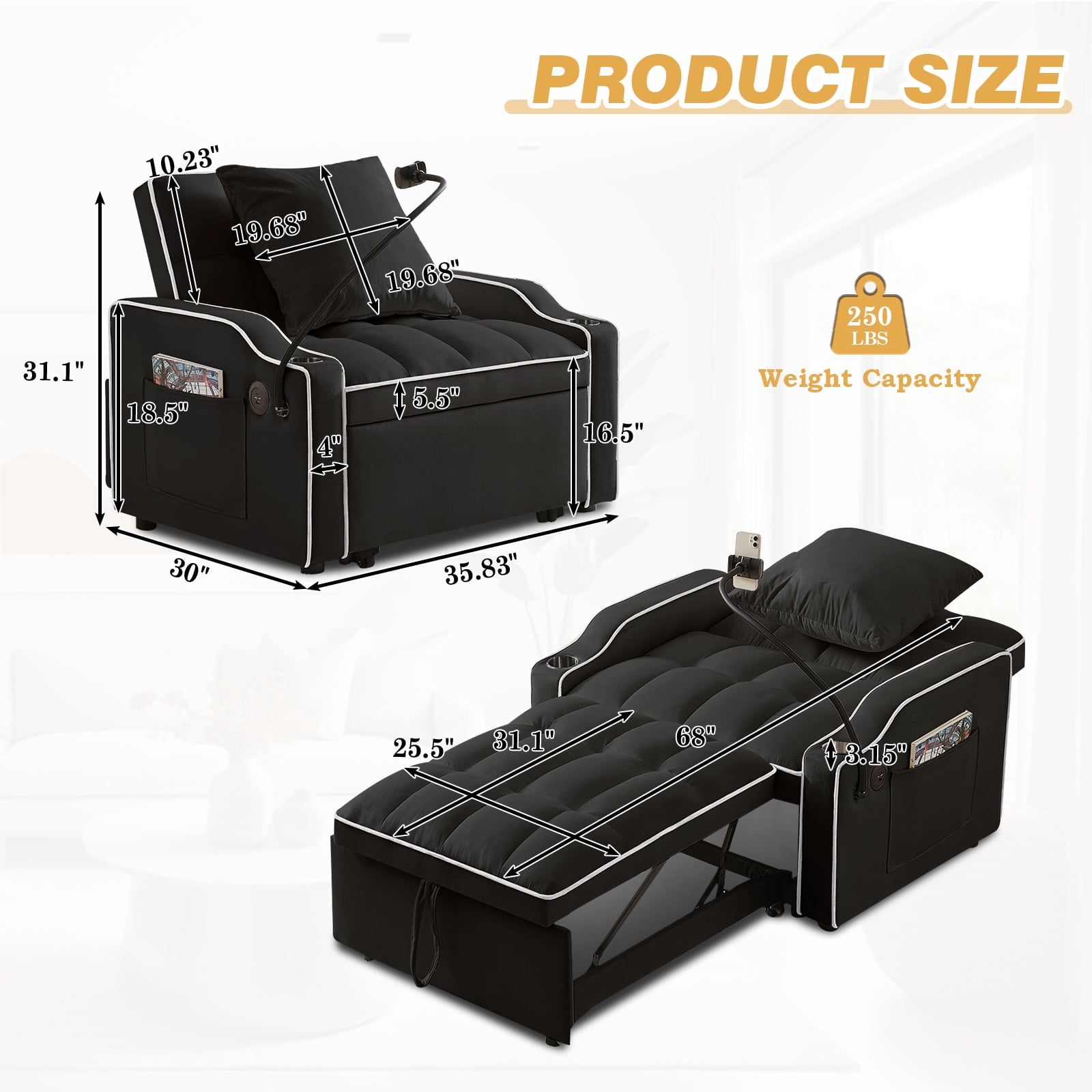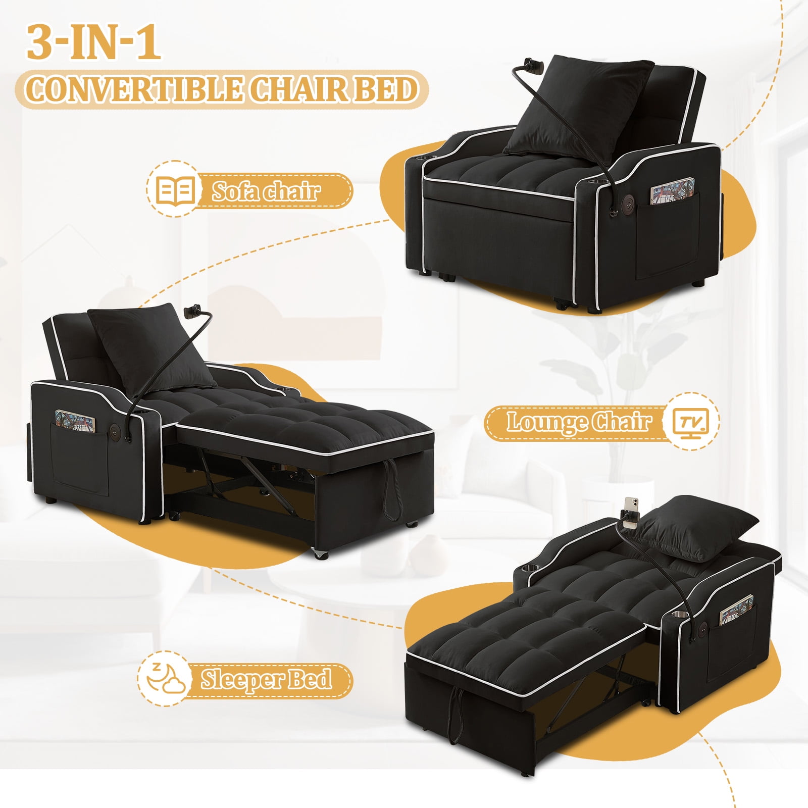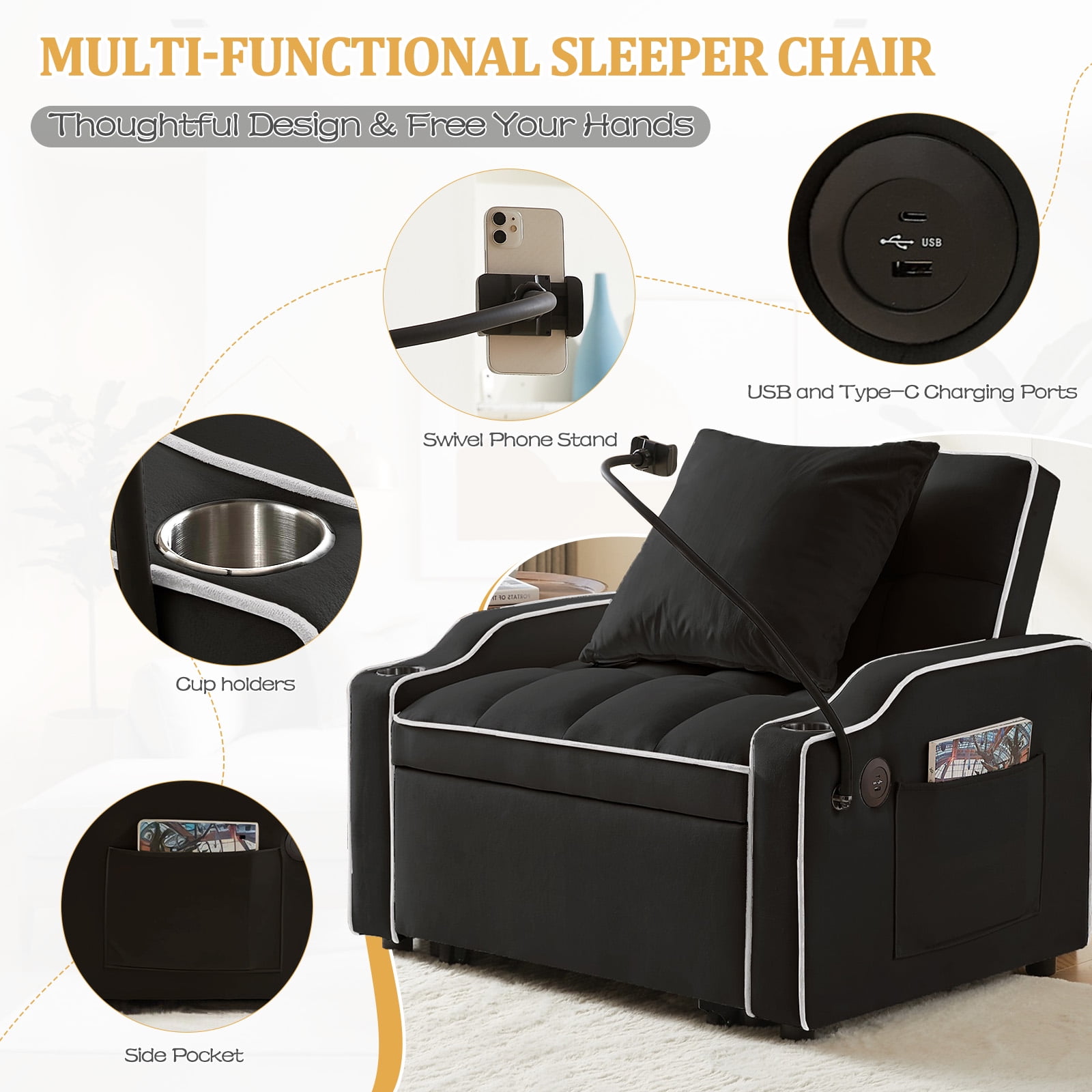 3-in-1 design, can realize the quick conversion from sofa chair to lounge chair and then to bed Adjustable backrest in three positions: 110°, 140°, 180° Equipped with USB and Type-C charging ports, convenient for you to charge at any time Equipped with a swivel cell phone holder to free your hands Two cup holders and side pocket for extra convenience Comes with a pillow for extra support and comfort Soft velvet fabric with high rebound foam for a comfortable seating experience Stable and sturdy wood and metal frame with a weight capacity of 250 lbs Understated, classic design adds unique style to your home Multi-scenario, suitable for dorms, apartments, studios, offices, etc. Easy to install, installation instructions and tools included Dinosisco 3-in-1 Convertible Chair Bed/Sleeper Chair for Adults Product Type: Convertible Sleeper Sofa Chair Seating Capacity: 1 Fabric: Velvet Colors: Gray/Black Back Type: Adjustable Back: 110°, 140°, 180° Weight Capacity: 250lbs Overall Size: 35.83″L x 33.86″W x 31.1″H Bed Size: 69.3″L x 24″W x 16.14″H Product Care: Spot clean with a damp cloth and mild soap