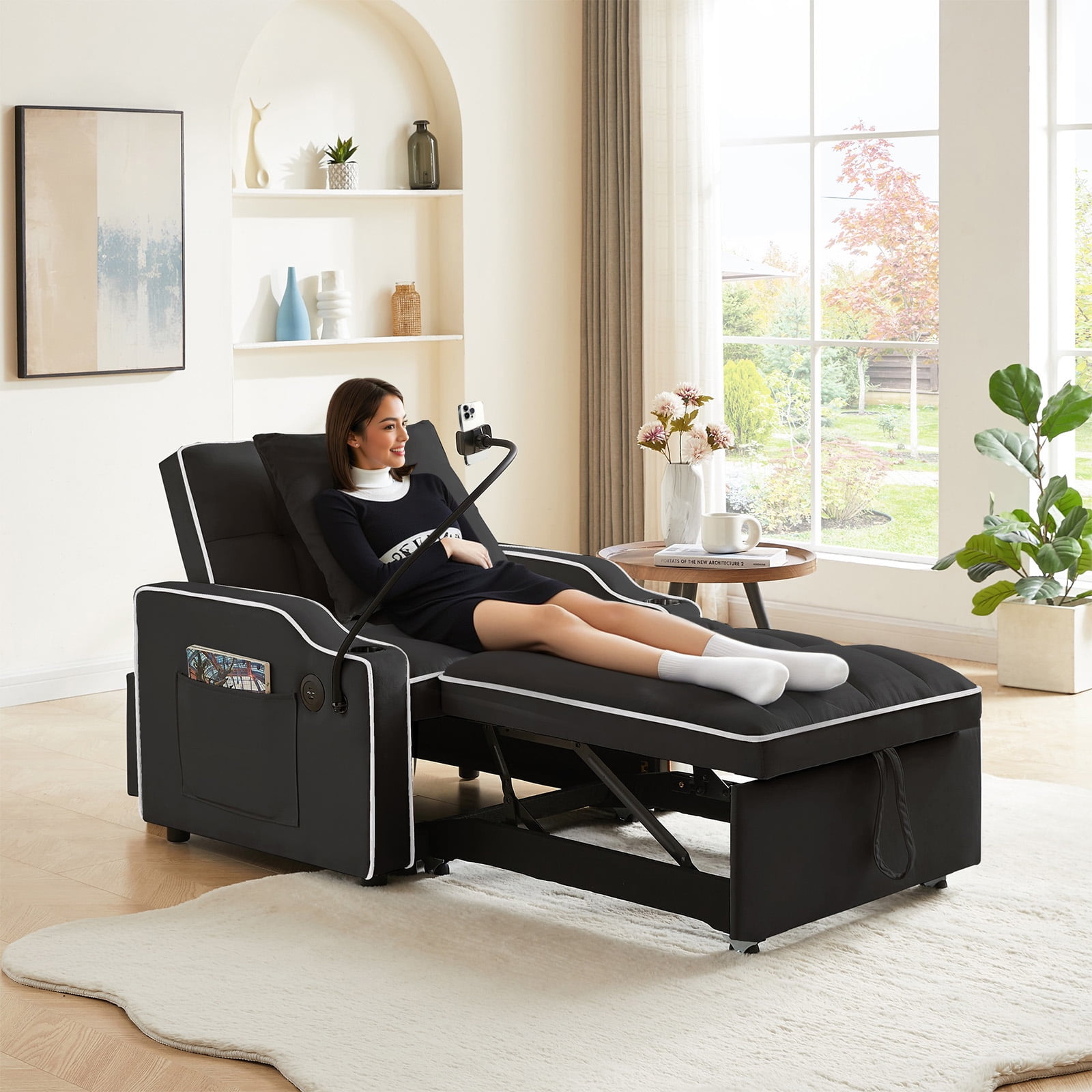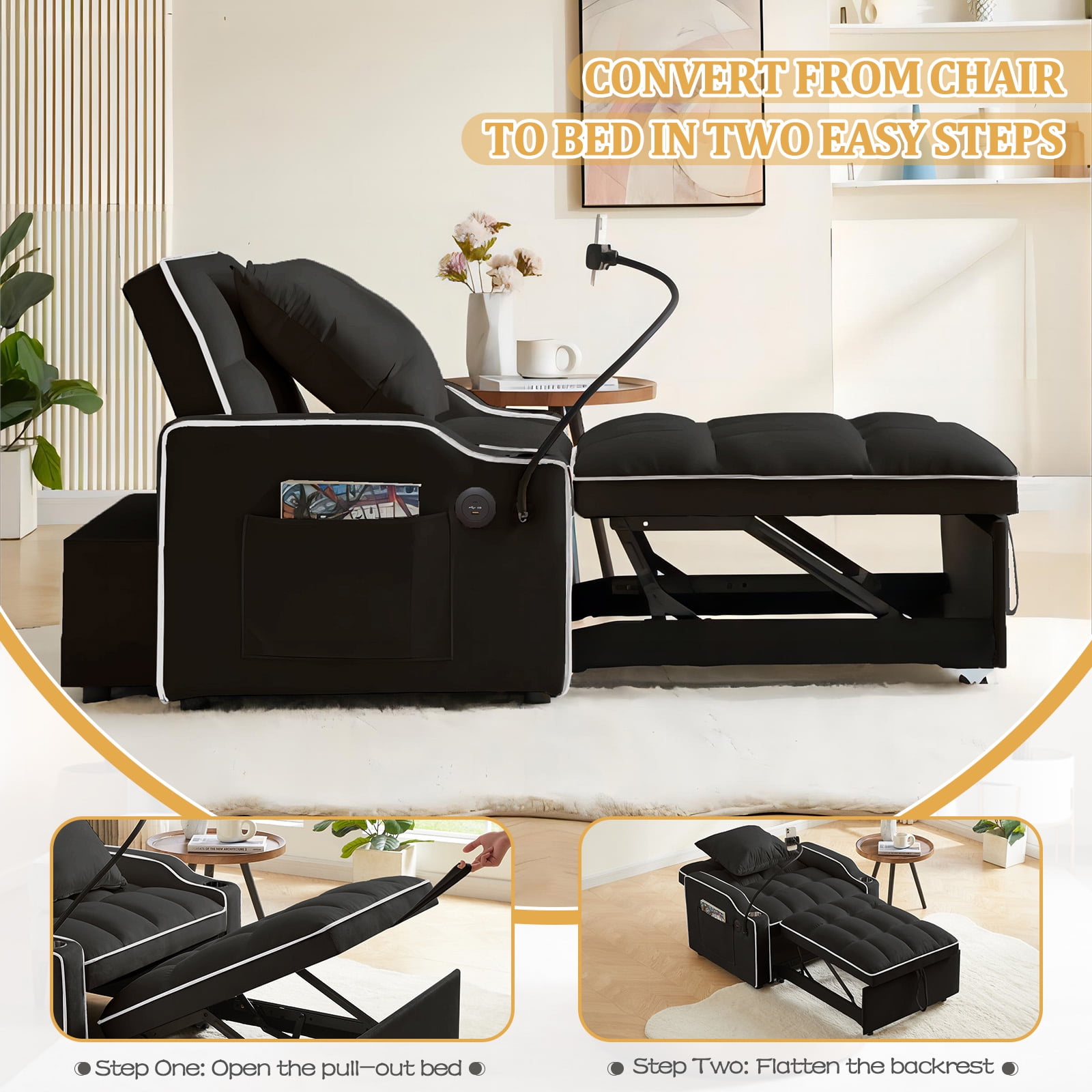 Lunale 3-in-1 Convertible Sleeper Chair Bed with Charge Ports & Phone Stand, Black Velvet
