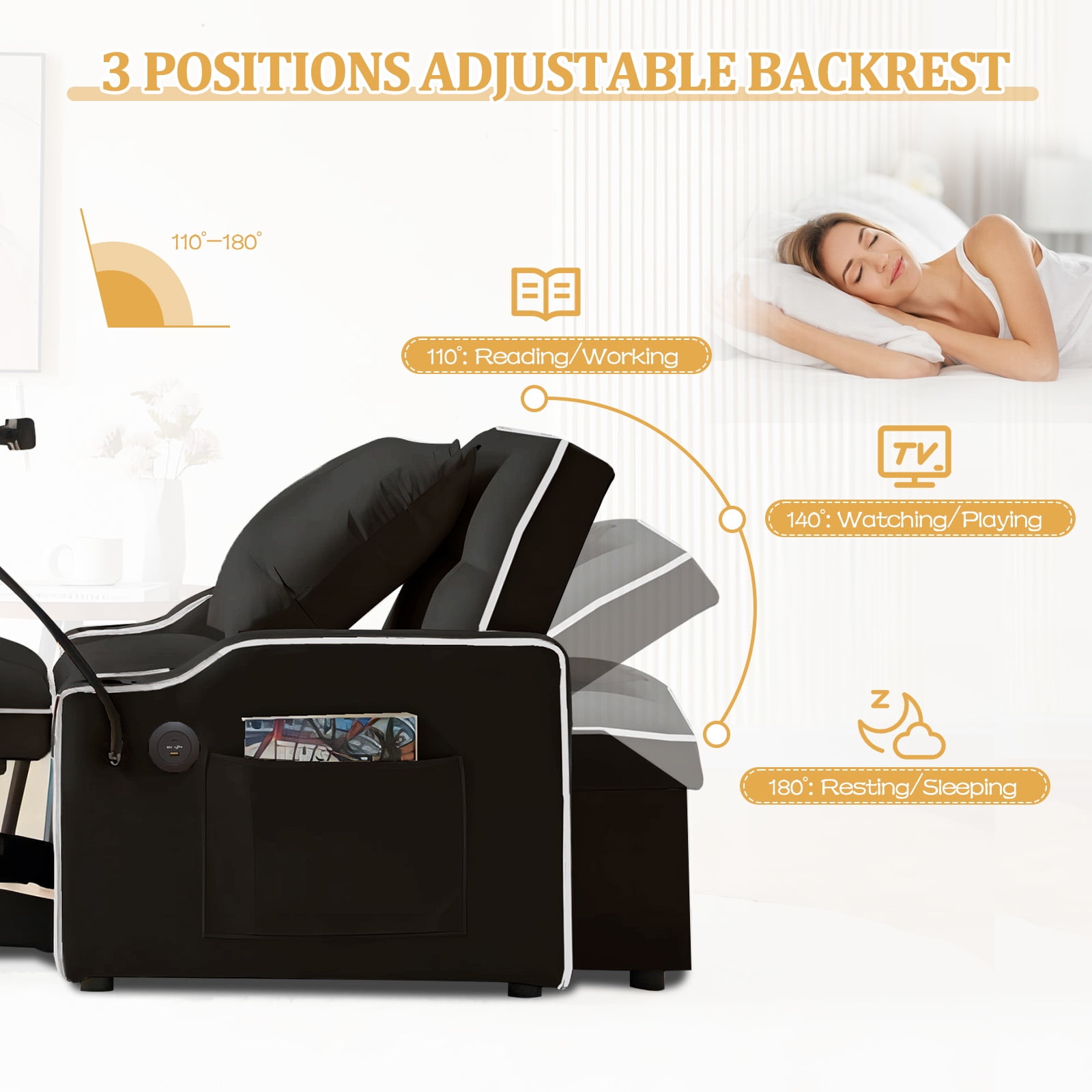 3 Forms for Easy Conversion, 4 Functions for Total Enjoyment – -All in One Dinosisco Chair Bed! Not only will it be the perfect companion for your leisure time, it will also provide you with all-day comfort. Use its chair form to read and work during the day, turn into a chaise lounge to enjoy a favorite movie in the afternoon, and give you extra sleeping space at night. The pull-out bed and 3-position adjustable backrest do just that. 110°, 140° or 180°, it’s always ready to provide the best angle for your comfort. And 4 additional features are designed to give you hands-free comfort: USB and Type-C charging ports, a swivel phone holder, cup holders and side pocket. This 3-in-1 sleeper chair is a gift crafted to give you fantastic comfort for the ultimate relaxation experience. Your perfect companion is waiting for you… Dinosisco Convertible Chair Bed for Living Room, 3-in-1 Sleeper Chair with USB & Type-C Charge Ports, Swivel Phone Stand, Cup Holders, Side Pockets, Modern Adults Lounge Chair Indoor, Black Velvet