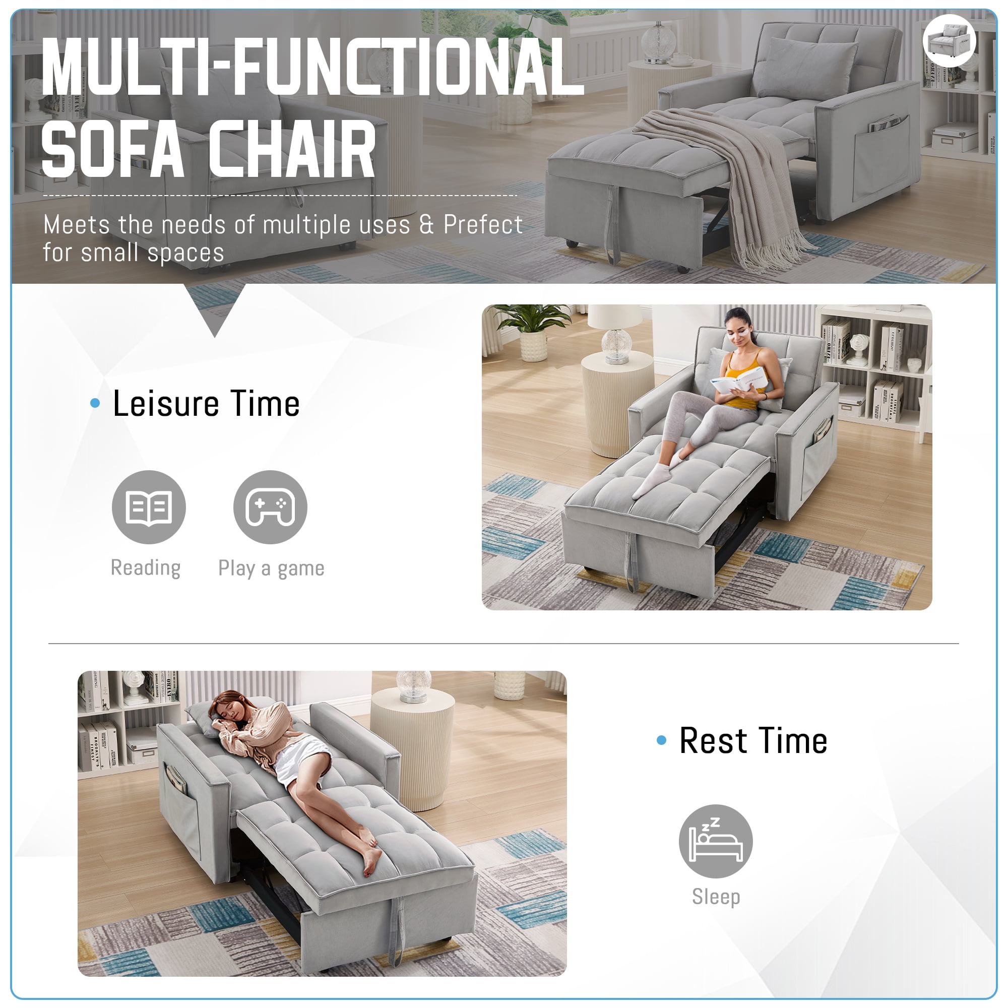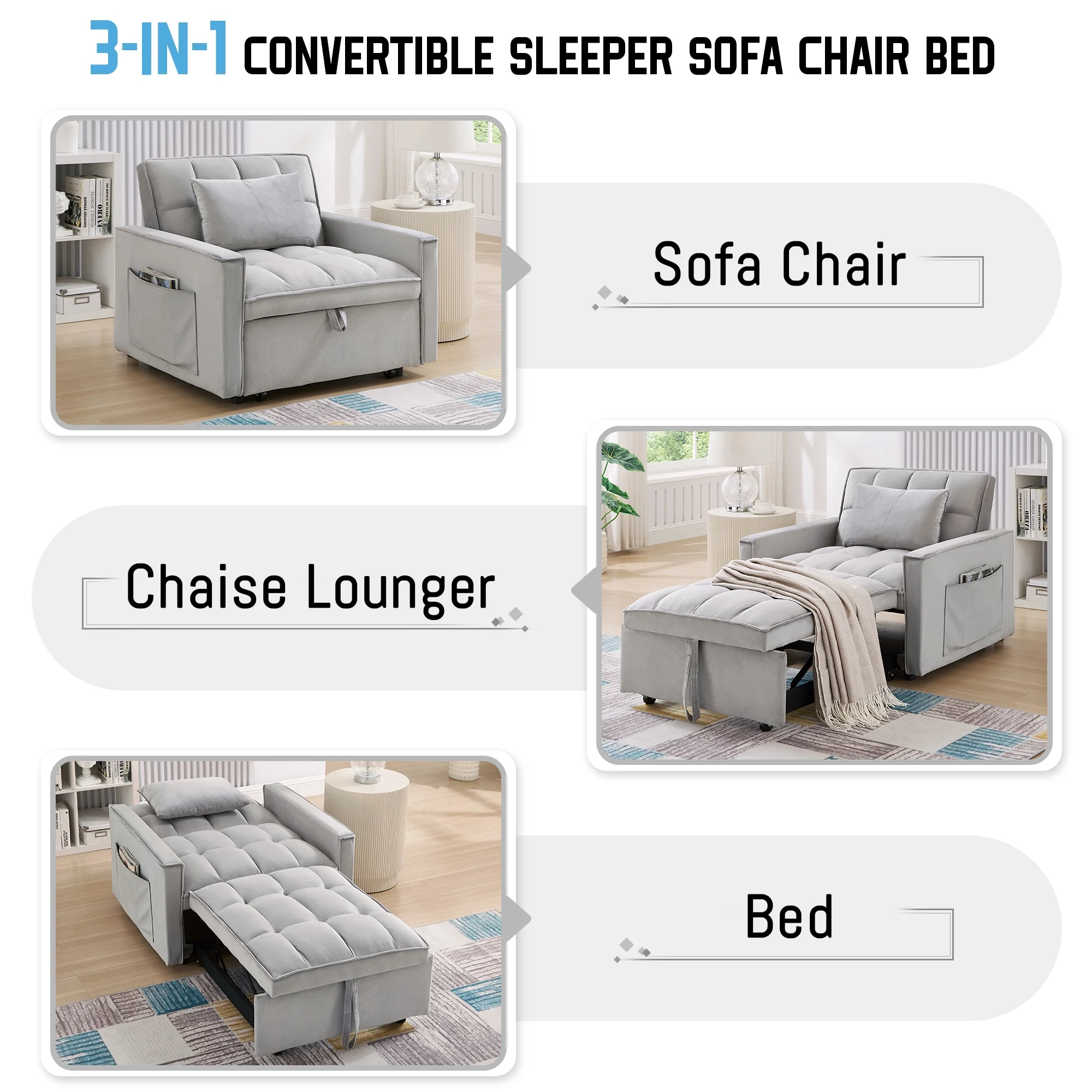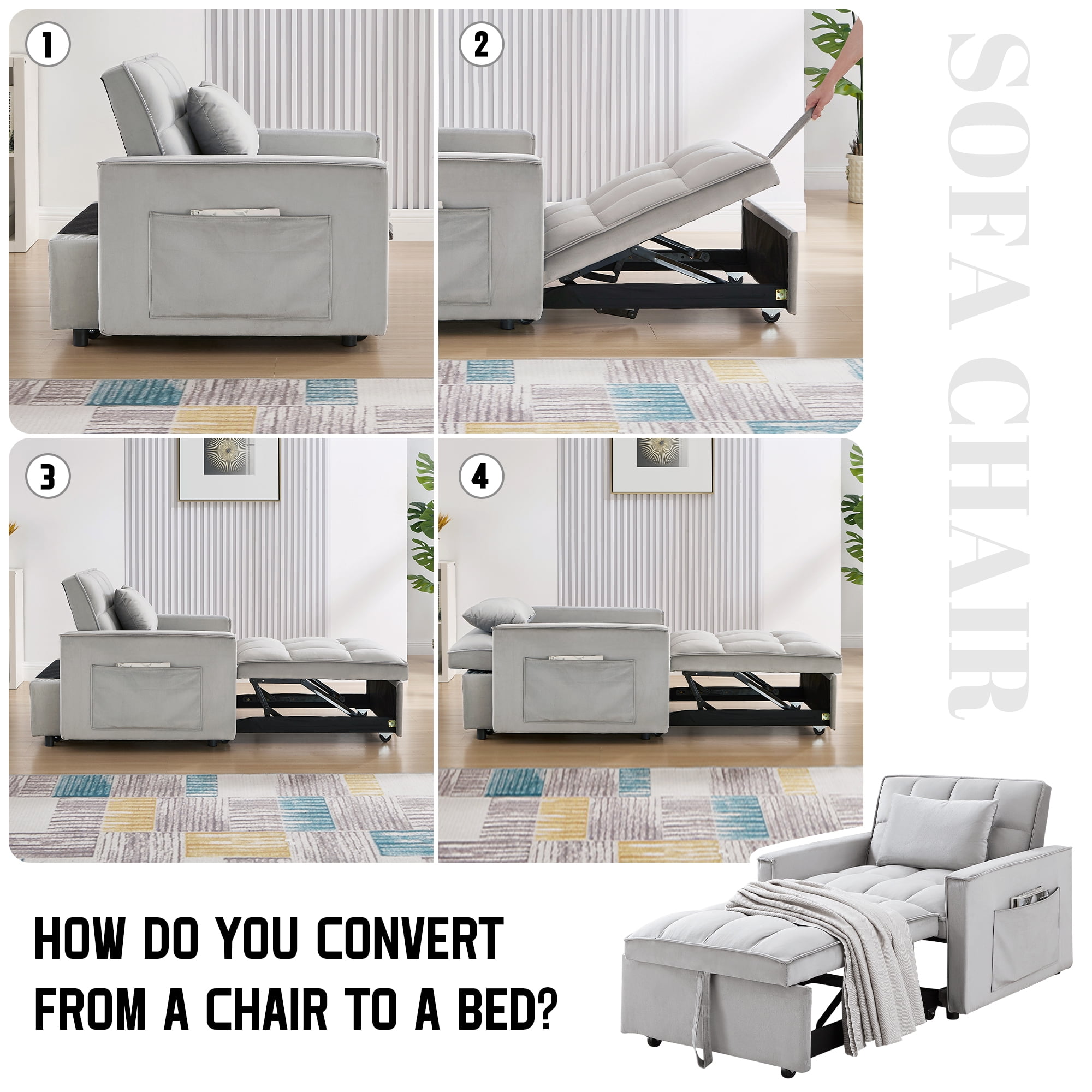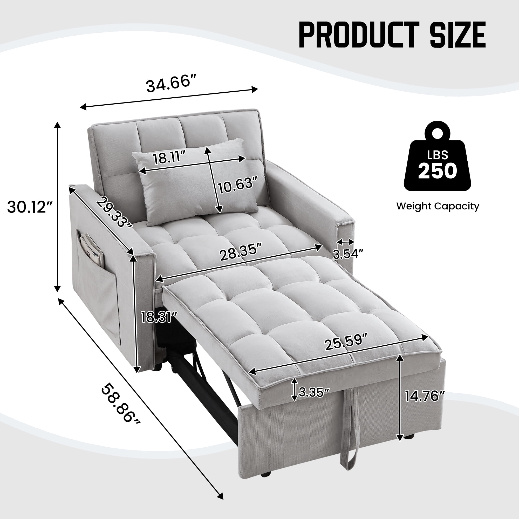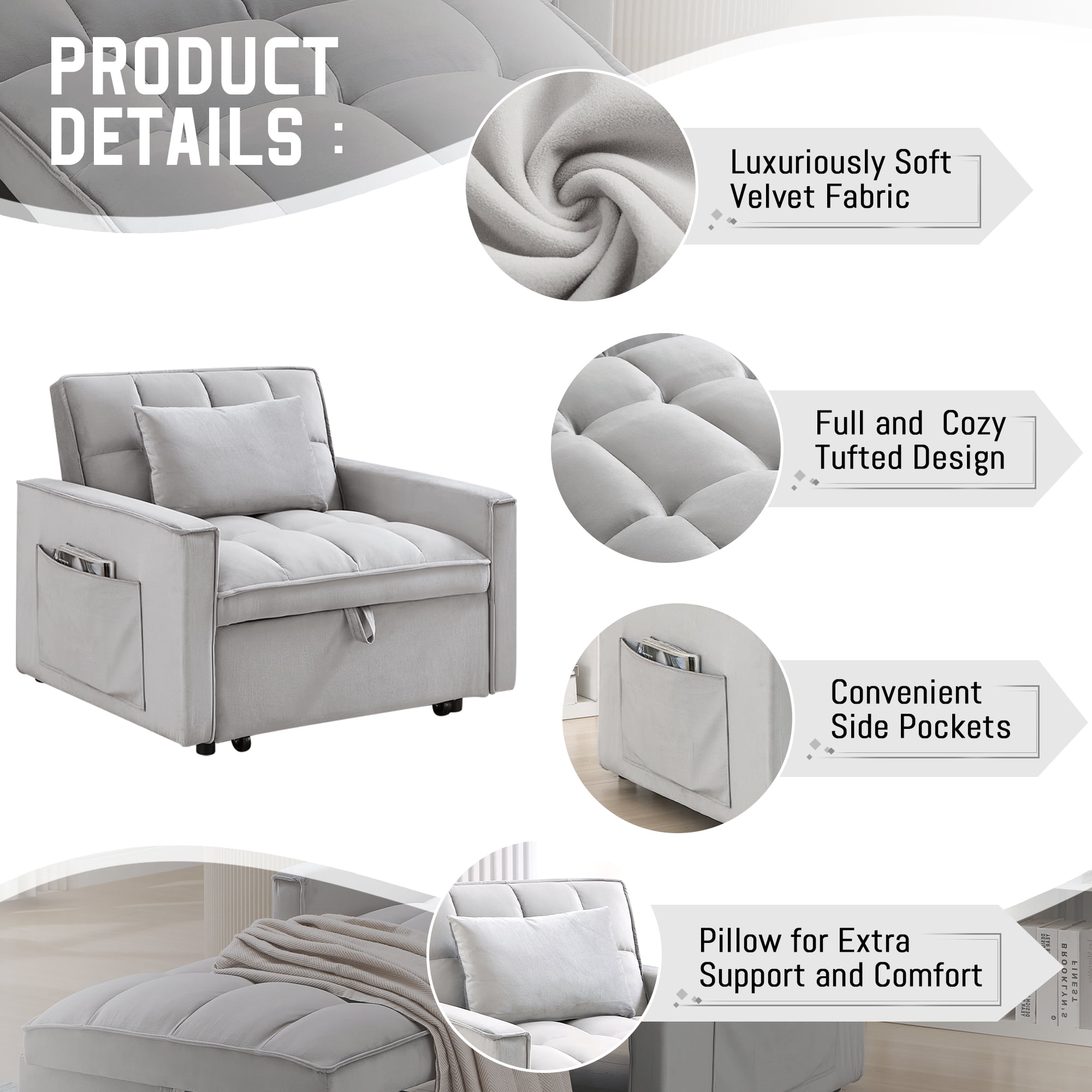 Quickly converts from sofa chair to lounge chair to bed Compact design fits small spaces such as dorms, apartments, studios, offices Comes with a pillow for extra support for your back or head 1 pocket on each side for storing small everyday items Soft velvet fabric with high density foam padding for comfort and support Stable and sturdy metal frame that can hold up to 250 pounds Understated and classic tufted design adds a distinctive style to your home Easy to install, installation instructions and tools included Dinosisco 3-in-1 Multi-Funtional Sofa Chair Bed for Adults Product Type: Convertible Sleeper Sofa Chair Seating Capacity: 1 Fabric: Velvet Colors: Gray/Black Back Type: Adjustable Back: 110°, 150°, 180° Weight Capacity: 250lbs Lounge Chair Size: 58.86″L x 34.66″W x 30.12″H Seat Height: 14.76″ Product Care: Spot clean with a damp cloth and mild soap