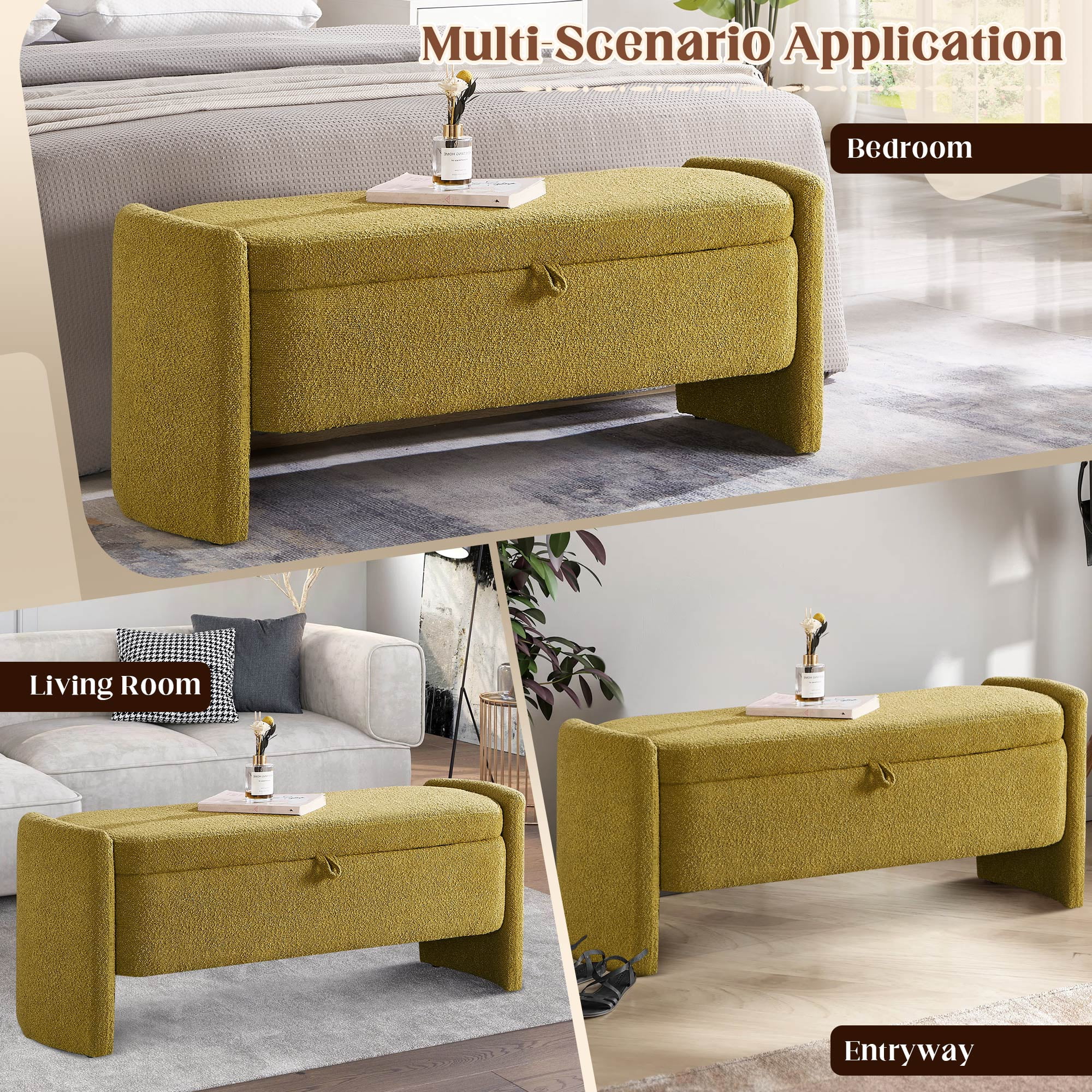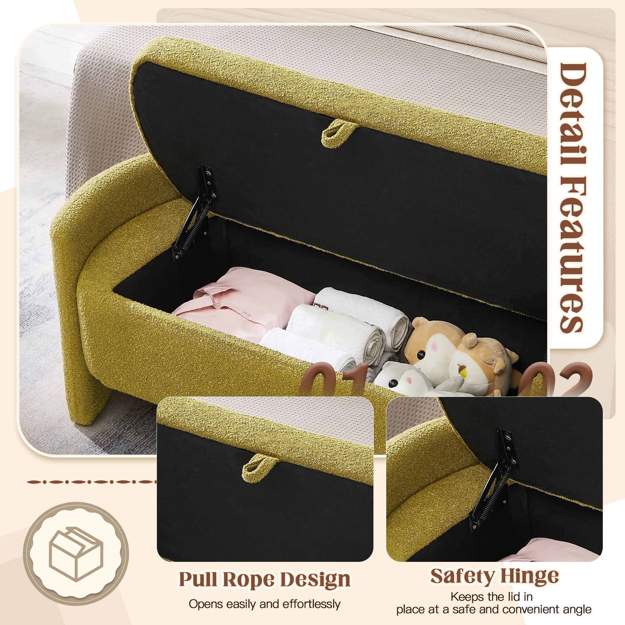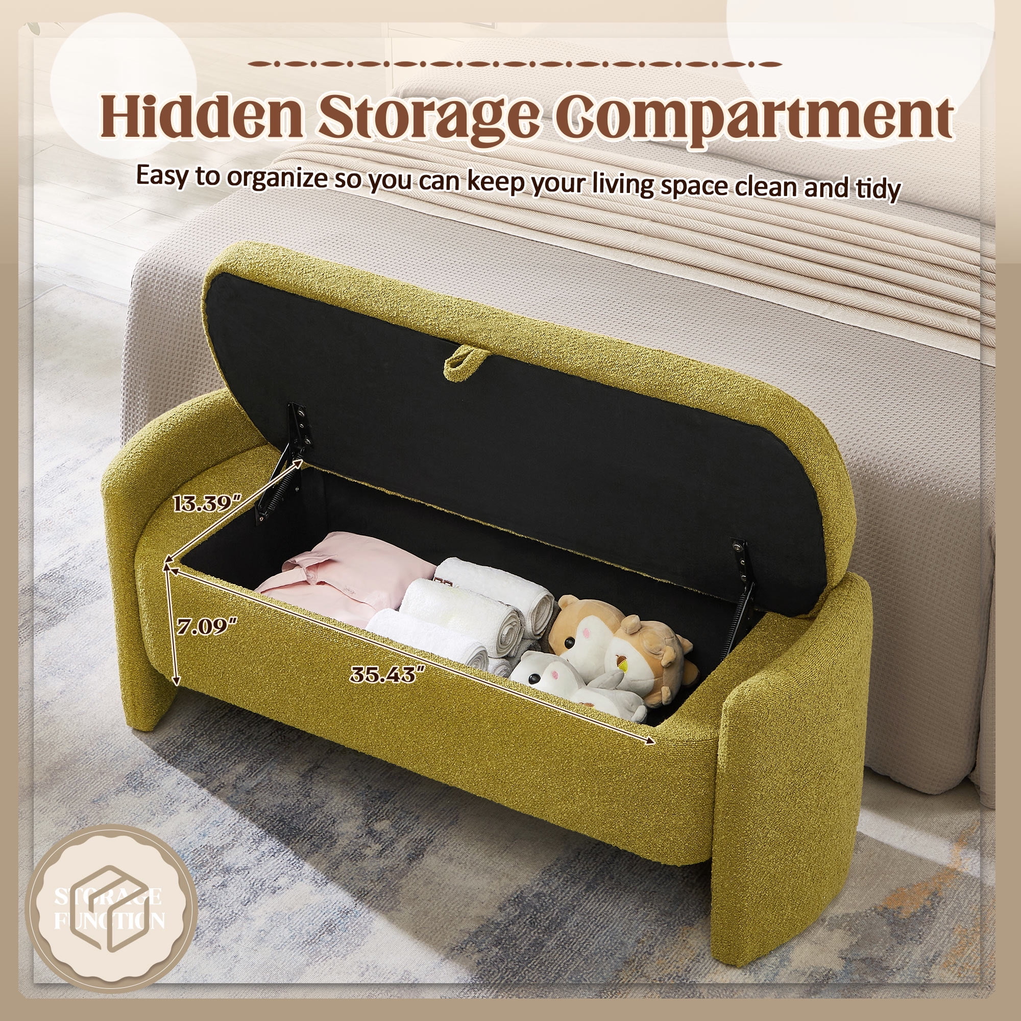 Dinosisco 41.73″ End of Bed Storage Bench Classic appearance storage bench 100% high quality velvet fabric Concealed hinge design, easy to open and fix the lid Multi-functional design, able to store and sit Aesthetically pleasing design Ideal for storing and organizing your toys, blanket, books and daily accessories