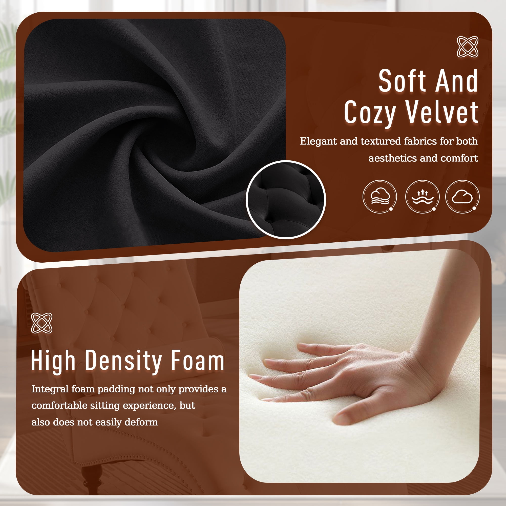 Features & Specifications: Ergonomically designed comfort Filled with high rebound sponge Upholstered with soft velvet fabric Appearance adopts a special tufted button design Sturdy wood leg Easy to put together Color: Beige/Gray/Black/Pink Chair: 58.27″L x 26.77″W x 33.86″H Seat Depth: 43.31” Seat Width: 26.77″ Seat Height: 15.75” Weight Capacity: 300lbs