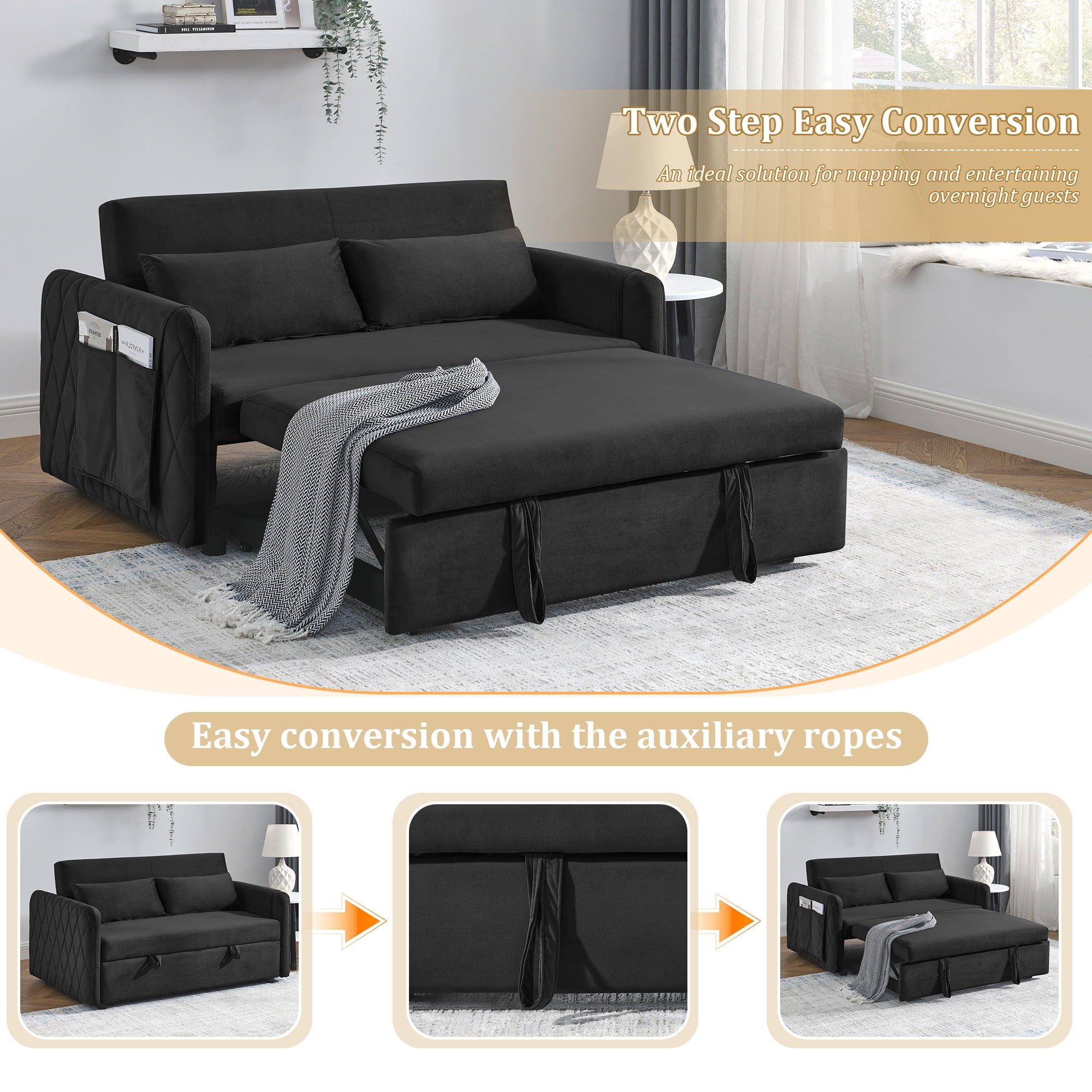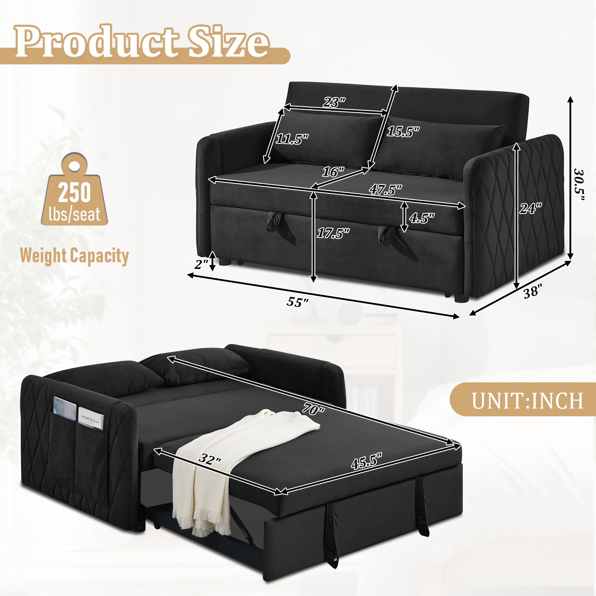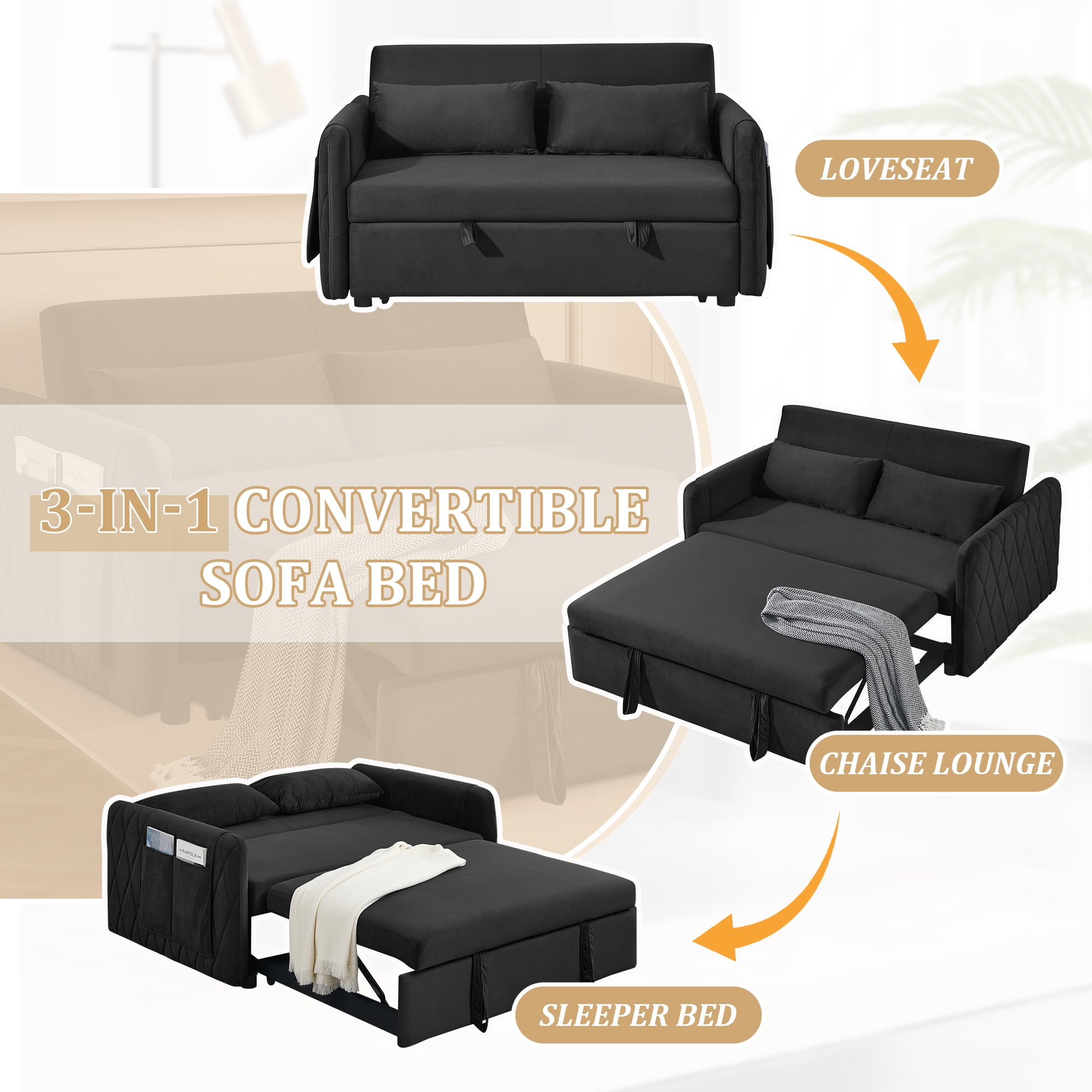 3-in-1 design: can converts from a loveseat sofa to a chaise lounge or bed The backrest has three adjustable angles (105°-150°-180°), so you can find the best relaxation position Made of selected velvet fabric, which is soft to the touch and resistant to wrinkles Diamond detailing on the side armrests gives a sense of sophistication Seat cushion with high rebound foam padding for a comfortable sitting experience Removable side pockets for storage and easy cleaning Solid wood and metal frame for stability and durability Comes with 2 cushions for extra comfort and support Suitable for various scenarios, living room, bedroom, home office, dormitory, etc Easy to install, comes with required installation tools and instructions Dinosisco Convertible Loveseat Sleeper Product Type: Pull Out Sofa Bed Color: Black/Gray/Blue/Green Back Type: 3 Adjustable Angle Backrest Fabric: Velvet Material: Solid Wood + Metal Loveseat Dimension: 55″L x 38″W x 30.5″H Sofa Bed Dimension: 45.5″L x 70″W x 17.5″H Back Height: 15.5″ Seat Width: 47.5″ Seat Height: 17.5″ Seat Depth: 16″ Weight Capacity: 500 lbs