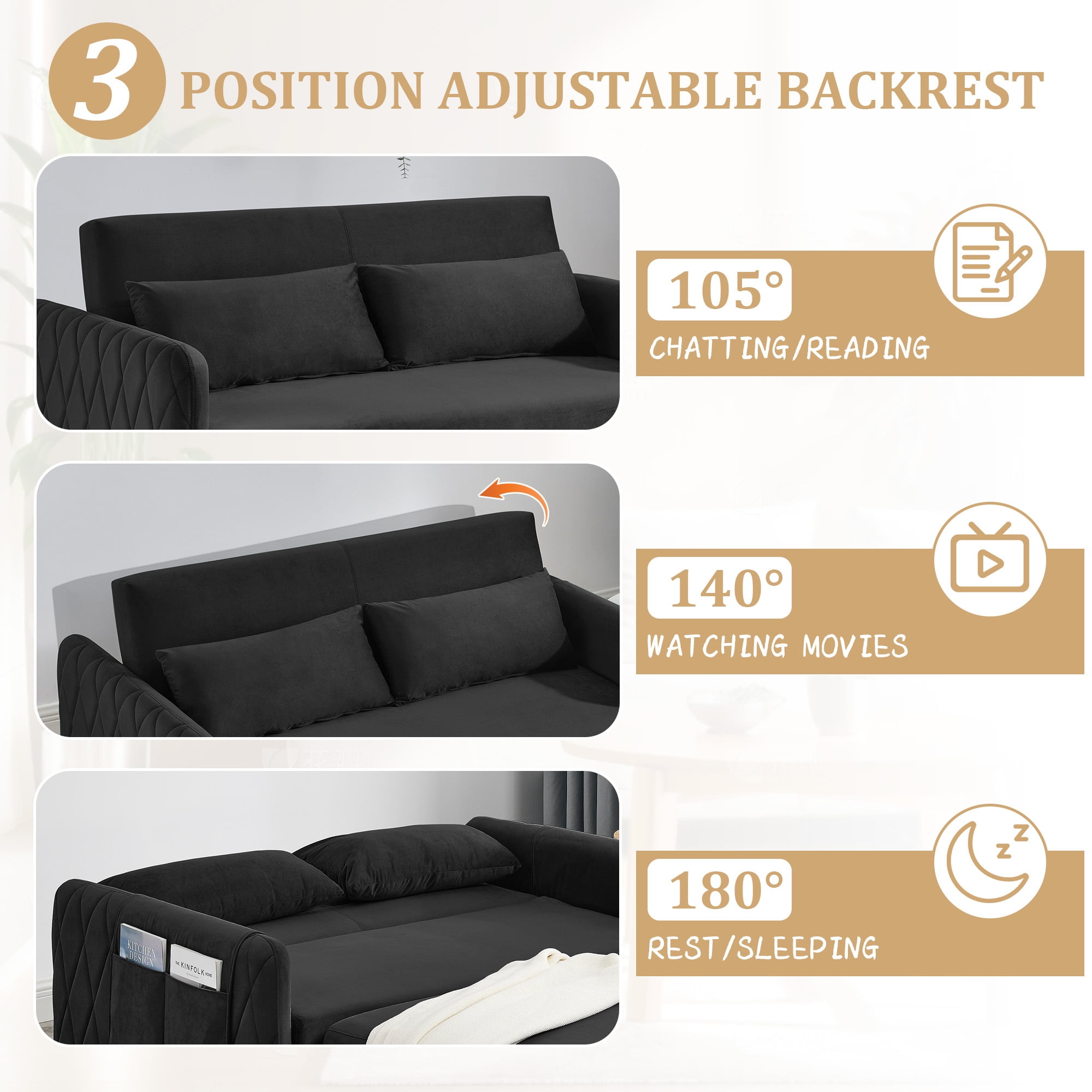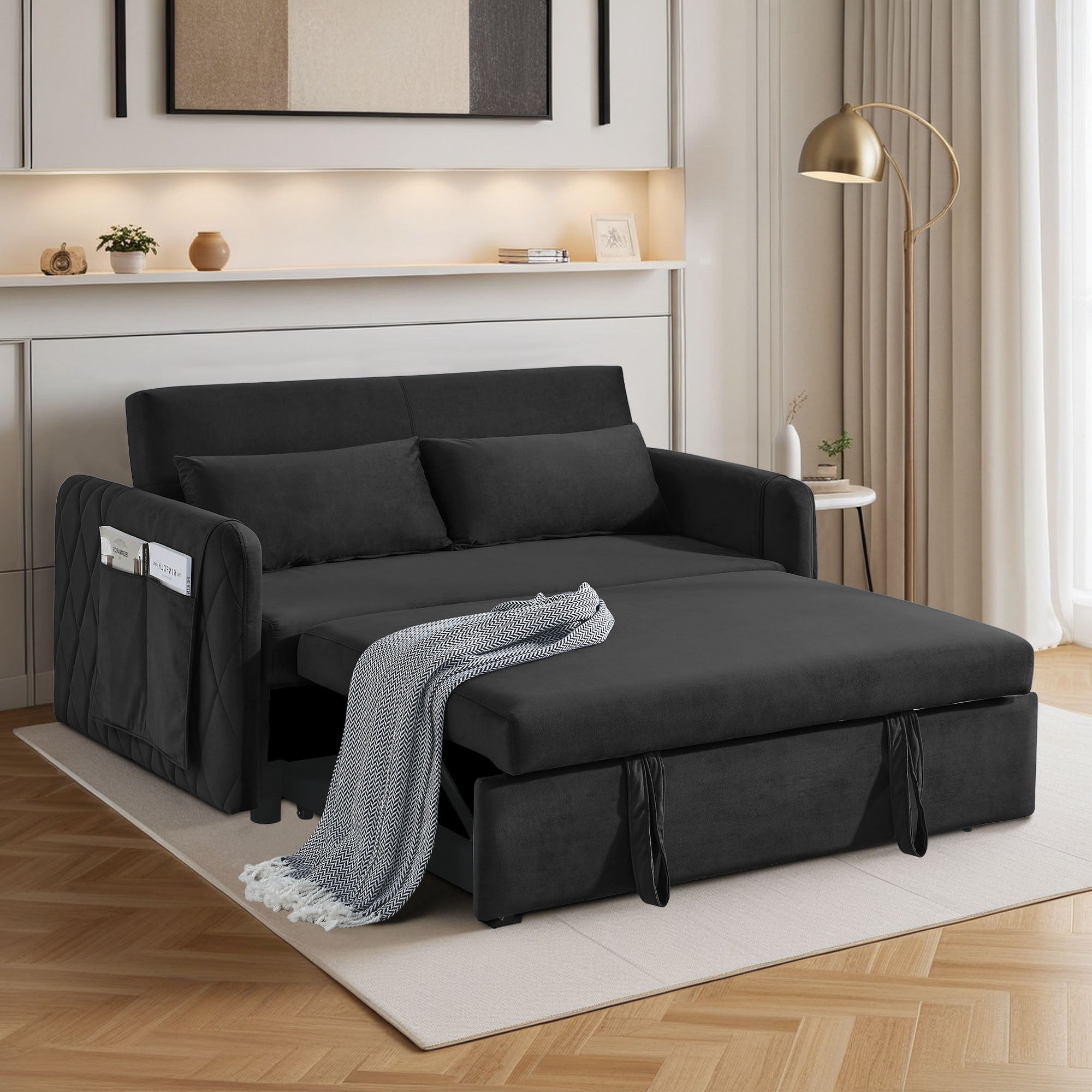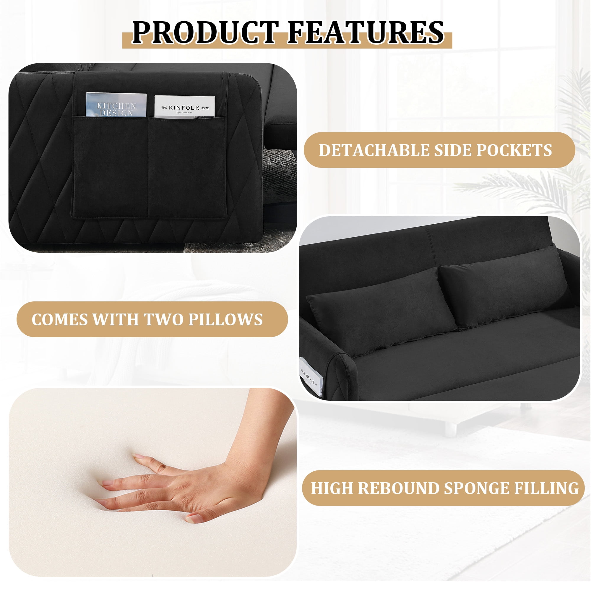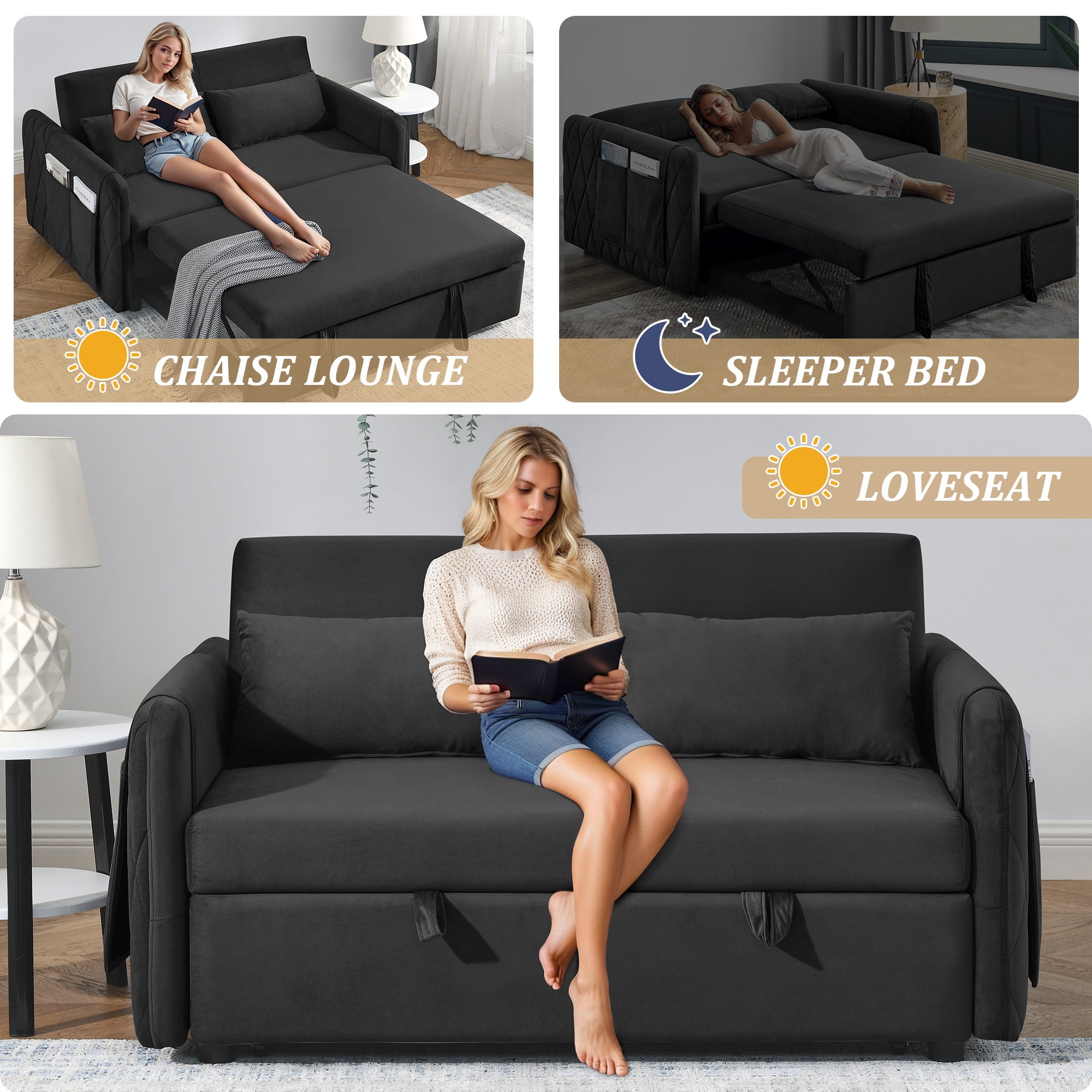 3-in-1 design: can converts from a loveseat sofa to a chaise lounge or bed The backrest has three adjustable angles (105°-150°-180°), so you can find the best relaxation position Made of selected velvet fabric, which is soft to the touch and resistant to wrinkles Diamond detailing on the side armrests gives a sense of sophistication Seat cushion with high rebound foam padding for a comfortable sitting experience Removable side pockets for storage and easy cleaning Solid wood and metal frame for stability and durability Comes with 2 cushions for extra comfort and support Suitable for various scenarios, living room, bedroom, home office, dormitory, etc Easy to install, comes with required installation tools and instructions Dinosisco Convertible Loveseat Sleeper Product Type: Pull Out Sofa Bed Color: Black/Gray/Blue/Green Back Type: 3 Adjustable Angle Backrest Fabric: Velvet Material: Solid Wood + Metal Loveseat Dimension: 55″L x 38″W x 30.5″H Sofa Bed Dimension: 45.5″L x 70″W x 17.5″H Back Height: 15.5″ Seat Width: 47.5″ Seat Height: 17.5″ Seat Depth: 16″ Weight Capacity: 500 lbs
