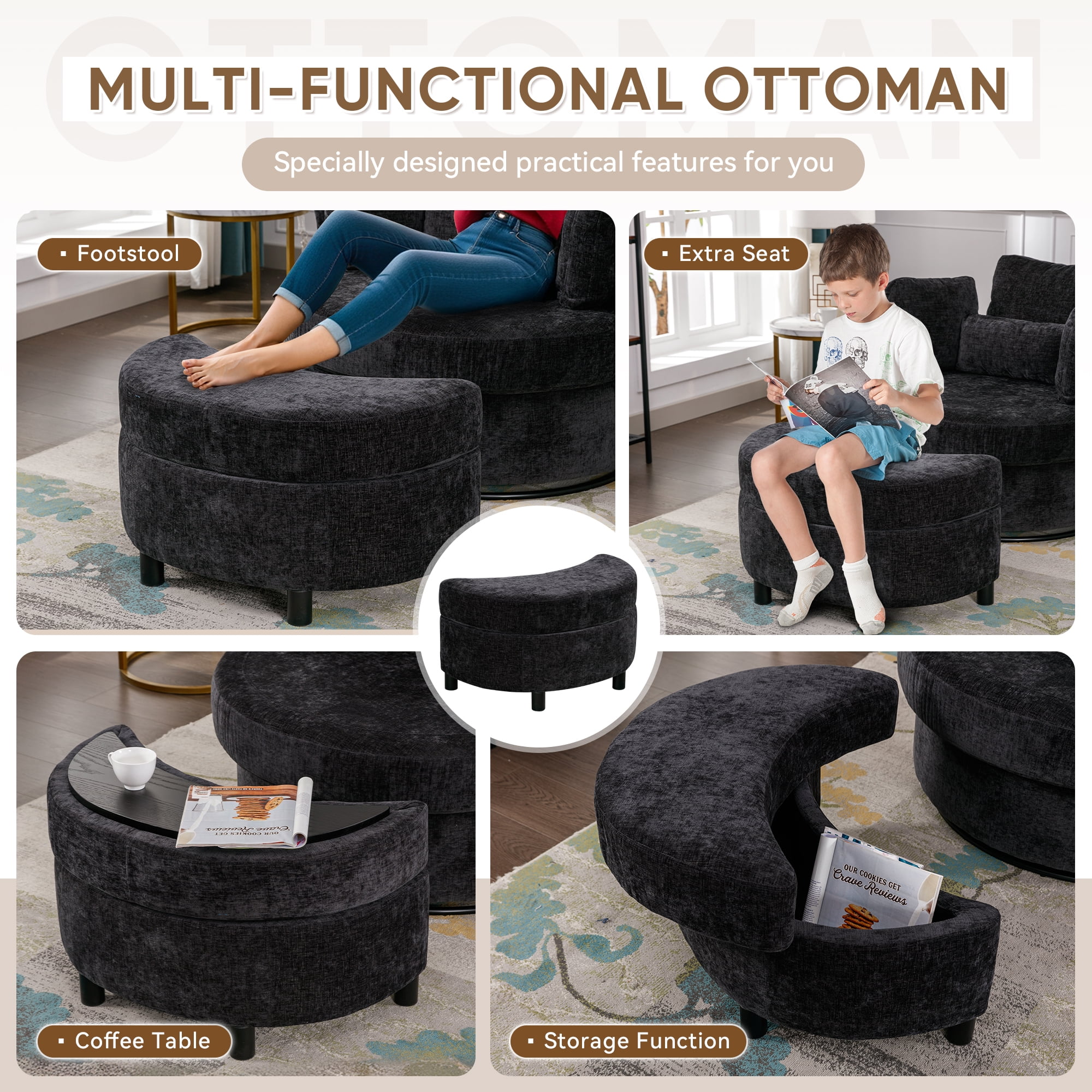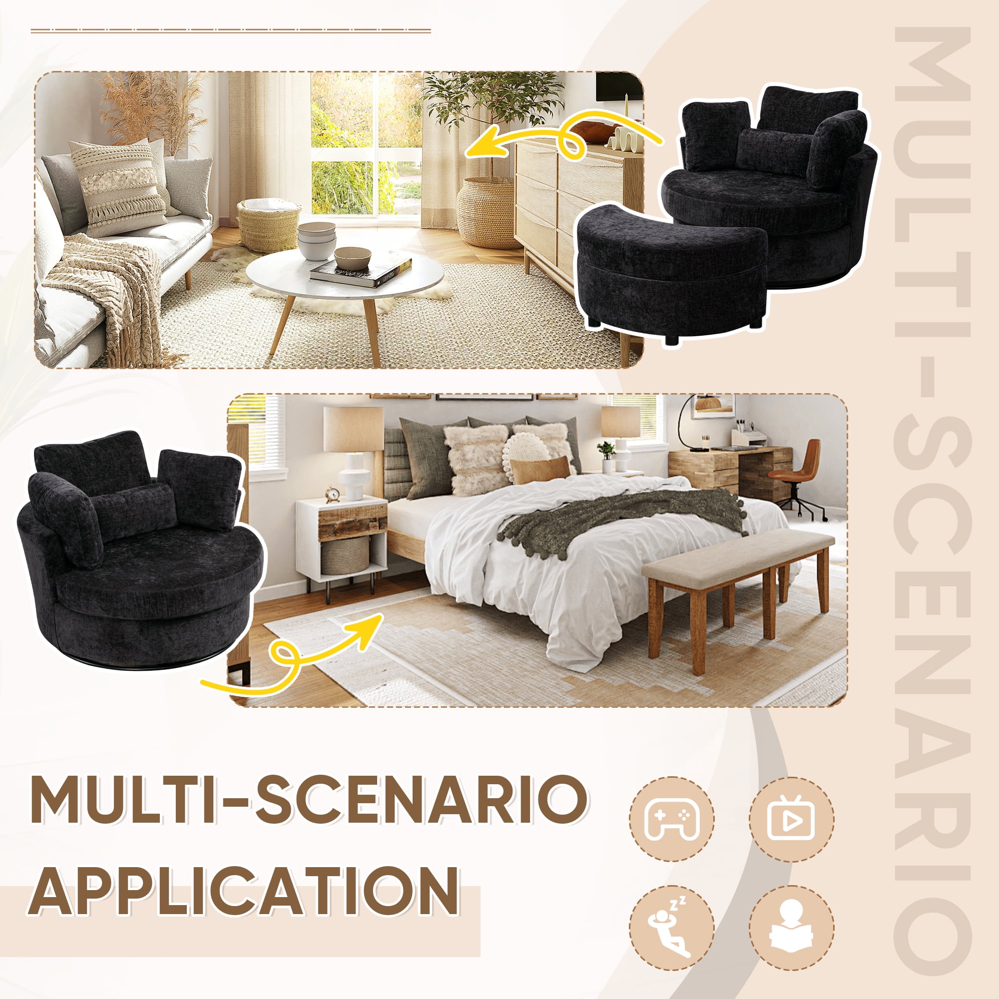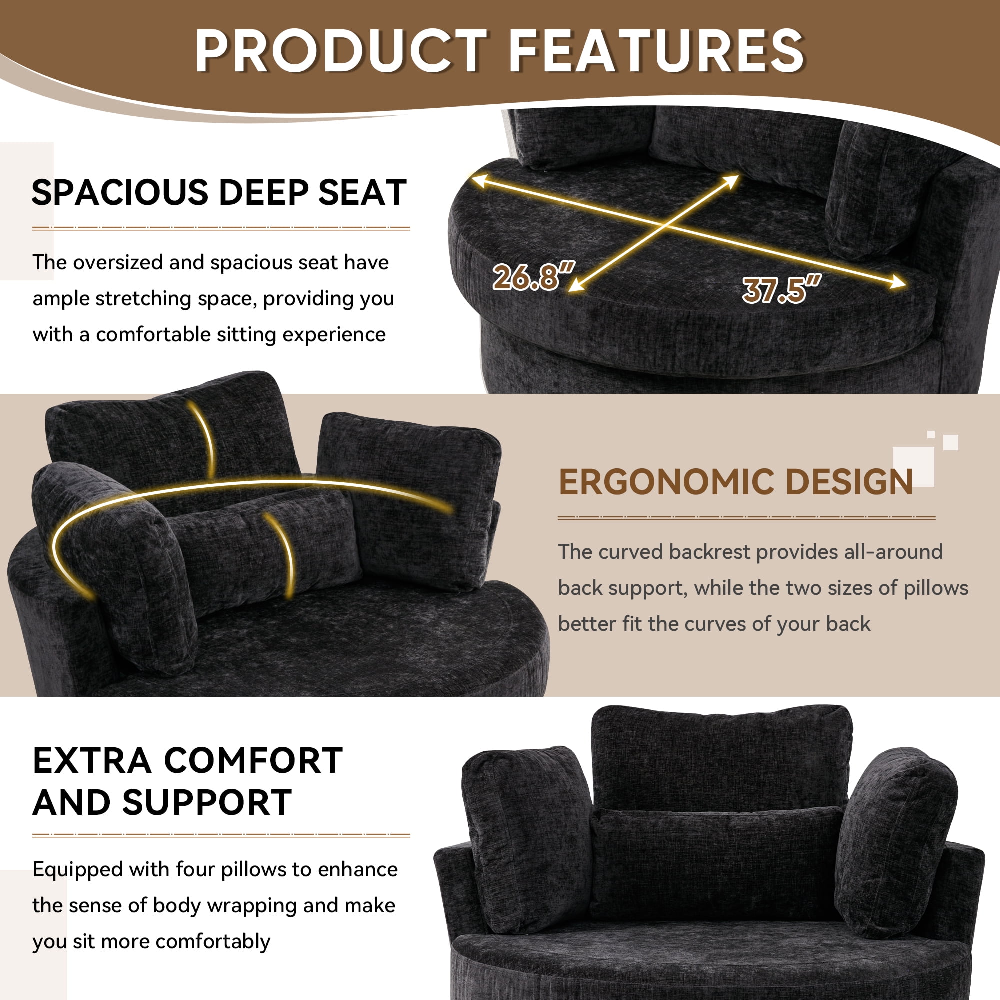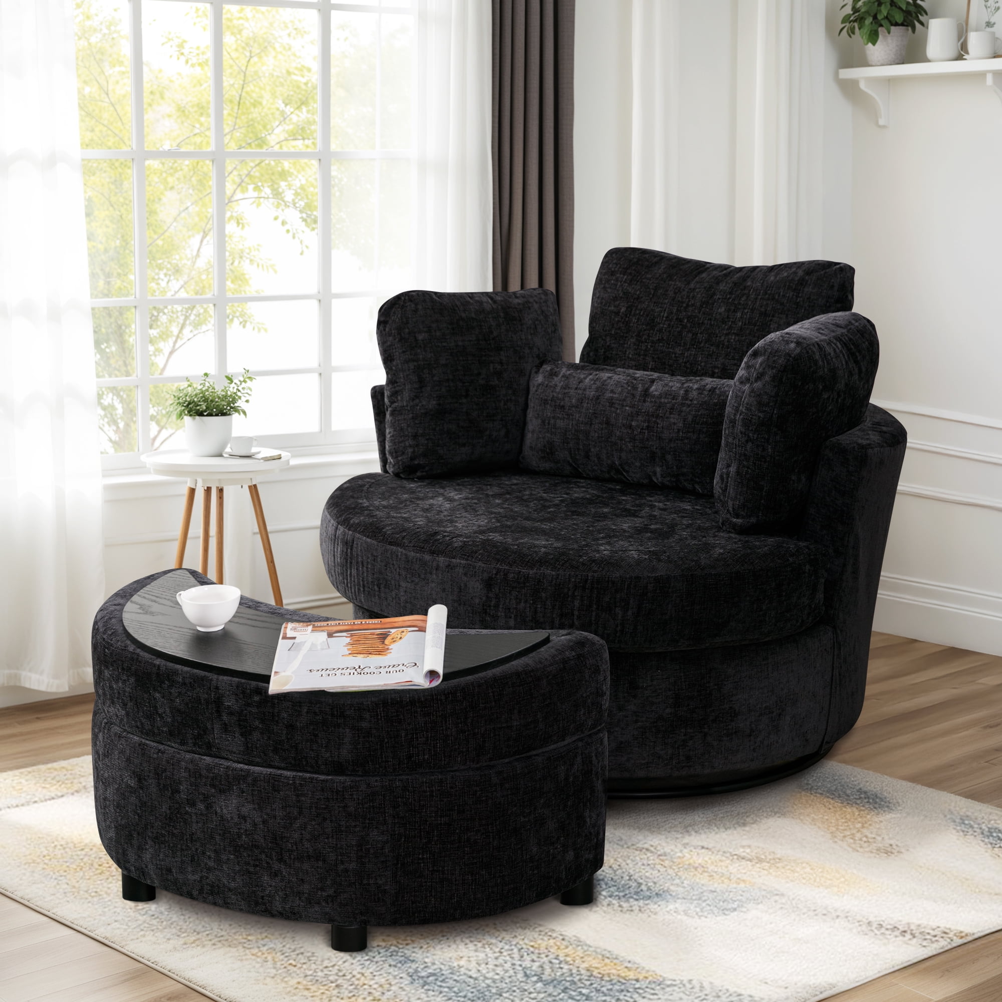 Dinosisco Oversized Swivel Accent Barrel Chair with Storage Ottoman, Chenille, Indoor, Black