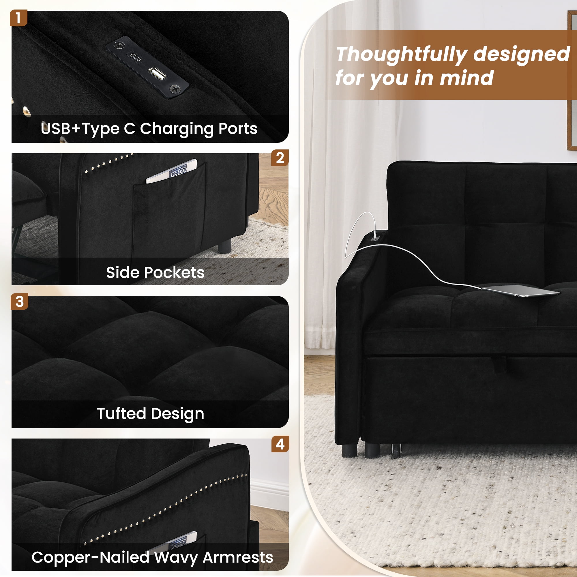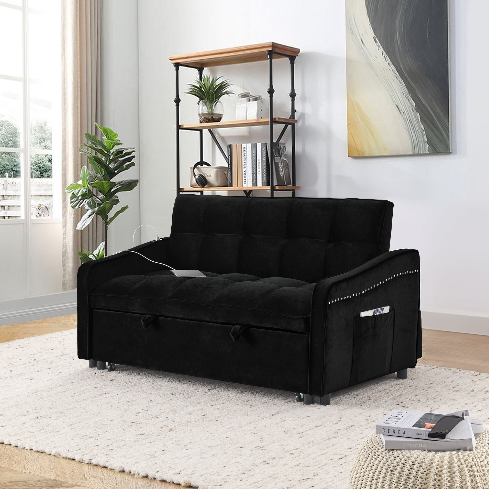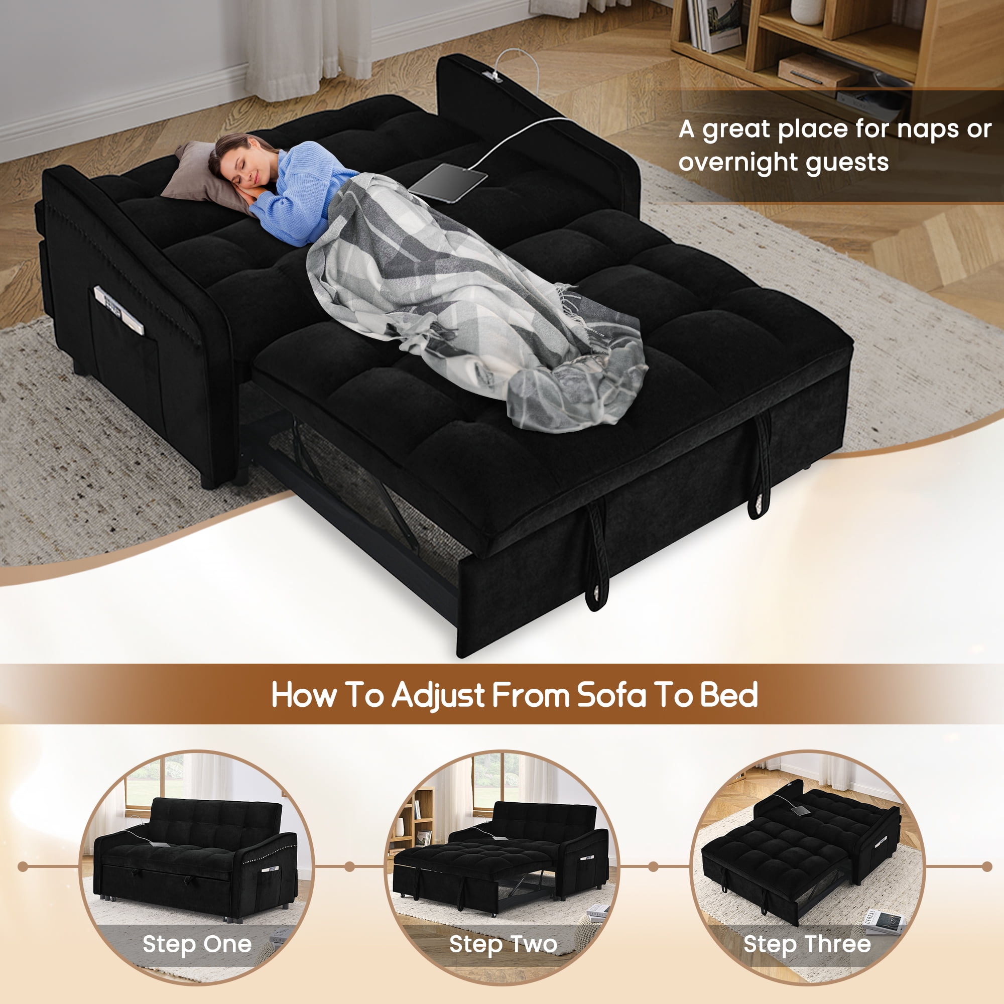 Dinosisco Pull Out Sofa Bed, Loveseat Sleeper with USB/Type-C, Adjust Back, Convertible Sleeper Sofa for Living Room/Apartment, Black Velvet