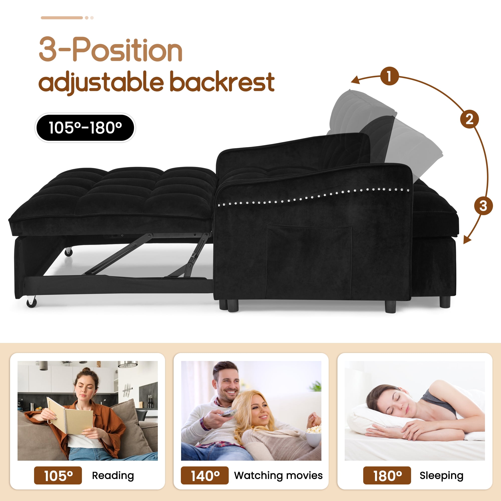 Comes with a pull-out bed that converts from a loveseat to a bed for napping or entertaining overnight guests Three-position adjustable backrest for different needs: 105° for reading, 140° for watching movies and 180° for sleeping Includes Usb and Type C charging ports for charging a variety of electronic devices conveniently Side pockets for storing your cell phone, earbuds, remote control and other daily necessities High-quality velvet fabric, soft and comfortable, not easy to pilling and wrinkles High rebound foam filled seat cushion and back cushion, not tired of sitting for a long time and not easy to be deformed Multi-scenario application, perfect for dormitories, apartments, offices and other small spaces Combination of wood and metal frame, strong support and durability Easy to assemble, comes with instructions and required tools and accessories Dinosisco Convertible Sleeper Loveseat for Apartment Material: Velvet Color: Beige/Gray/Black/Blue Product Size: Overall Size: 53″L x 36.5″W x 31″H Bed Size: 69″L x 45″W Seat Height: 17″ Seat Depth: 20″ Back Height: 16.5″ Weight Capacity: 250lbs/seat Product care: To clean the upholstery material, spot clean with a damp cloth and mild soap