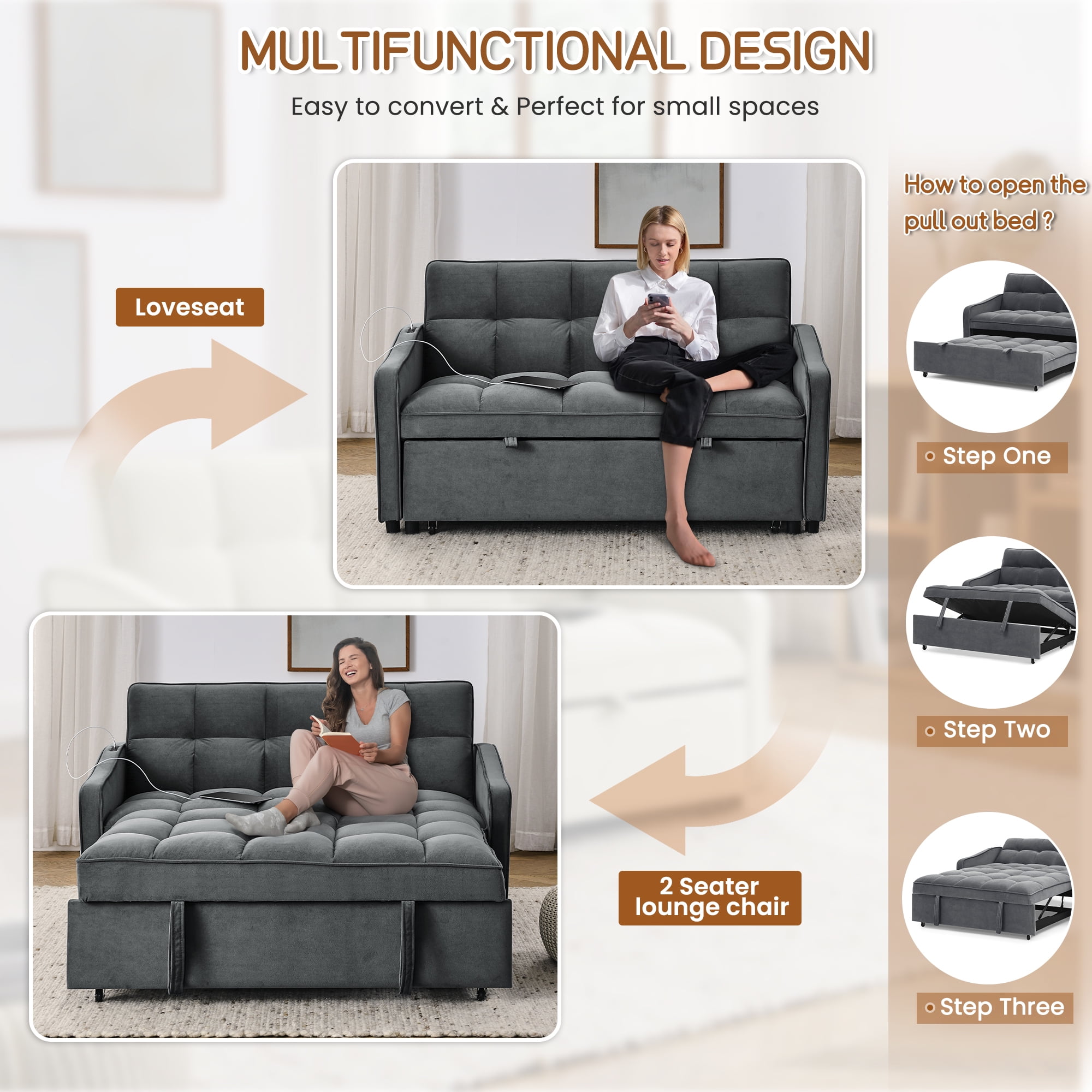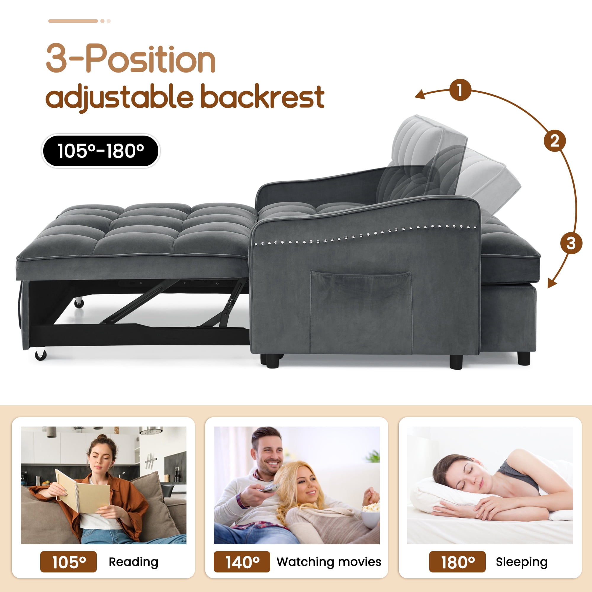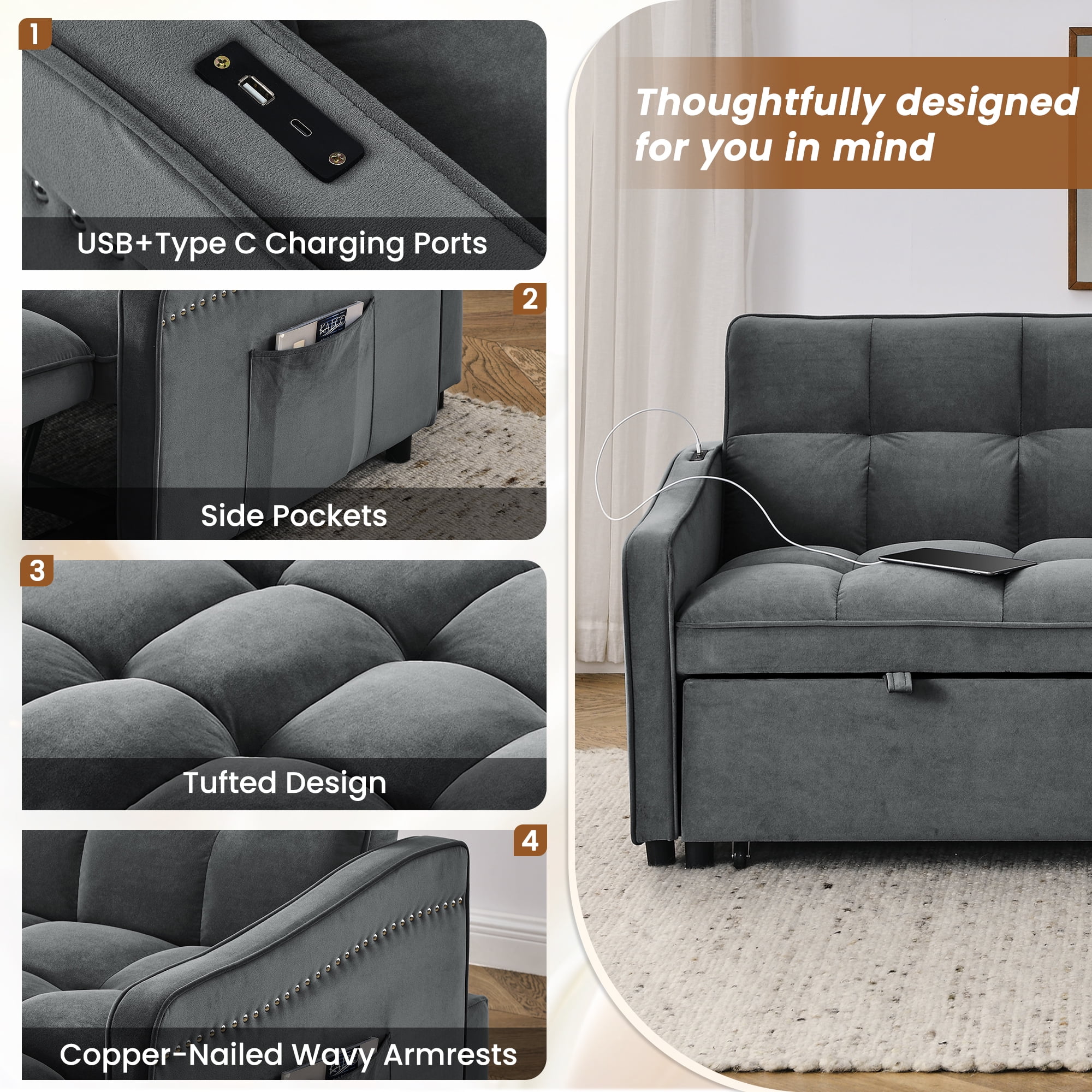 A boon for small spaces! Our multifunctional sleeper loveseat will bring you endless convenience. Seamlessly convert from a loveseat sofa to a comfortable bed with a simple pull for napping or entertaining overnight guests. The three-position adjustable backrest easily meets your different needs, 105° for reading, 140° for watching movies, and 180° for sleeping. Side pockets keep your essentials within easy reach, USB and Type C charging ports allow you to charge your electronic devices without leaving the sofa bed, and the mid-century aesthetic of the wavy armrests and distinctive copper nailhead trim add an elegant touch to the living room, apartment or office. No matter where you place it in any space, you’ll find a blend of unique style and practical functionality. Dinosisco Convertible Sleeper Sofa for Living Room, Loveseat Sleeper with Usb/Type-C, Adults Pull Out Sofa Bed with Adjustable Back, Gray Velvet