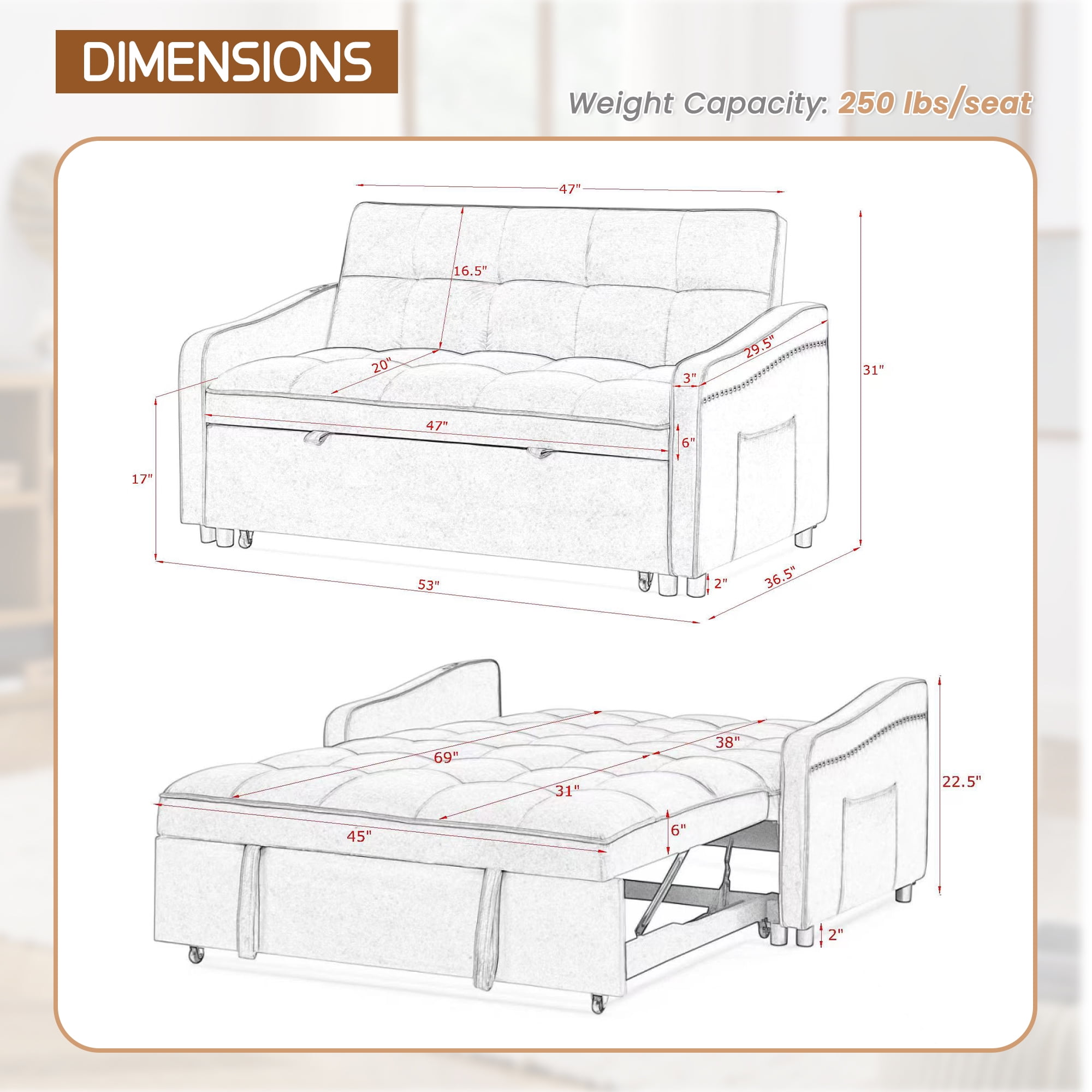 Comes with a pull-out bed that converts from a loveseat to a bed for napping or entertaining overnight guests Three-position adjustable backrest for different needs: 105° for reading, 140° for watching movies and 180° for sleeping Includes Usb and Type C charging ports for charging a variety of electronic devices conveniently Side pockets for storing your cell phone, earbuds, remote control and other daily necessities High-quality velvet fabric, soft and comfortable, not easy to pilling and wrinkles High rebound foam filled seat cushion and back cushion, not tired of sitting for a long time and not easy to be deformed Multi-scenario application, perfect for dormitories, apartments, offices and other small spaces Combination of wood and metal frame, strong support and durability Easy to assemble, comes with instructions and required tools and accessories Dinosisco Convertible Sleeper Loveseat for Apartment Material: Velvet Color: Beige/Gray/Black/Blue Product Size: Overall Size: 53″L x 36.5″W x 31″H Bed Size: 69″L x 45″W Seat Height: 17″ Seat Depth: 20″ Back Height: 16.5″ Weight Capacity: 250lbs/seat Product care: To clean the upholstery material, spot clean with a damp cloth and mild soap