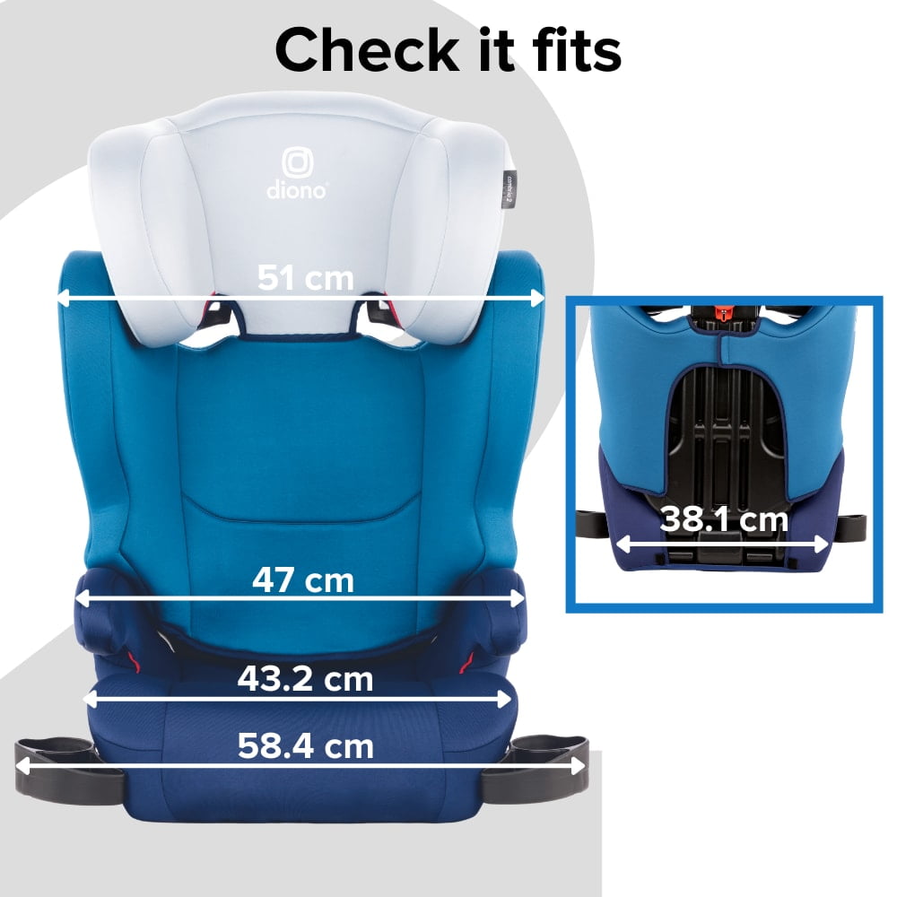 Diono Cambria 2 XL Latch 2-in-1 High Back to Backless Booster Car Seat, Blue The Cambria 2 XL Booster comfortably fits children from 38 – 63 inches tall and includes a 6-position headrest to provide protective head support for your child with reinforced side impact protection XL Booster seat with wide contoured seat base and extra length for better leg support and kid comfort Easily converts from a high-back booster to a backless belt-positioning booster seat Fitted with LATCH connectors and front adjusters to securely connect the booster seat to your vehicle in seconds, to make self-buckling easier and keeps the seat in place while the seat is unoccupied Awarded an IIHS Best Bet Booster recommendation, so you can be ensured top quality safety and a great fit in almost any car, minivan, or SUV Energy-absorbing EPE foam lining over protects in all the right ways Two retractable cup holders for road trip drinks and snacks Lightweight, super portable, and flat packs for easy transport and storage Easily removable and machine washable car seat covers for added parent convenience Available in a variety of bright, vivid color choices