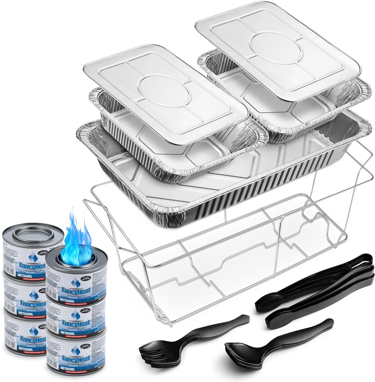 Diplastible Disposable Chafing Dish Buffet Set, Wire Racks Pans Lids Serving Spoons Forks Tongs