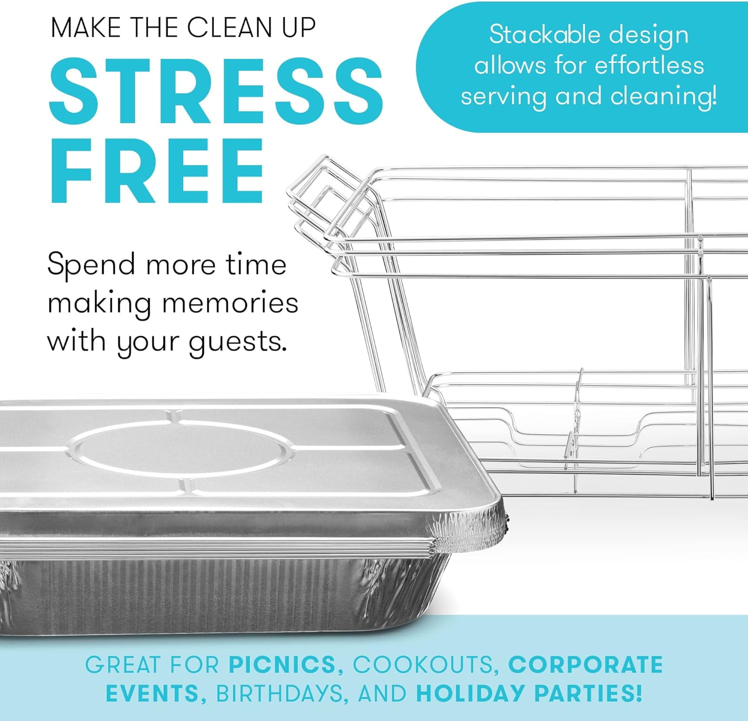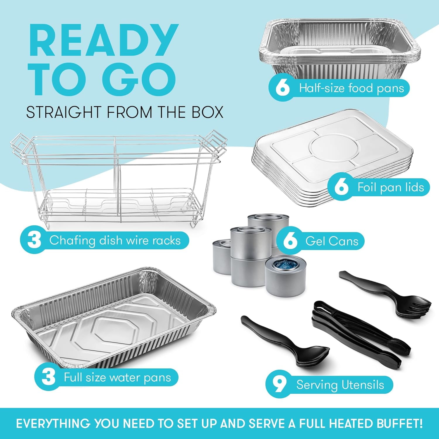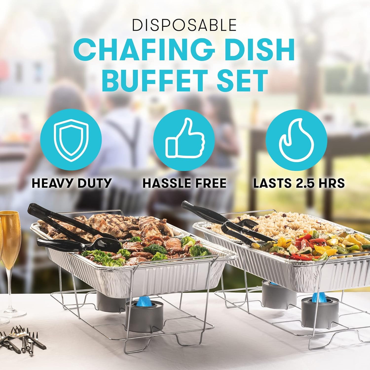 Enjoy Diplastible food warmer chafing dish buffet set that is convenient to set up, lightweight, and disposable. No need for expensive steel chafing sets that are hard to clean, cumbersome, and inconvenient when you can get everything you need for your next event, party, or large family gathering with this premium 39 Piece Disposable food warmer for parties. Food warmer disposable 9 x 13 nine by thirteen pans chafing dishes for barbeque bbq set warmer Enjoy a food warmer chafing dish buffet set that is convenient to set up, lightweight, and disposable. No need for expensive steel chafing sets that are hard to clean, cumbersome, and inconvenient when you can get everything you need for your next event, party, or large family gathering with this premium 39 Piece Disposable food warmer for parties. Oven safe foor warmer aluminum pans set with gel cans fuel for bbq picnic keep food warm hot BENEFITS & FEATURES Full 39 Piece Buffet Set 2.5 Hours Per Gel Can Lightweight Stackable Aluminum Sturdy Wire Rack Stands Easy to Swap Out 9”x13” Trays Premium Serving Utensils Included Disposable for Fast Breakdown FOR ANY EVENT Our 9 by 13 inch serving pans with foil lids are the perfect size for any family gathering, corporate conference, catering supplies, or special events like weddings, receptions, parties, graduations, holidays, family reunions, and more. The serving trays can be swapped out quickly when food runs out or when it’s time to change course from appetizers to entrees to dessert. NO CLEAN UP Hosting and organizing an event is hard enough without having to spend hours cleaning. Don’t worry about lugging away heavy and cumbersome steel dishes and equipment. Simply toss the disposable chafing set pieces in the trash, wipe your tables clean and your breakdown is complete. EASY-TO-USE GEL CANS Get your gel cans set up in minutes with our easy to use gel cans. Each can last up to 2.5 hours to keep your food warm and inviting for hours on end.