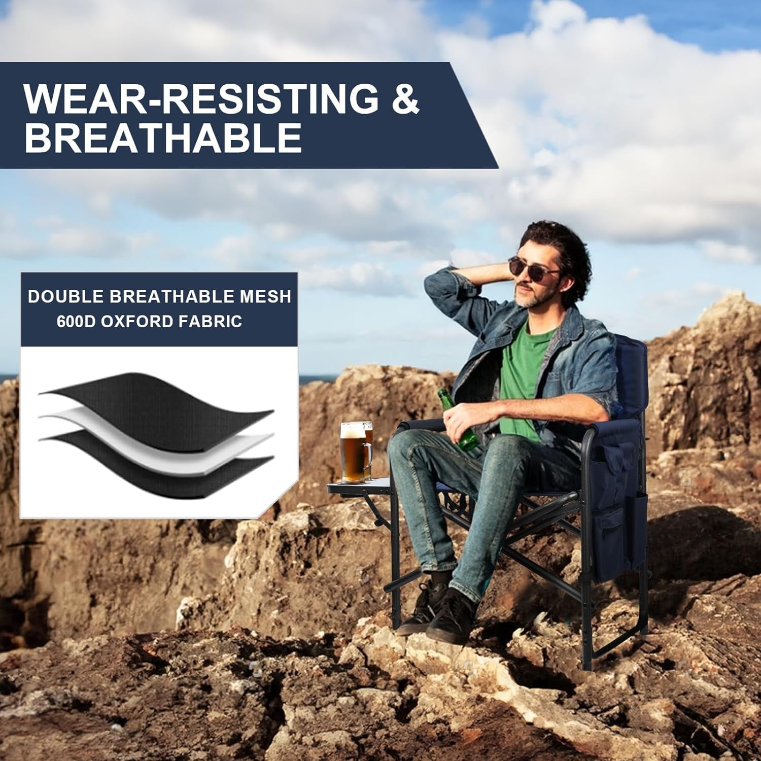 【450 LBS】Support to 450lbs, Seat Width: 24.5″, Seat Height: 18.5″, Chair Height: 35.5″, Package Dimensions: 35.1″ x 19.7″ x 4.4″, Weight: 11.8 lbs. Directors chairs is specifically engineered to accommodate larger individuals or those who require extra support and stability. 【MESH FABRC BREATHABLE】Certain parts of folding directors chairs outdoor are designed with breathable mesh fabric, allowing for improved airflow and a cool seating experience. 【EASY TO SETUP】Enjoy the convenience of quick setup, easy transportation, and comfortable seating. Whether you’re a seasoned camper or a casual outdoor enthusiast, compact camping chair is the perfect companion for all your outdoor. 【ERGONOMIC】Despite its easy-fold design, portable camping chair doesn’t sacrifice comfort. Folding camping chair features a supportive and ergonomic design, providing a comfortable seating experience during your outdoor. 【HEAVY DUTY STEEL】The reinforced steel frame provides exceptional stability, ensuring a safe and secure seating experience. You can trust that our Foldable camping chairs will support you comfortably, even in rugged outdoor. 【600D OXFORD FABRIC】The heavy duty camp chair is made of 600D Oxford fabric, which provides a comfortable seating experience while maintaining durability and can be reused in outdoor conditions. The breathable mesh fabric enhances the comfort and breathability of the seats, ensuring a comfortable and refreshing camping experience. 【CARRYING STRAP】Sports chairs for adults are equipped with carrying straps that make it effortless to transport from one camp to another. Instead of struggling with a heavy duty folding chair, just carry it and go. 【SIDE TABLE】Folding chair with side table allow you to enjoy the outdoors in comfort and convenience. Stop balancing your drink on bumpy surfaces and don’t hold it in your hand all the time. Camp chair with table is the perfect friend for camping, picnic, sporting event, party, BBQ. 【MULTIFUNCTION SIDE POCKET】Lawn chair with multifunctional side pocket provides a convenient storage solution for all your outdoor essentials. Camp chairs for adults with side pocket have multiple compartments and pockets, you can easily organize and access your belongings. 【24 MONTH GUARANTEE】: In addition to the quality guarantee, we also provide exceptional customer support. If you encounter any issues or have any concerns within the 2-year period, our dedicated customer service team is here to assist you. We’re committed to ensuring your satisfaction with our product.