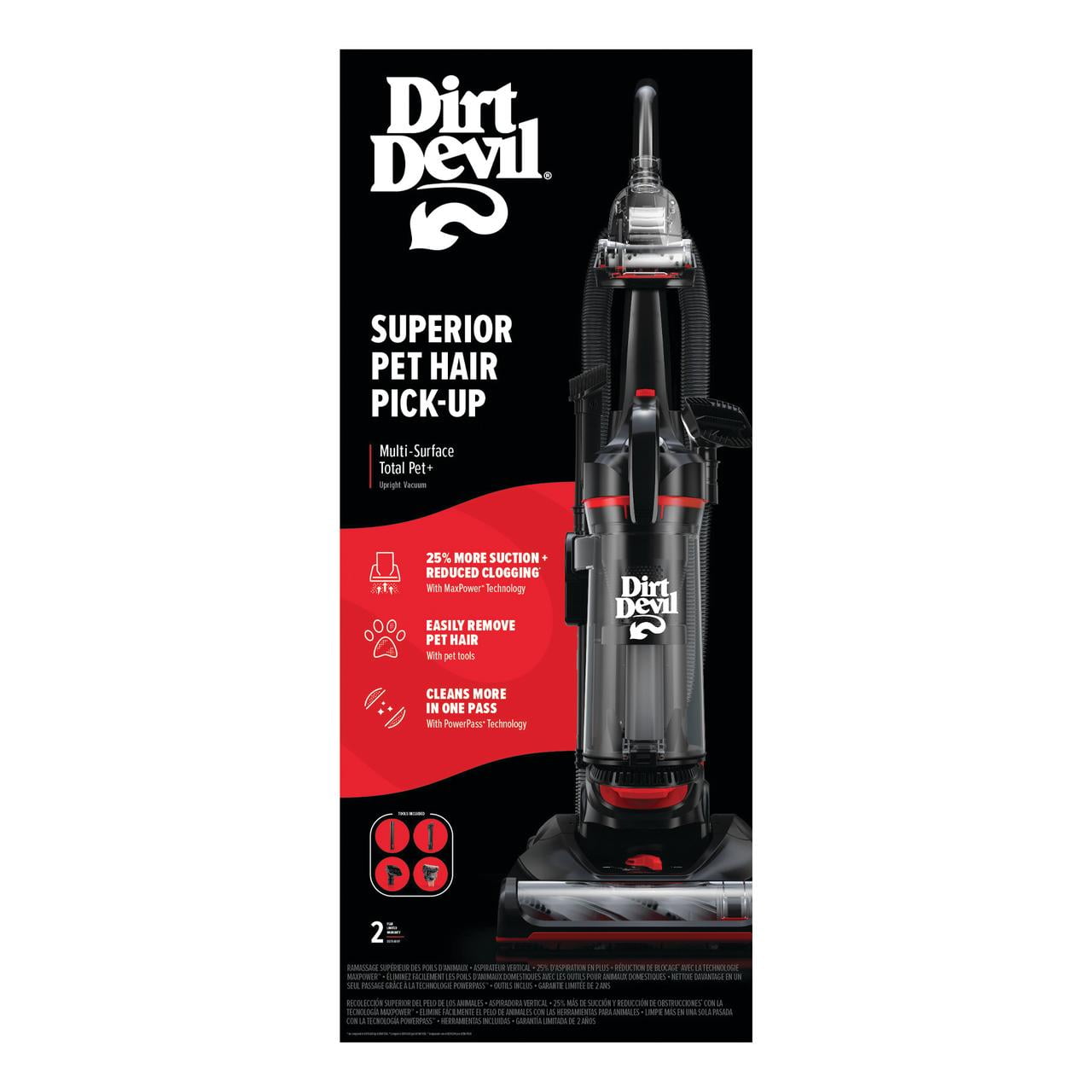 MAXPOWER TECHNOLOGY: Maximum suction power gives you a faster, more efficient clean while preventing potential clogging PET TOOL KIT: Designed to eliminate pet hair throughout your home with versatile tools and extra reach to clean more than just your floors POWERPASS TECHNOLOGY: Reduces your vacuuming time by helping prevent dirt scatter WHAT’S INCLUDED: Dusting Brush & Crevice Tool, Pet Turbo Tool, Extension Wand WARRANTY: 2-Year Limited Warranty Dirt Devil Multi-Surface Total Pet Bagless Upright Vacuum Cleaner, UD76410V, New, 18 lbs