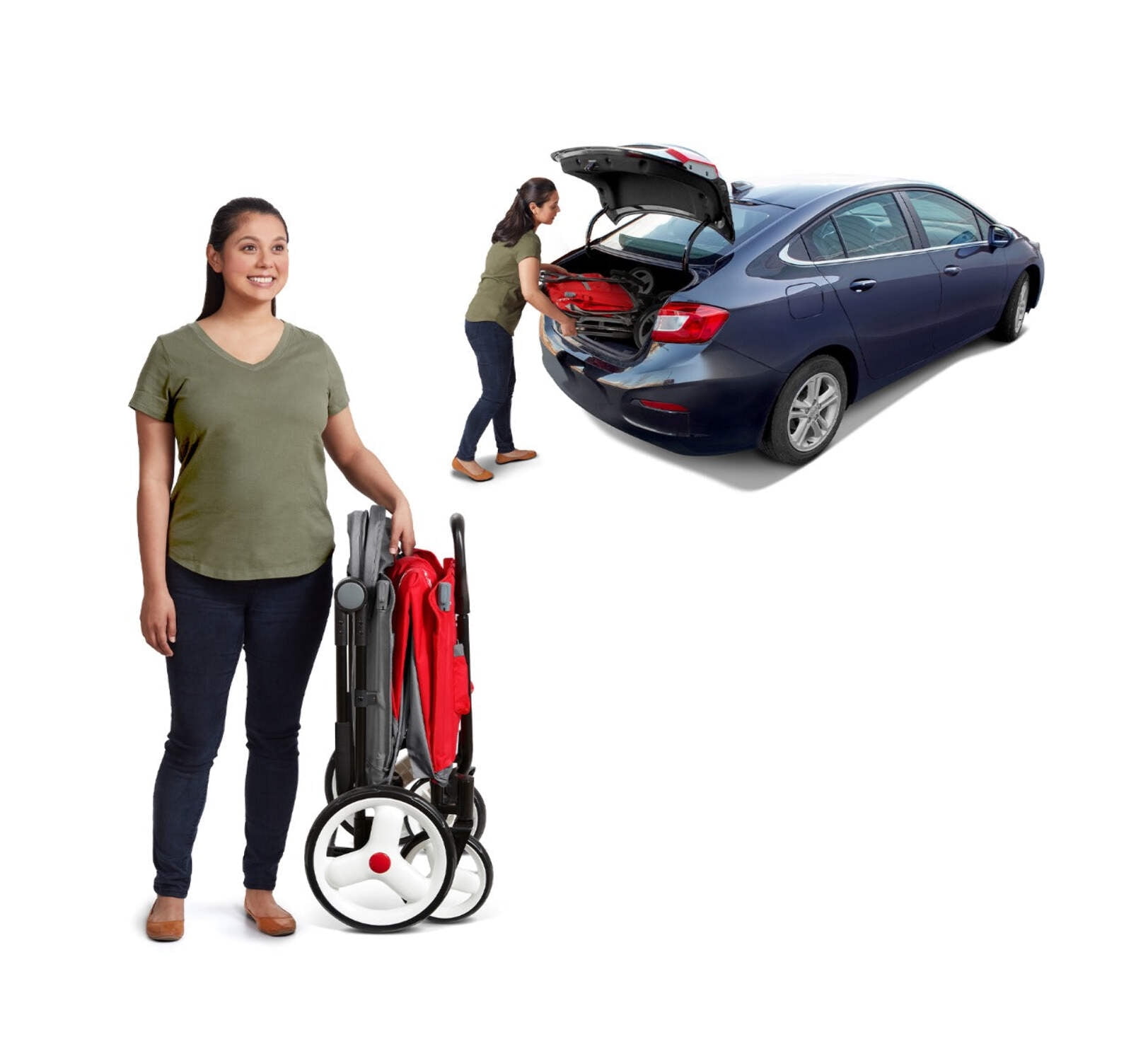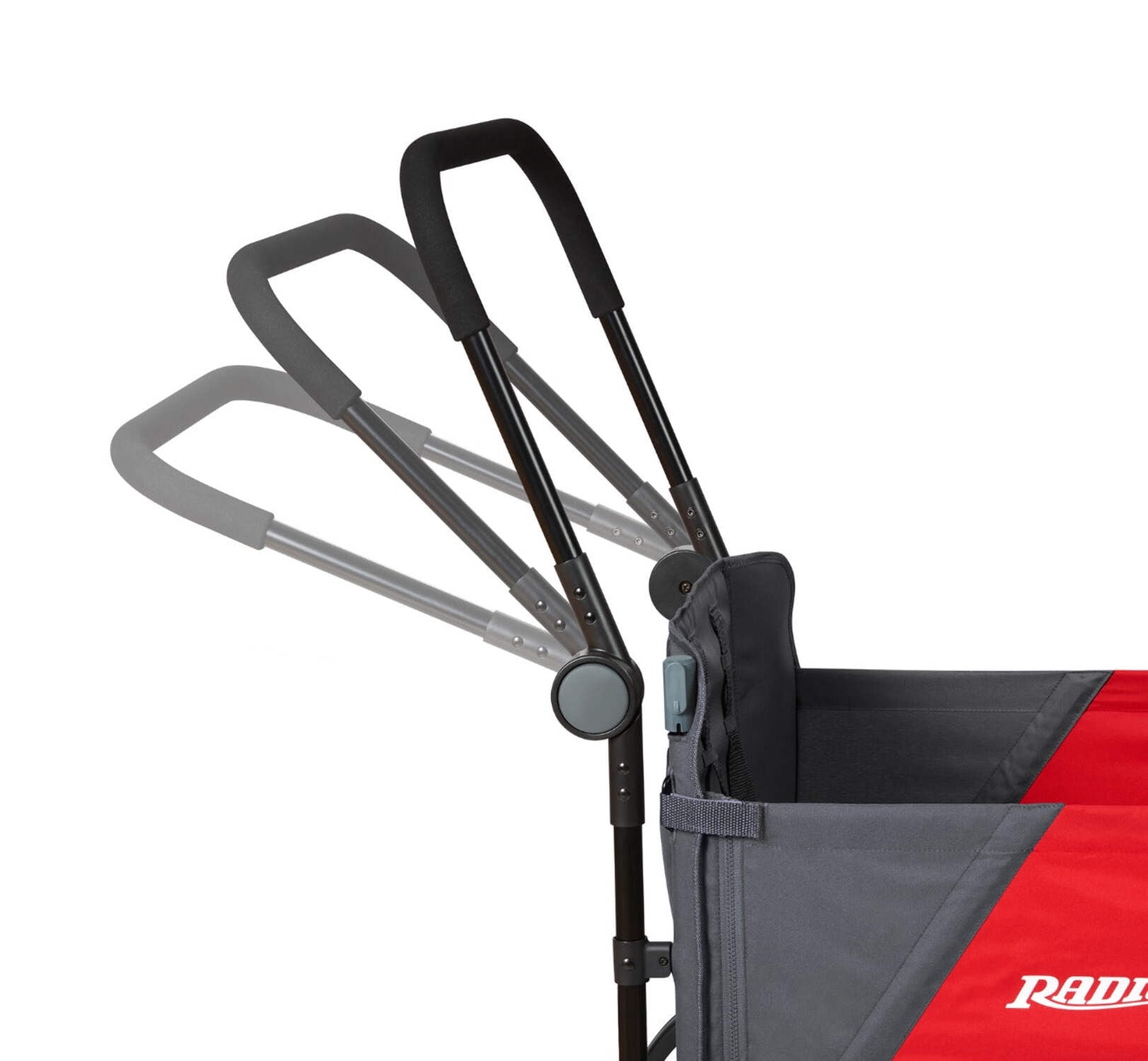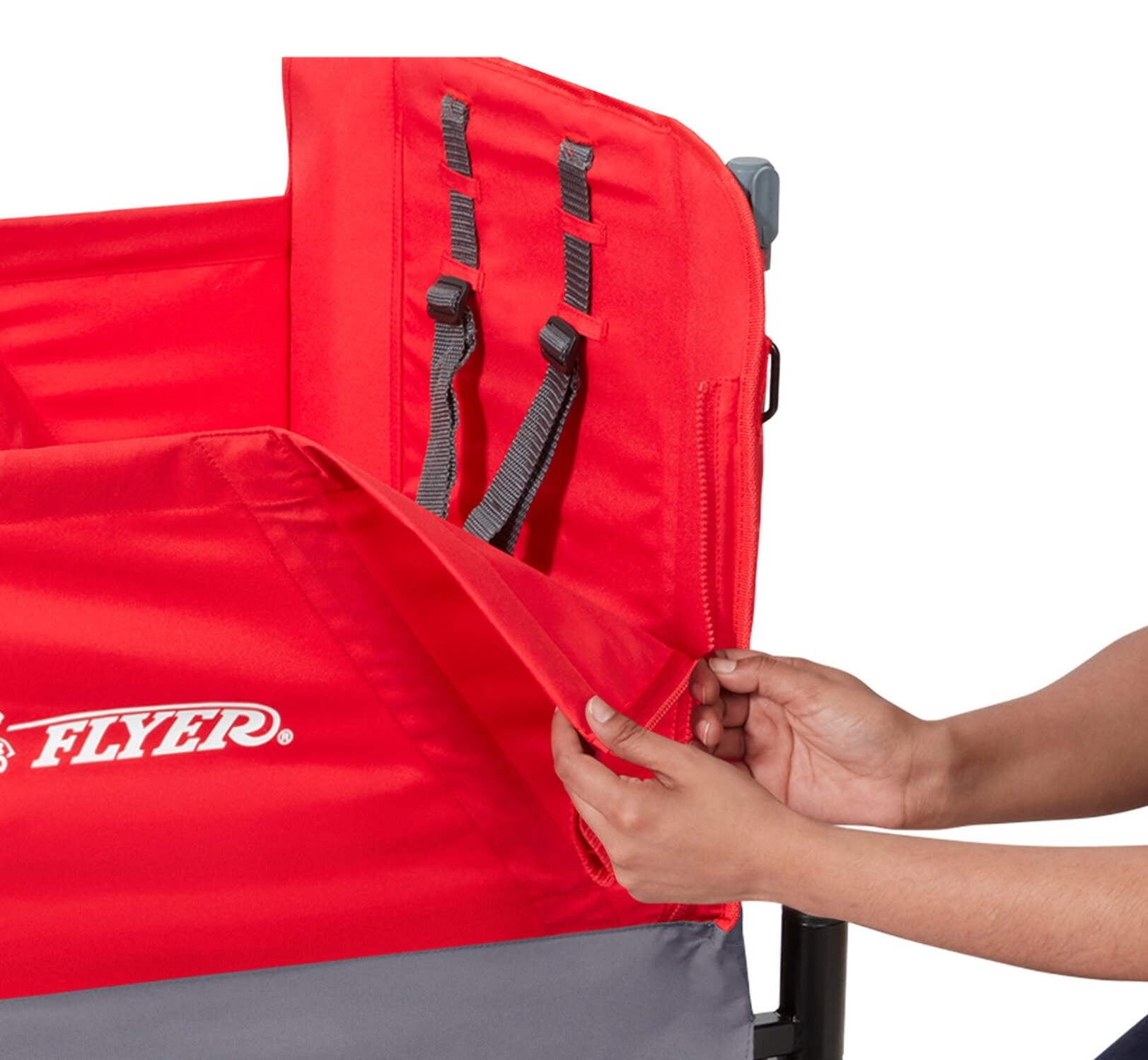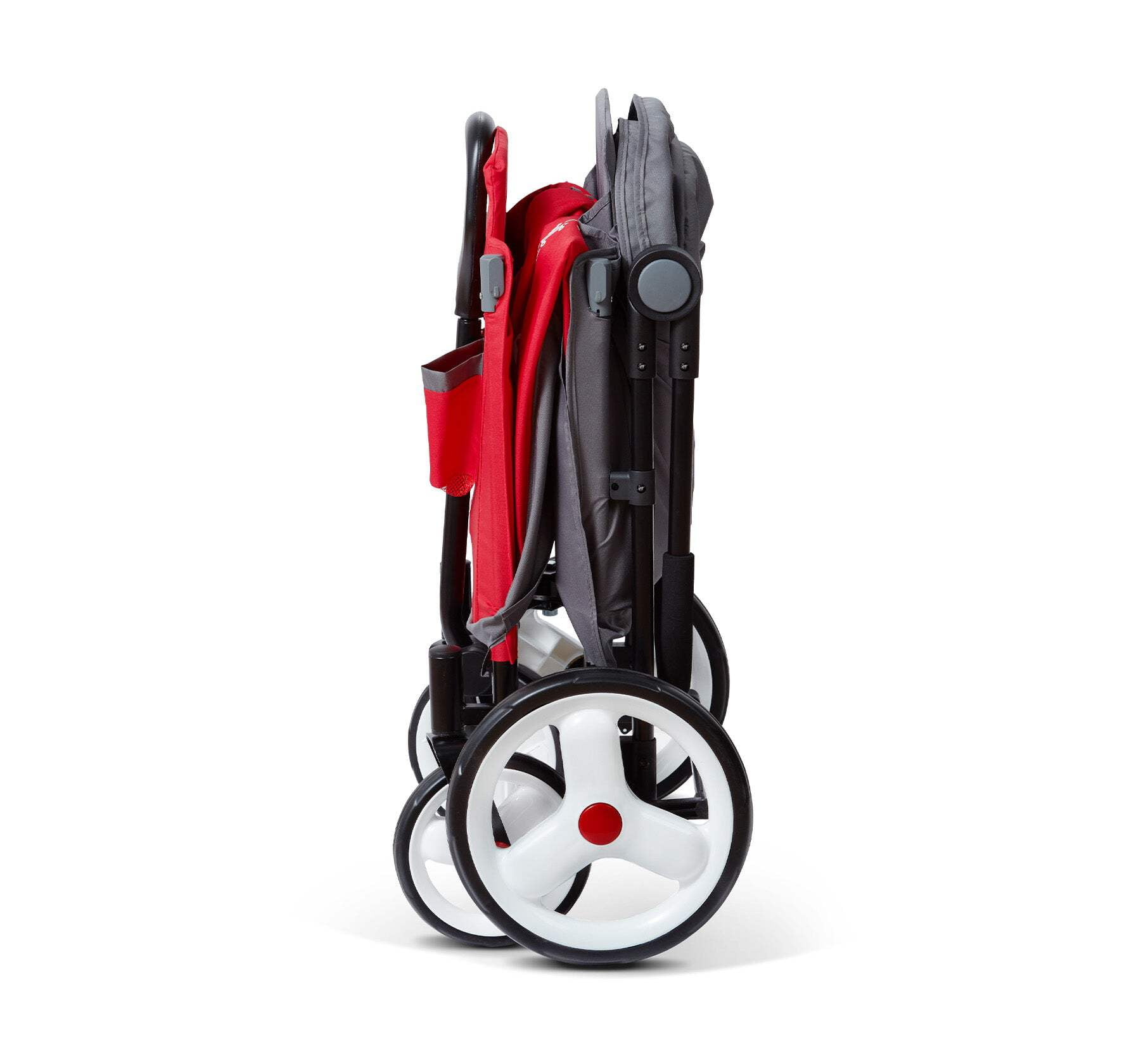 Convenient push or pull steering One hand fold; folds flat for easy storage 5-point safety harnesses and rear brake to keep your child safe Two adjustable UV protection canopies, one peek-a-boo window Front caster wheels for nimble steering and large, 12” easy push rear wheels Rear brake for safety Two front cupholders Never Fall™ handle stays upright when not in use Recommended for kids 1 year and up Maximum weight capacity 120 lbs. Assembled dimensions with push handle: 51″ L x 19″ W x 11″ H Red wagon body dimensions: 33″ L x 19″W x 11″ H Interior dimensions: 31″ L x 19 W x 11″H Assembled weight: 31.53 lbs. If you have any questions regarding your product, please contact Radio Flyer Customer Service